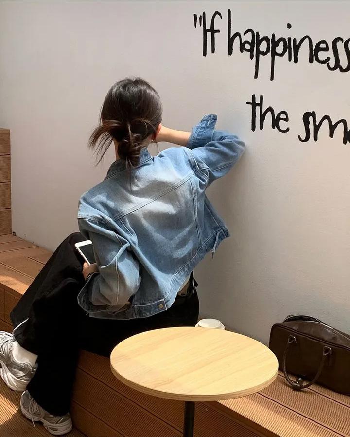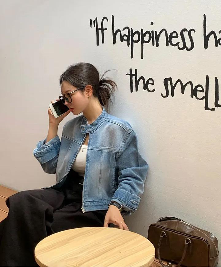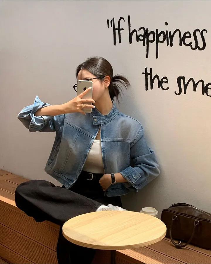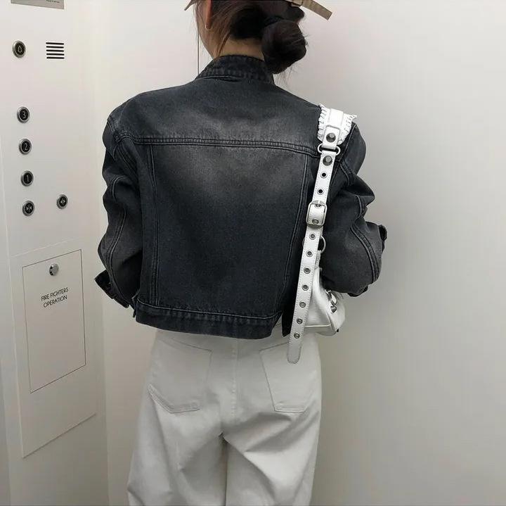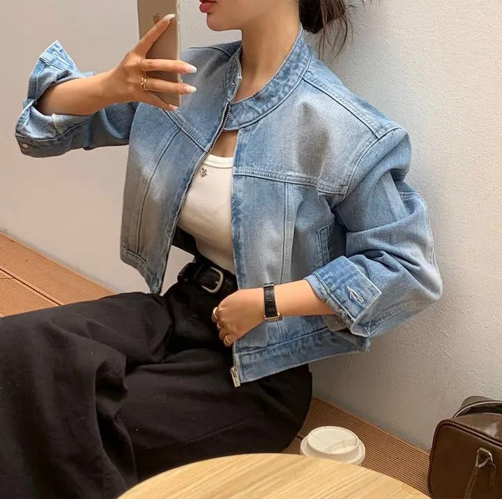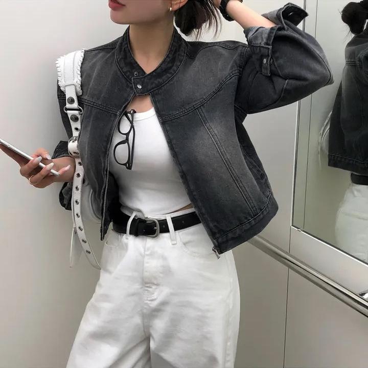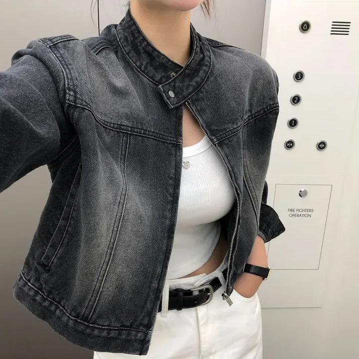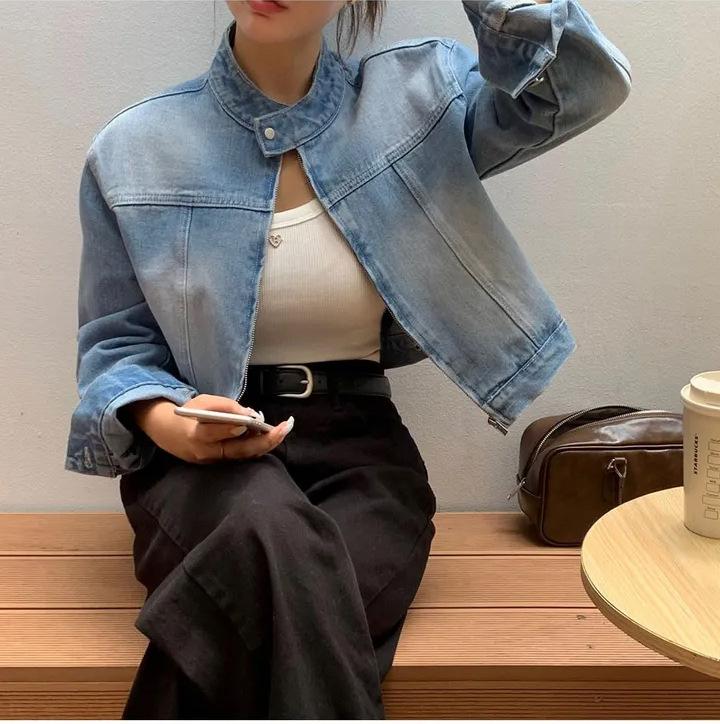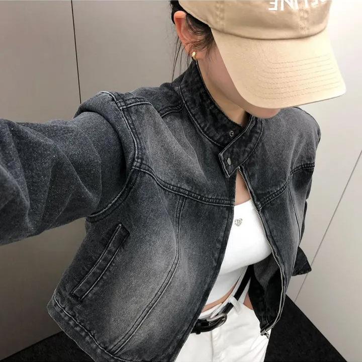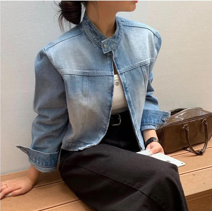 Ins Coreano Otoño Nuevo Estilo Coreano Moda Elegante Cuello Alto Chaqueta Corta de Mezclilla Lavada para Mujer Chaqueta Versátil