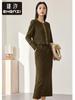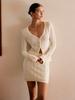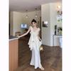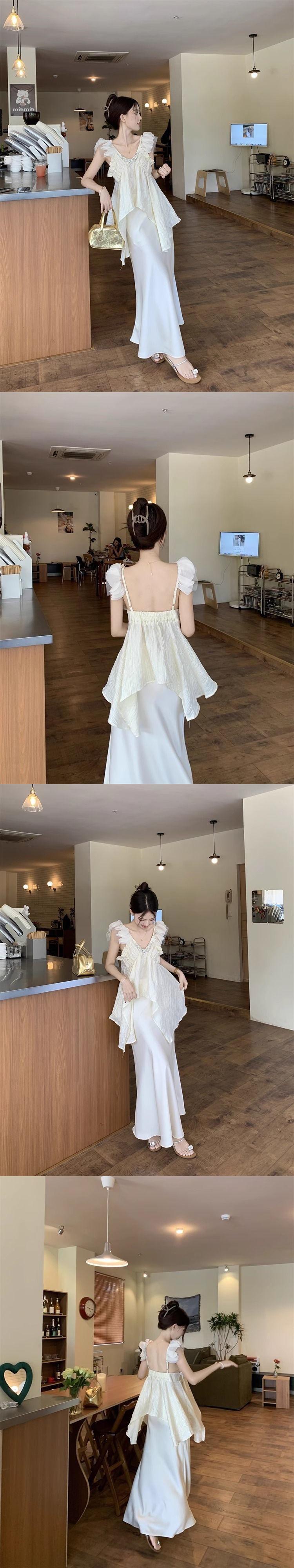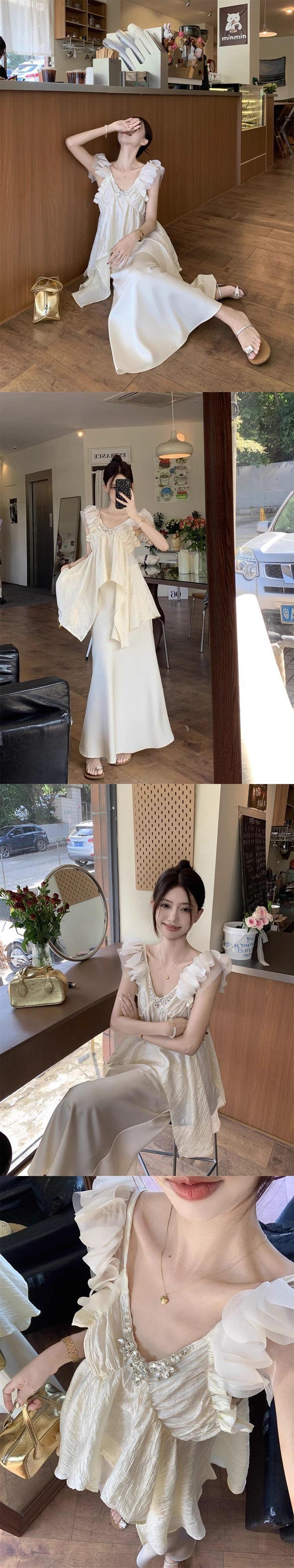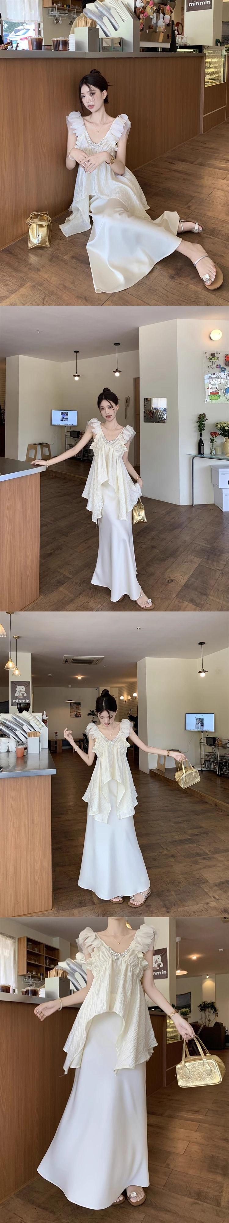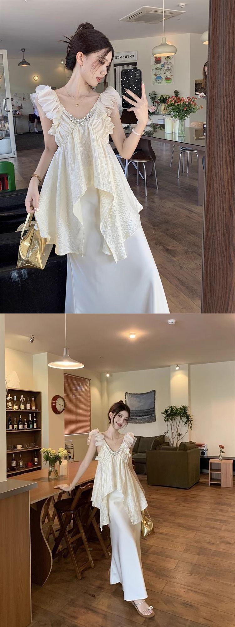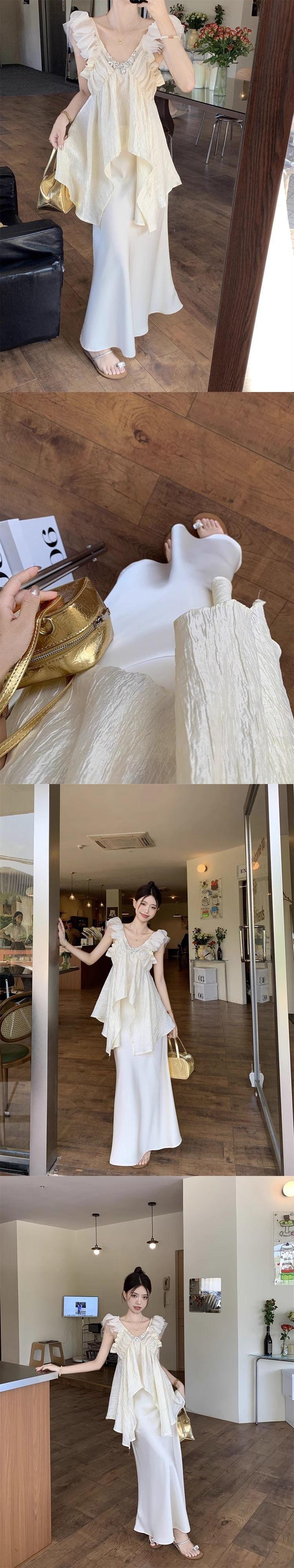 Traje de moda Pure Desire Heavy Industry con camisa asimétrica con volantes y escote en V de diamante caliente, falda de satén de cintura alta y longitud media.