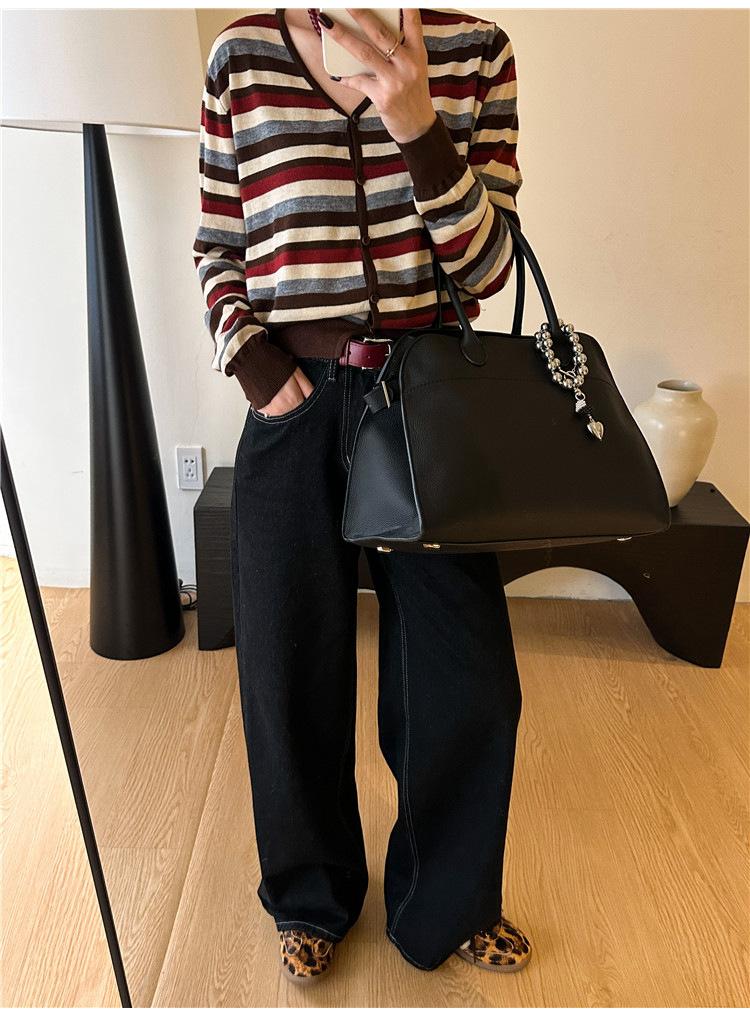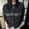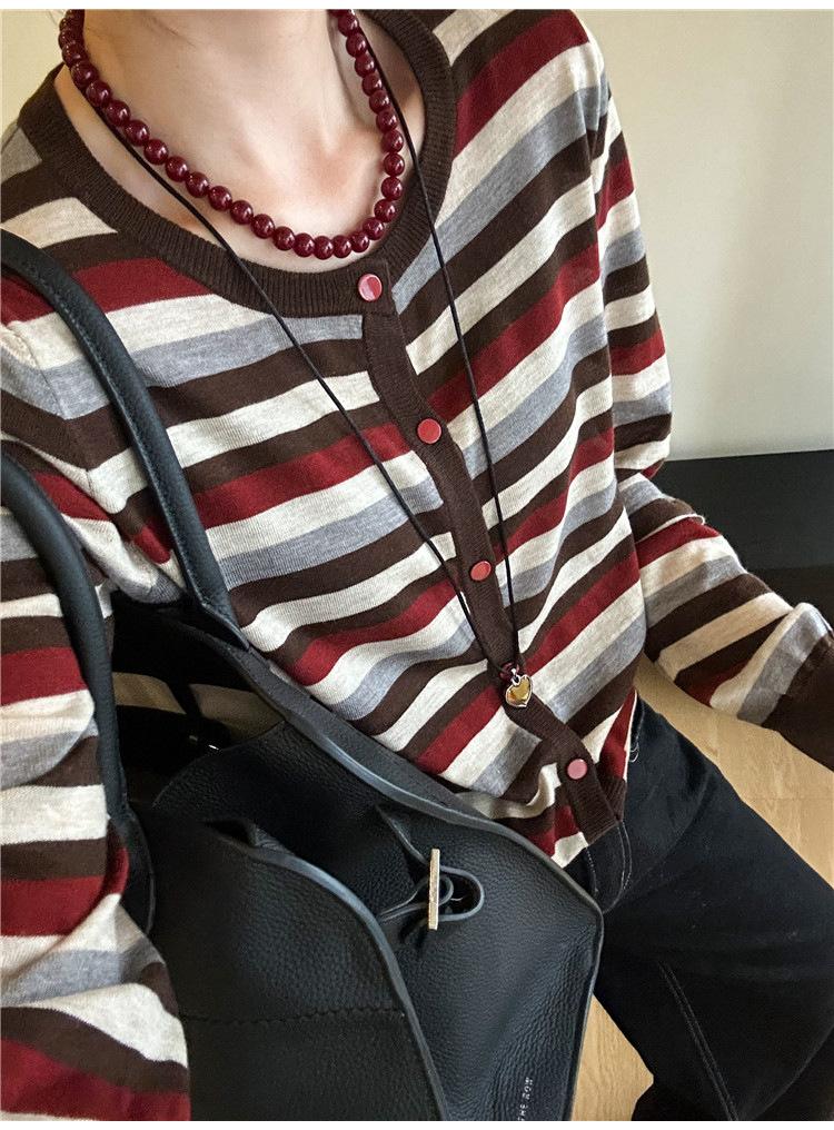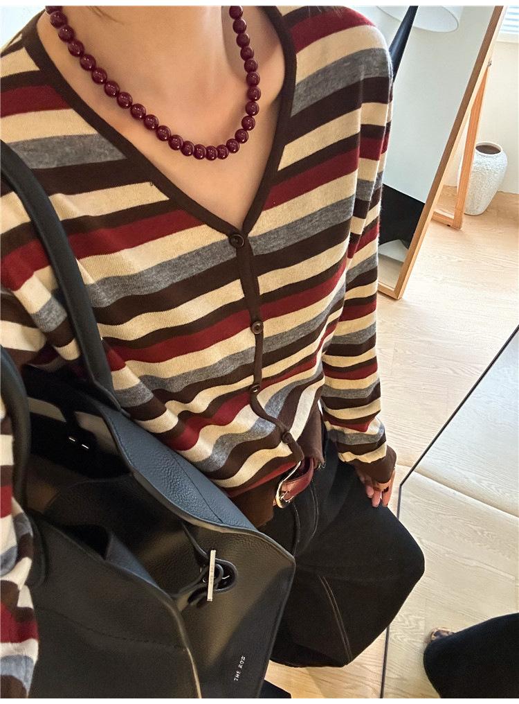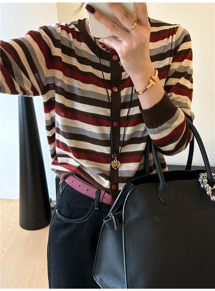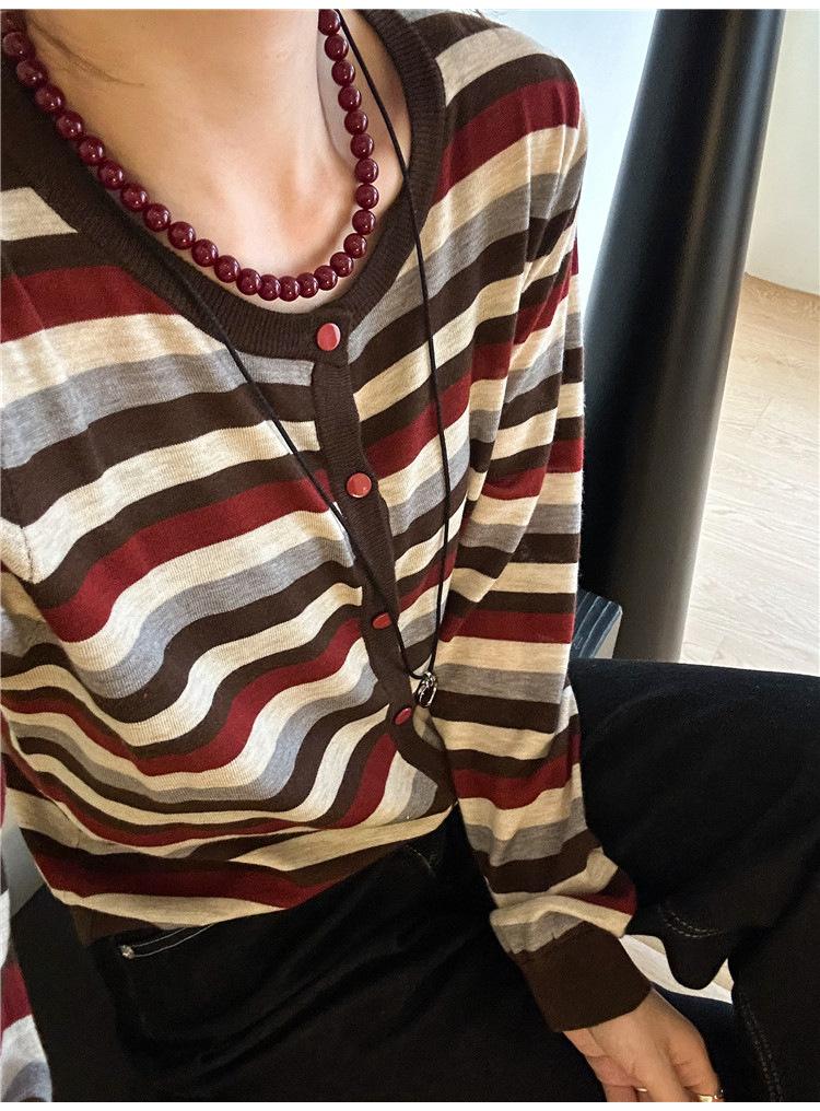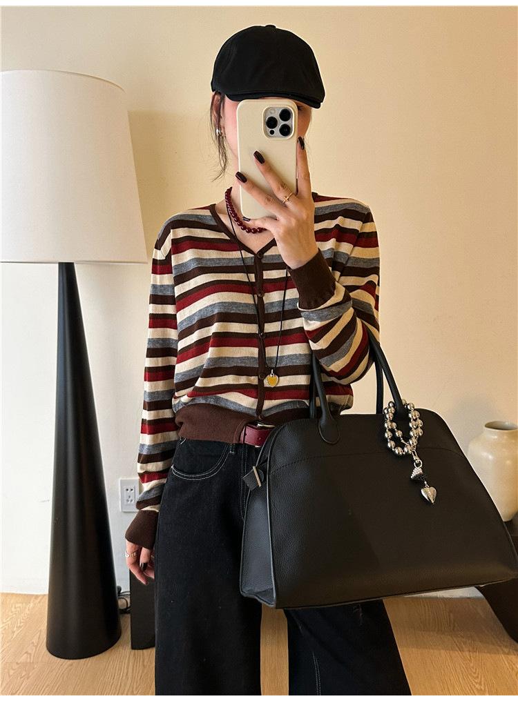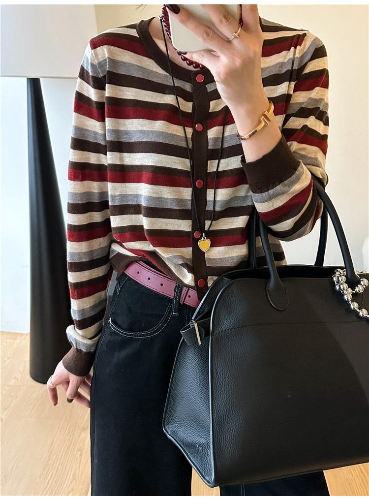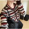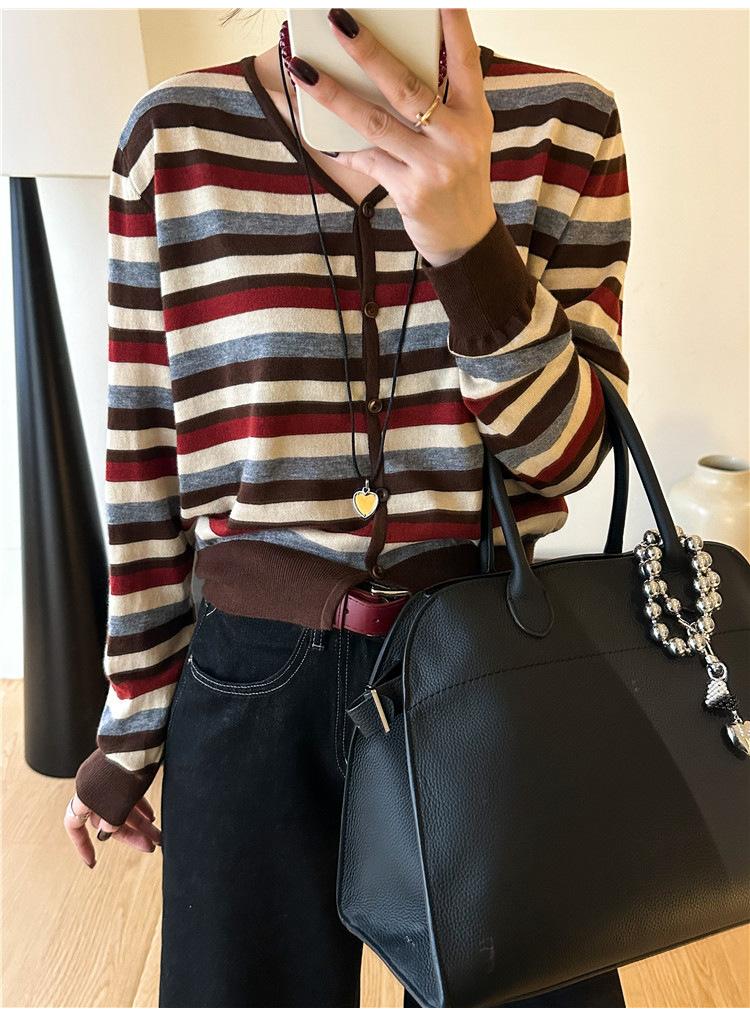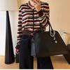 Cárdigan de punto de lana a rayas de color contrastante para mujer estación europea 2024 principios de otoño nuevo productos europeos ropa de mujer camisa delgada para llevar debajo tendencia