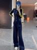 Traje deportivo europeo de ocio para mujer, diseño de otoño, top azul de manga larga, abrigo, pantalones de pierna ancha, conjunto de dos piezas