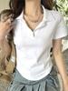 Camiseta blanca de manga corta con cuello polo para mujer, diseño de cuello en V de verano, corte entallado, estilo moderno y atractivo.