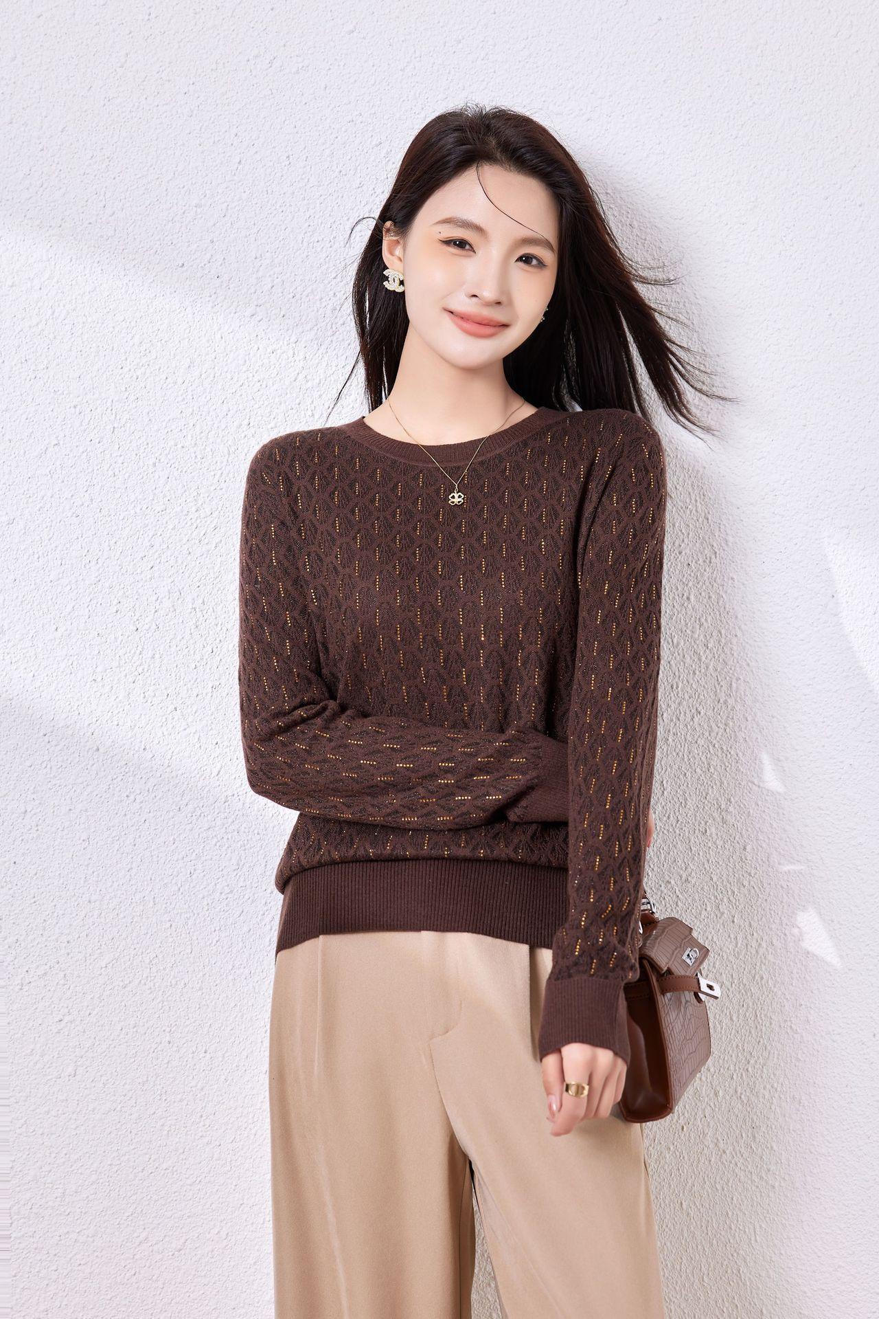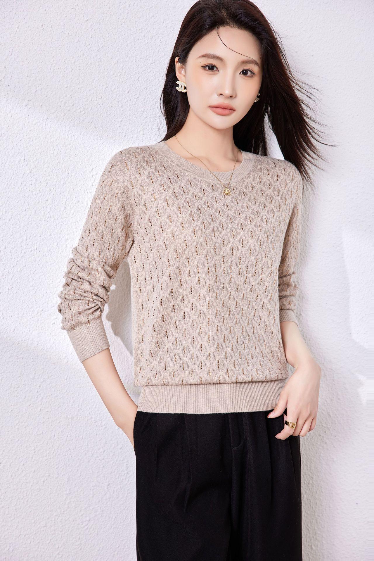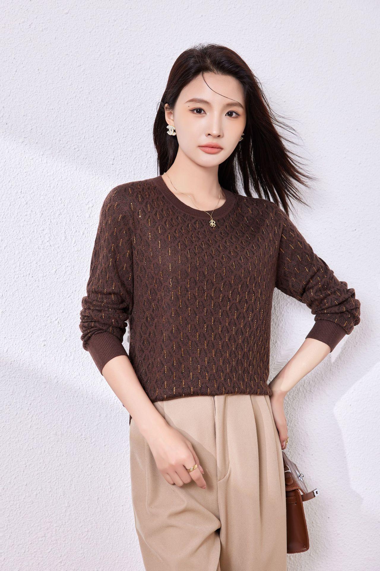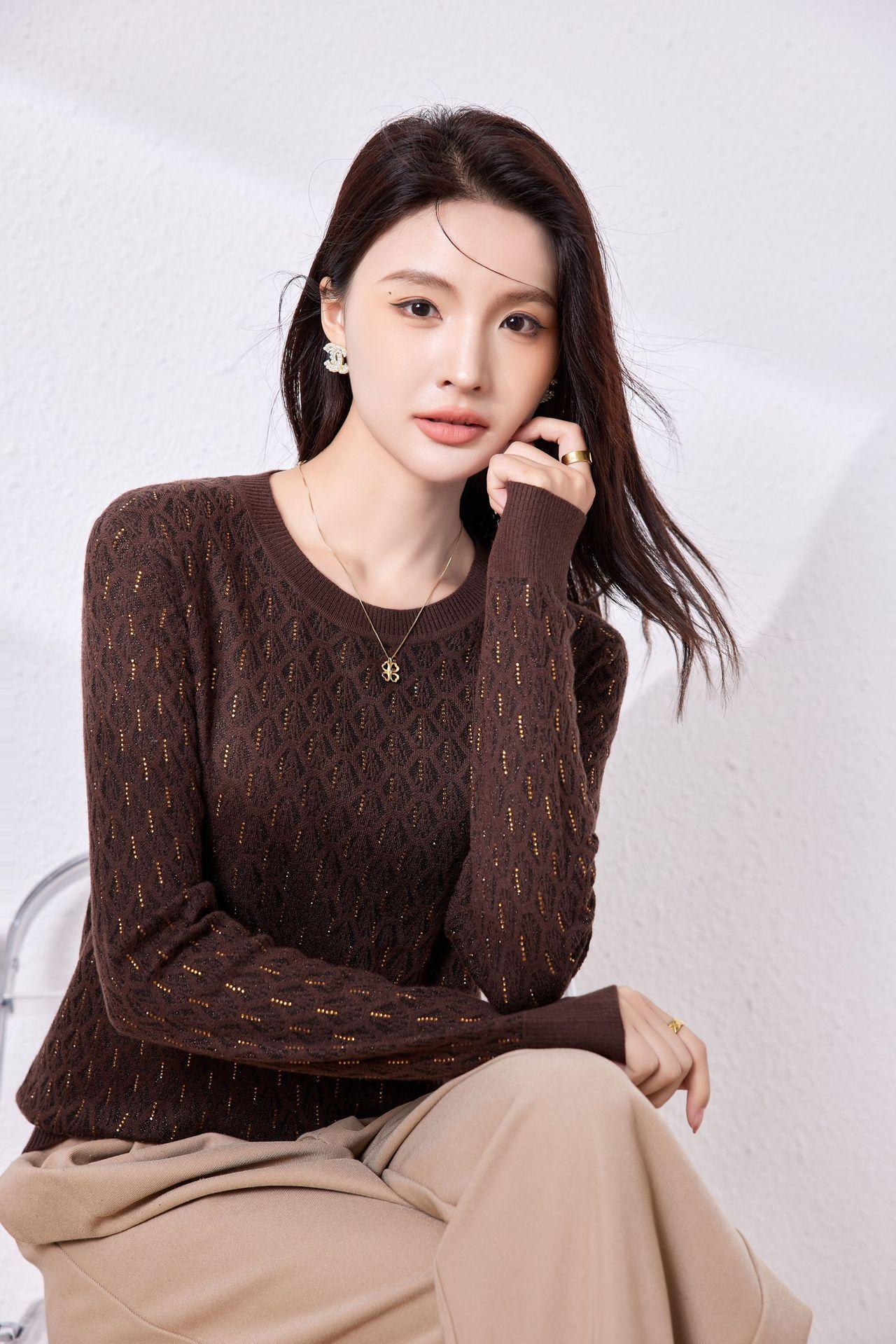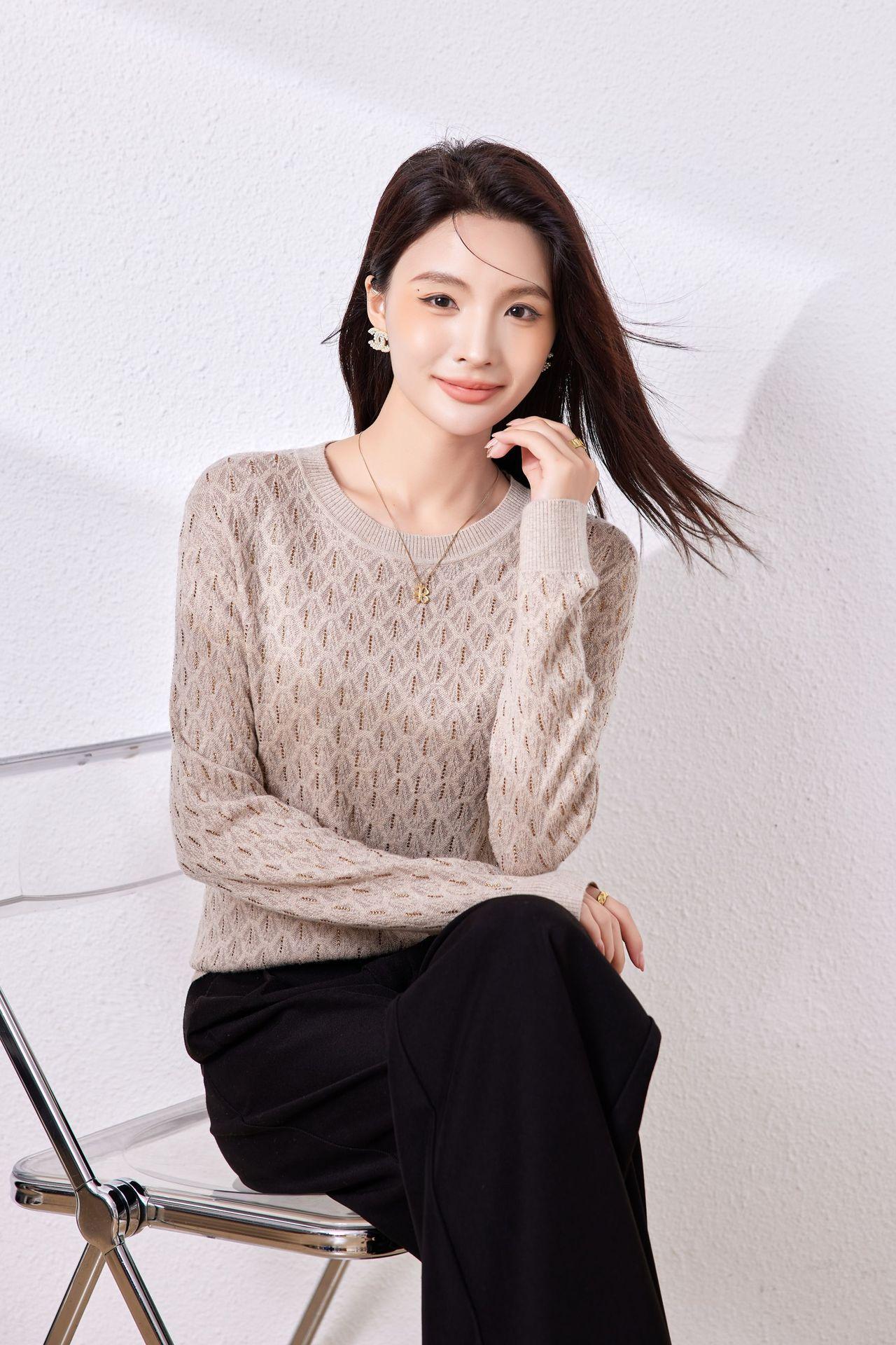 Suéter de punto suave y agradable para la piel con cuello redondo de mezcla de seda y lana para mujer, nuevo estilo de otoño 2025, suéter tipo jersey ajustado