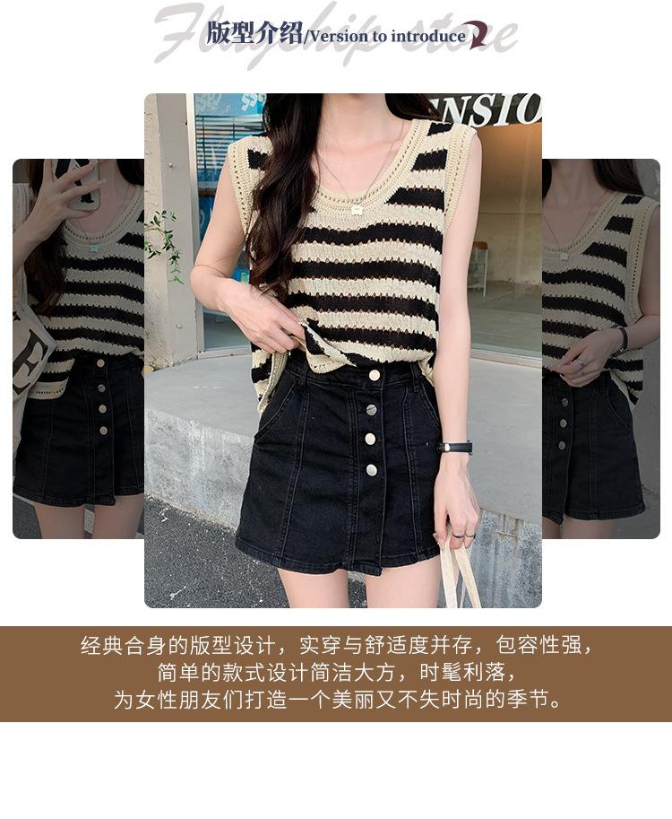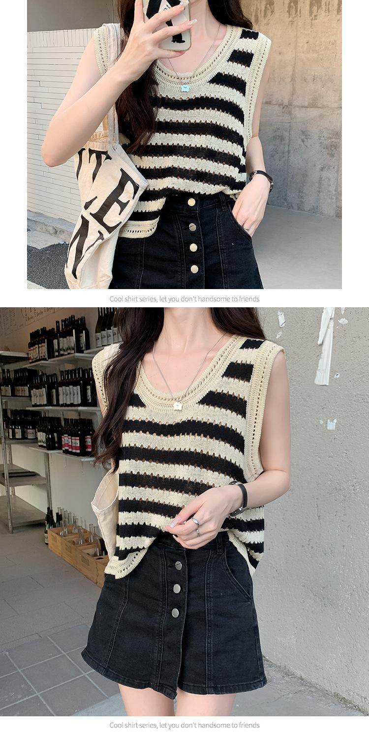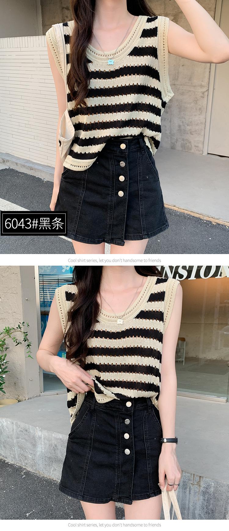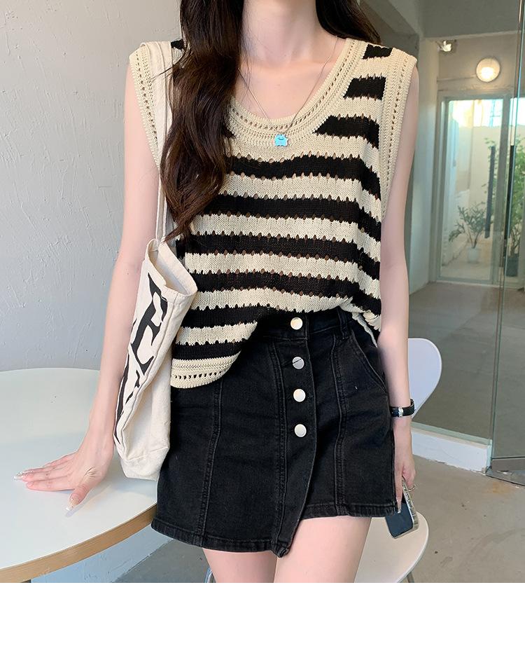 Camisola de punto de seda de hielo para mujer, ropa interior y exterior de verano, suelta, estilo coreano, a rayas, combina con todo, sin mangas, camiseta superior
