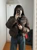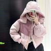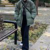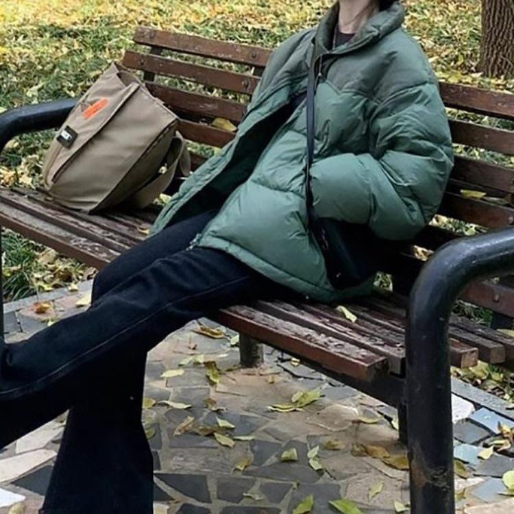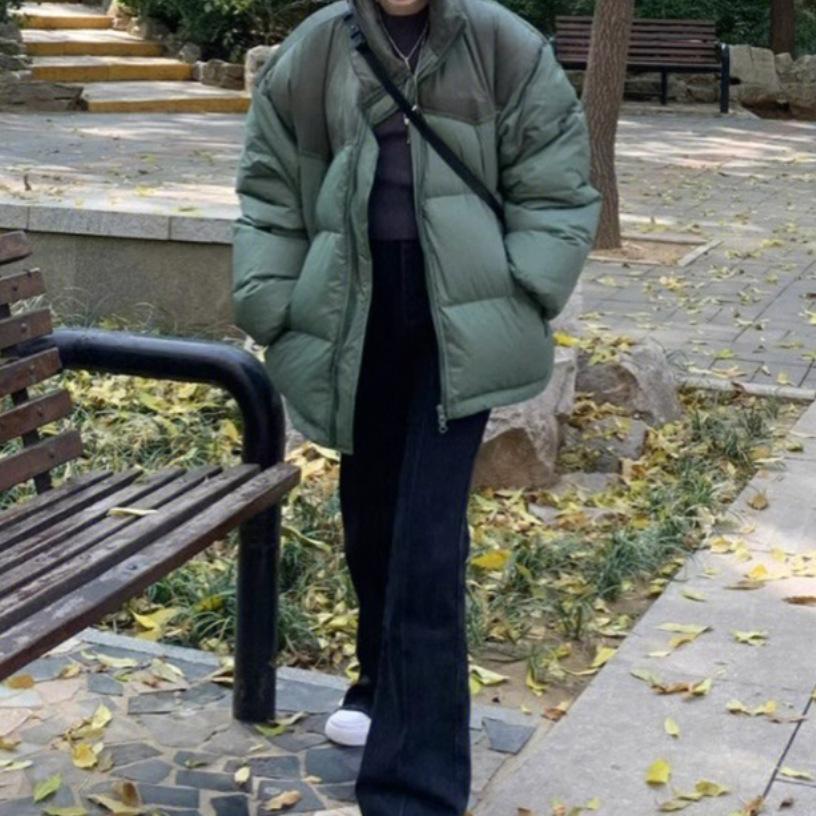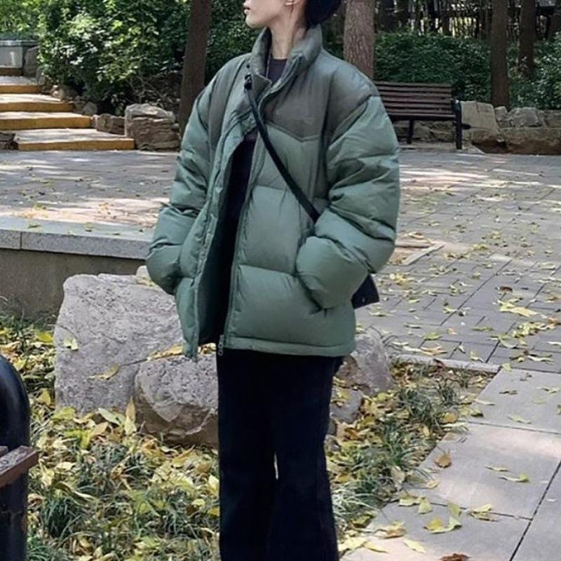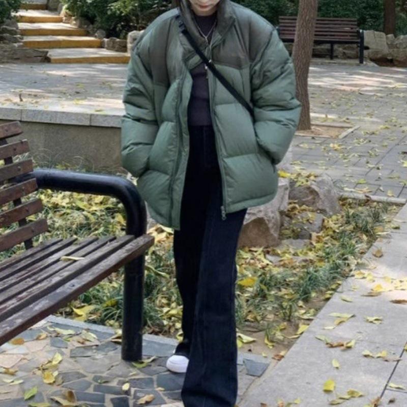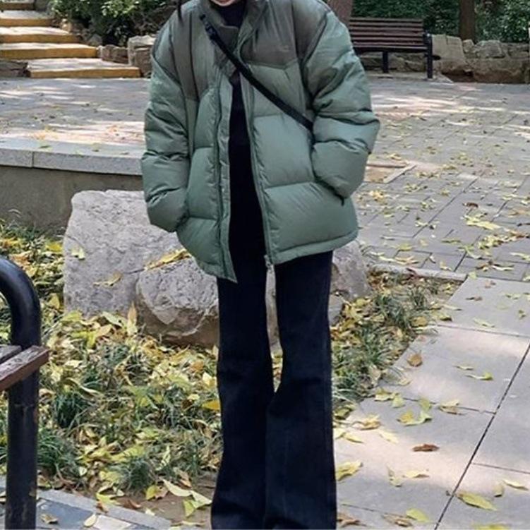 Chaqueta de Algodón Patchwork de Estilo Americano de Alta Gama Verde con Cuello Alto para Mujer, Nuevo Abrigo Acolchado Grueso de Otoño e Invierno 2025