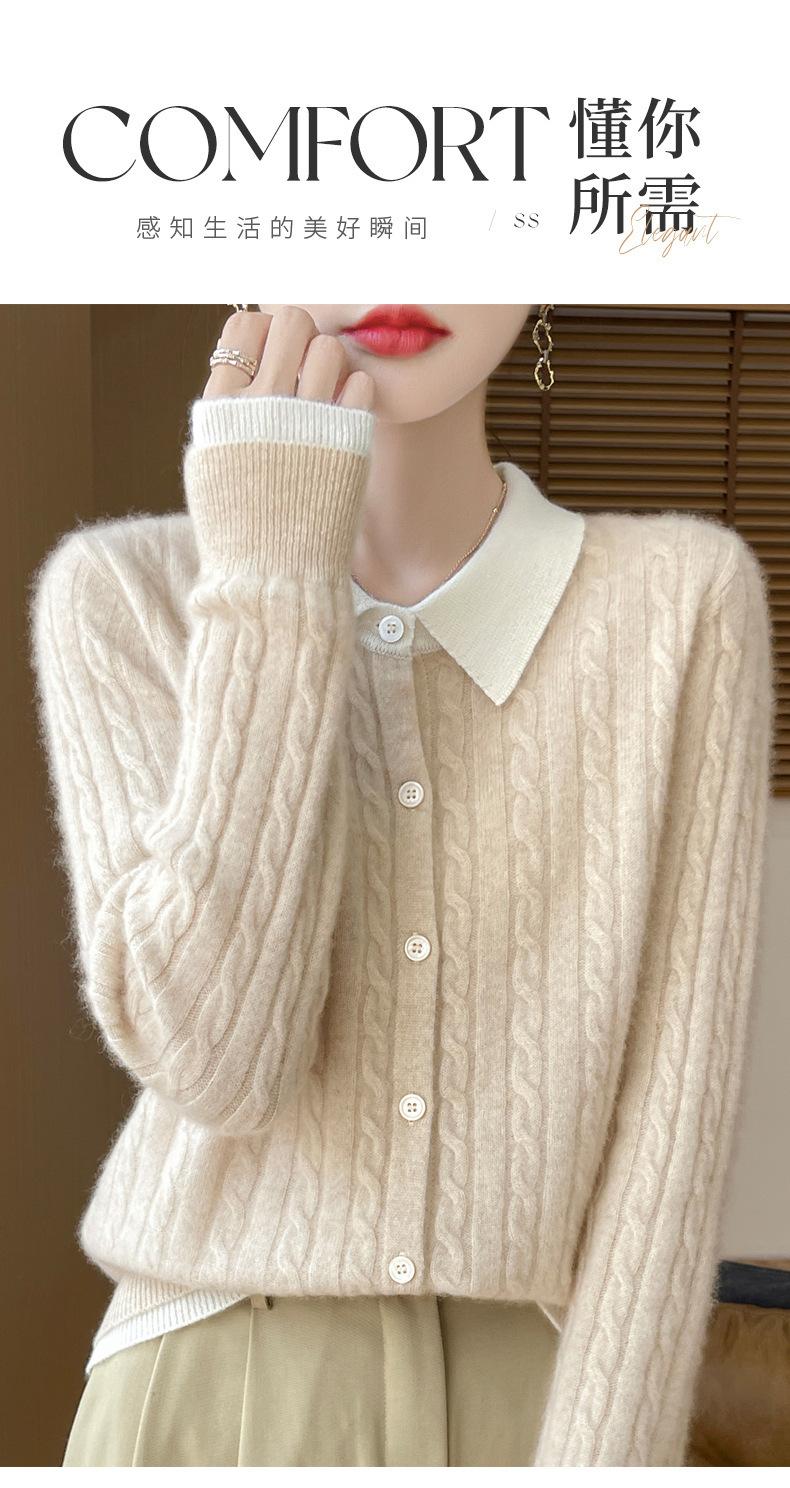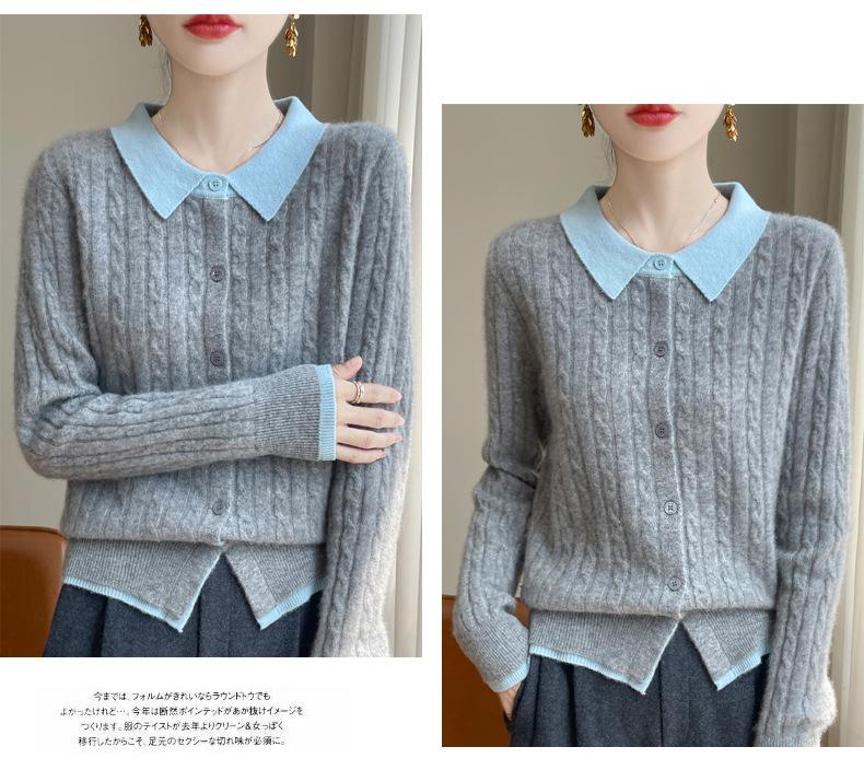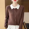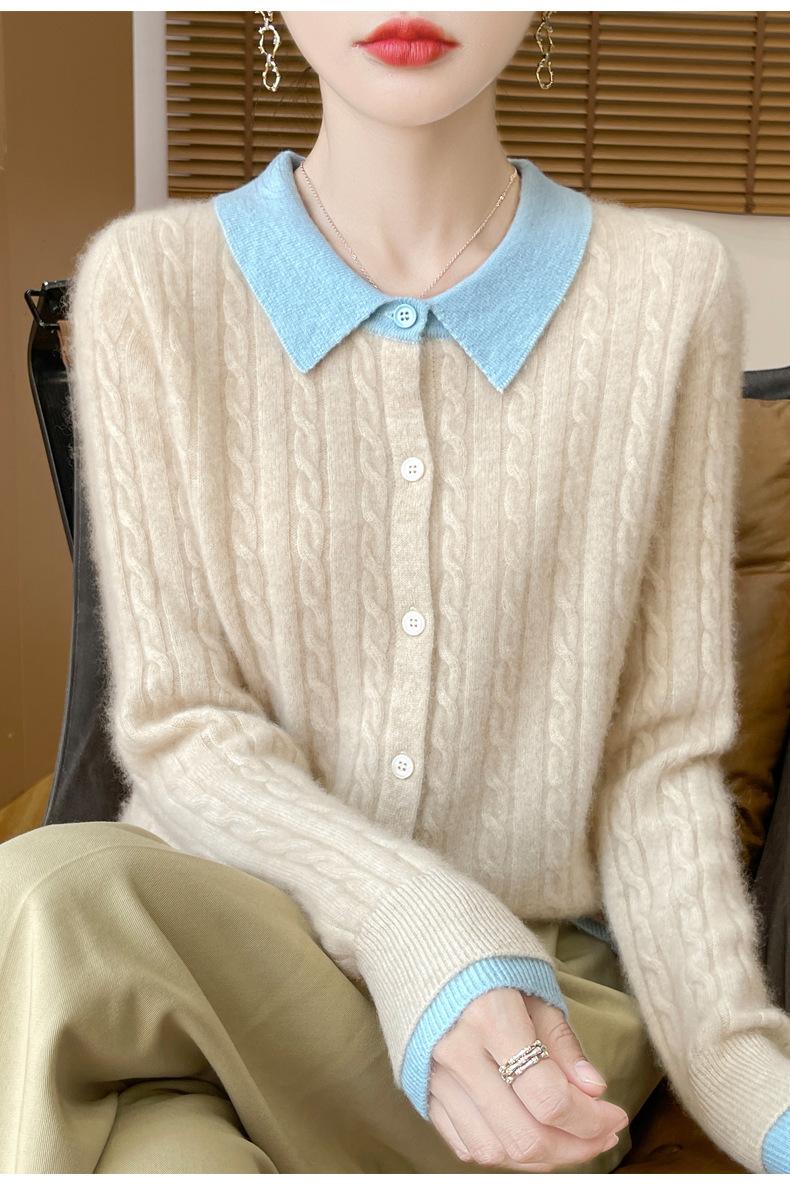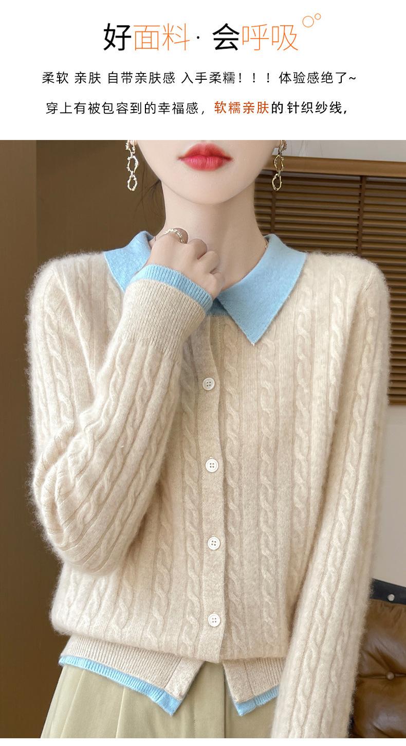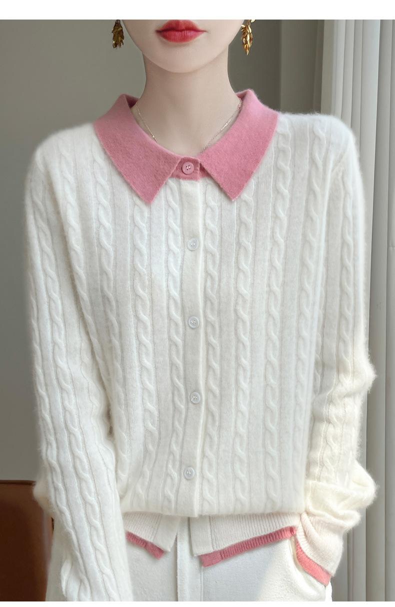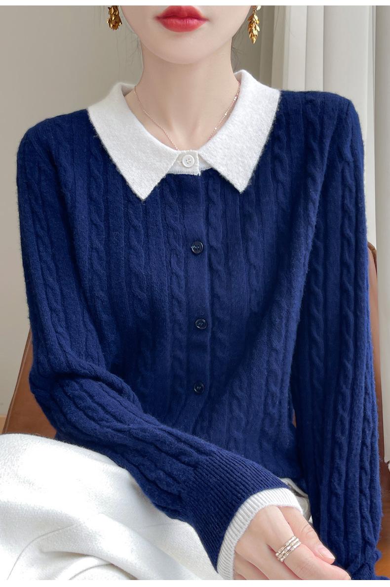 Cárdigan de Punto de Contraste de Color con Cuello POLO de Giro Retro Francés para Mujer, Abrigo Corto, Suéter, Top Apilado de Otoño e Invierno