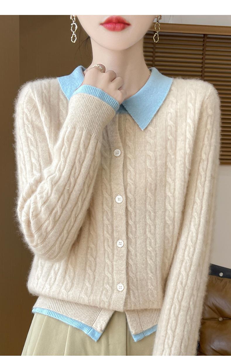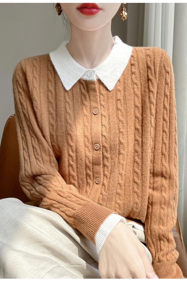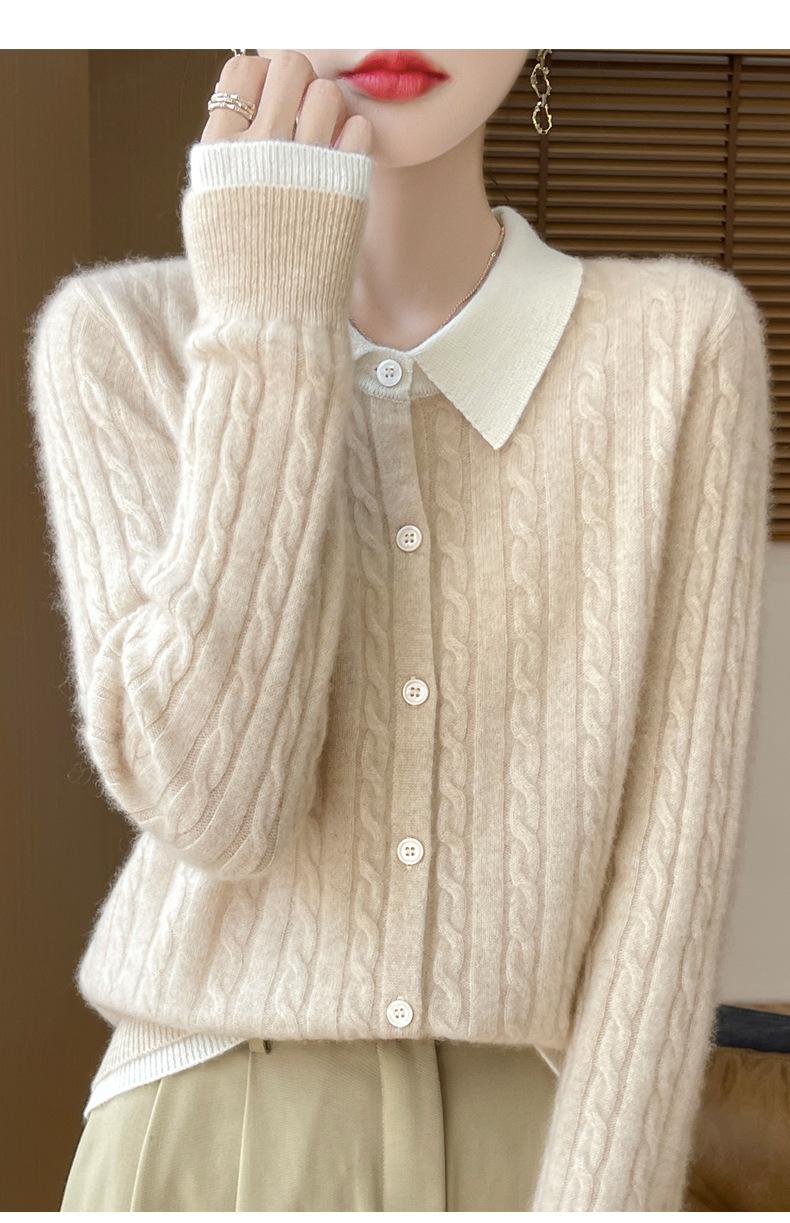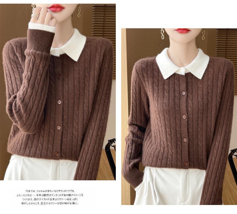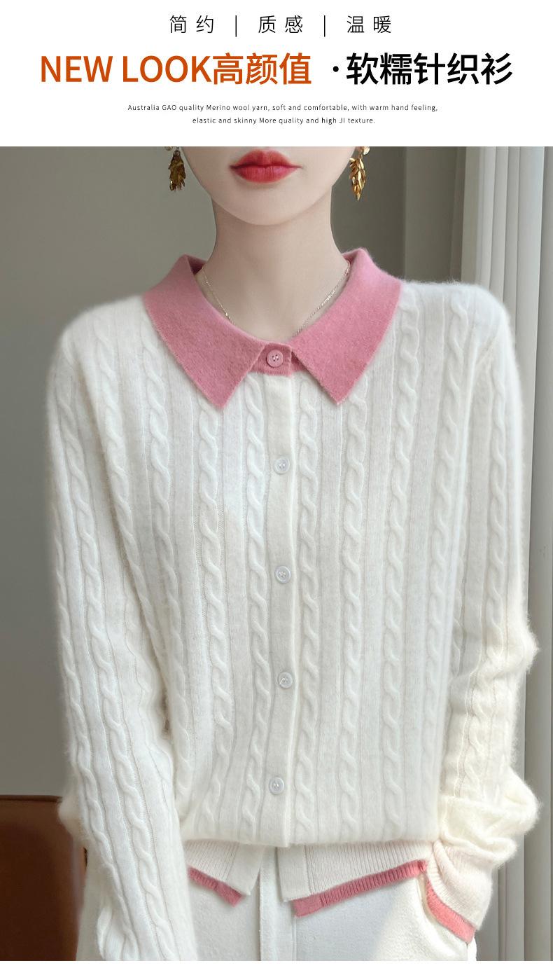 Cárdigan de Punto de Contraste de Color con Cuello POLO de Giro Retro Francés para Mujer, Abrigo Corto, Suéter, Top Apilado de Otoño e Invierno