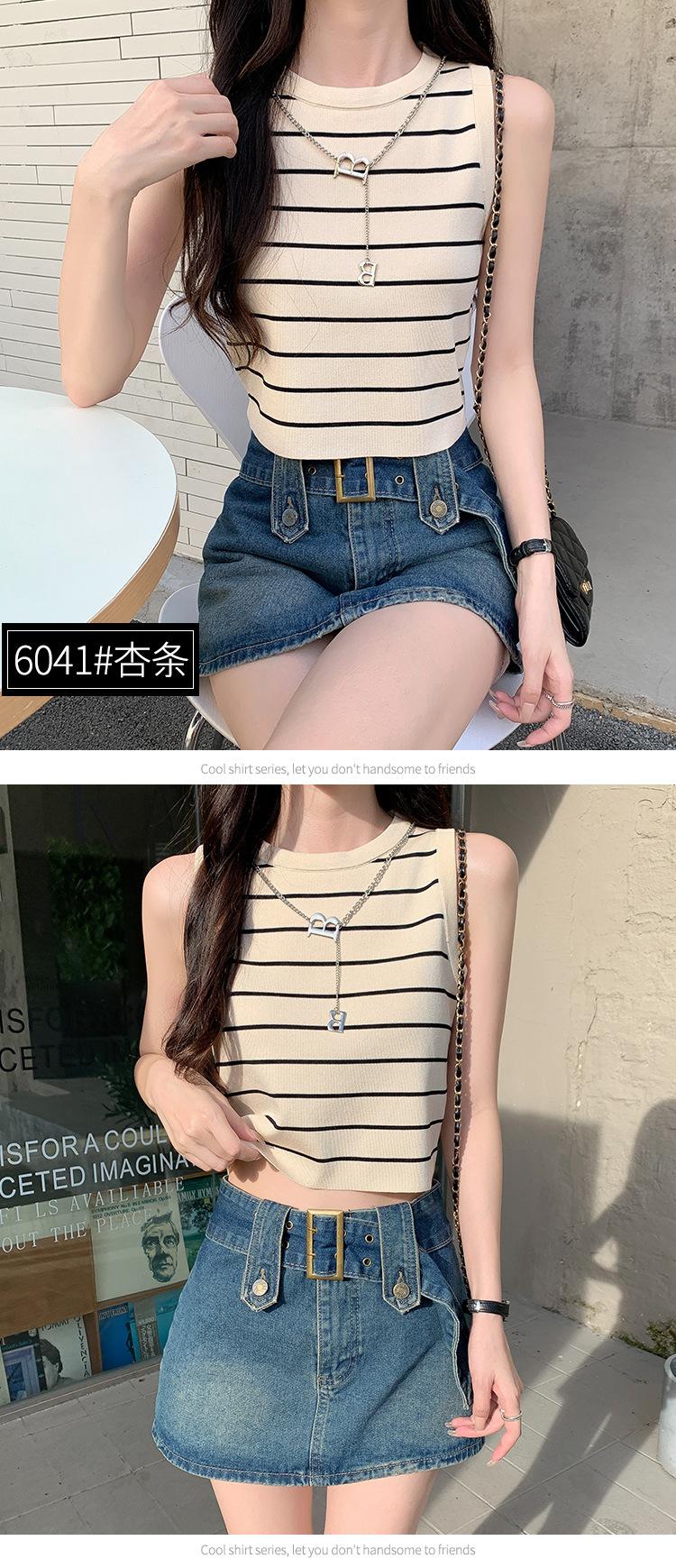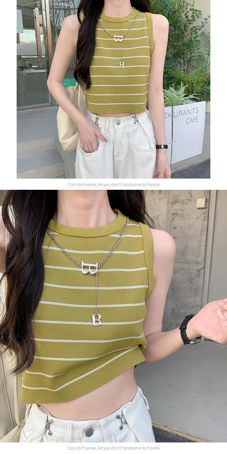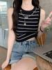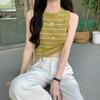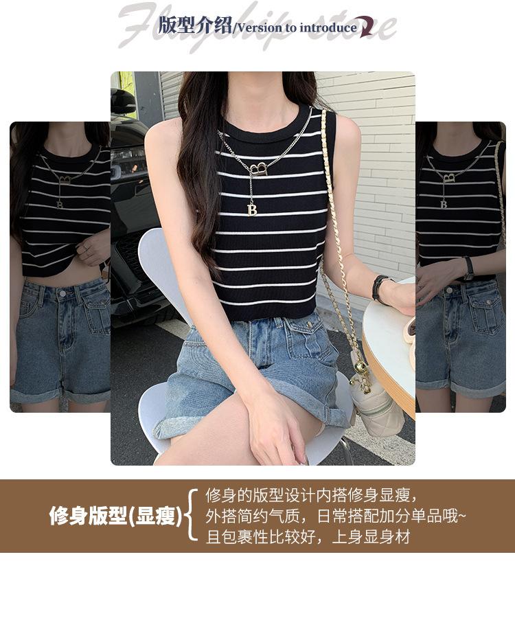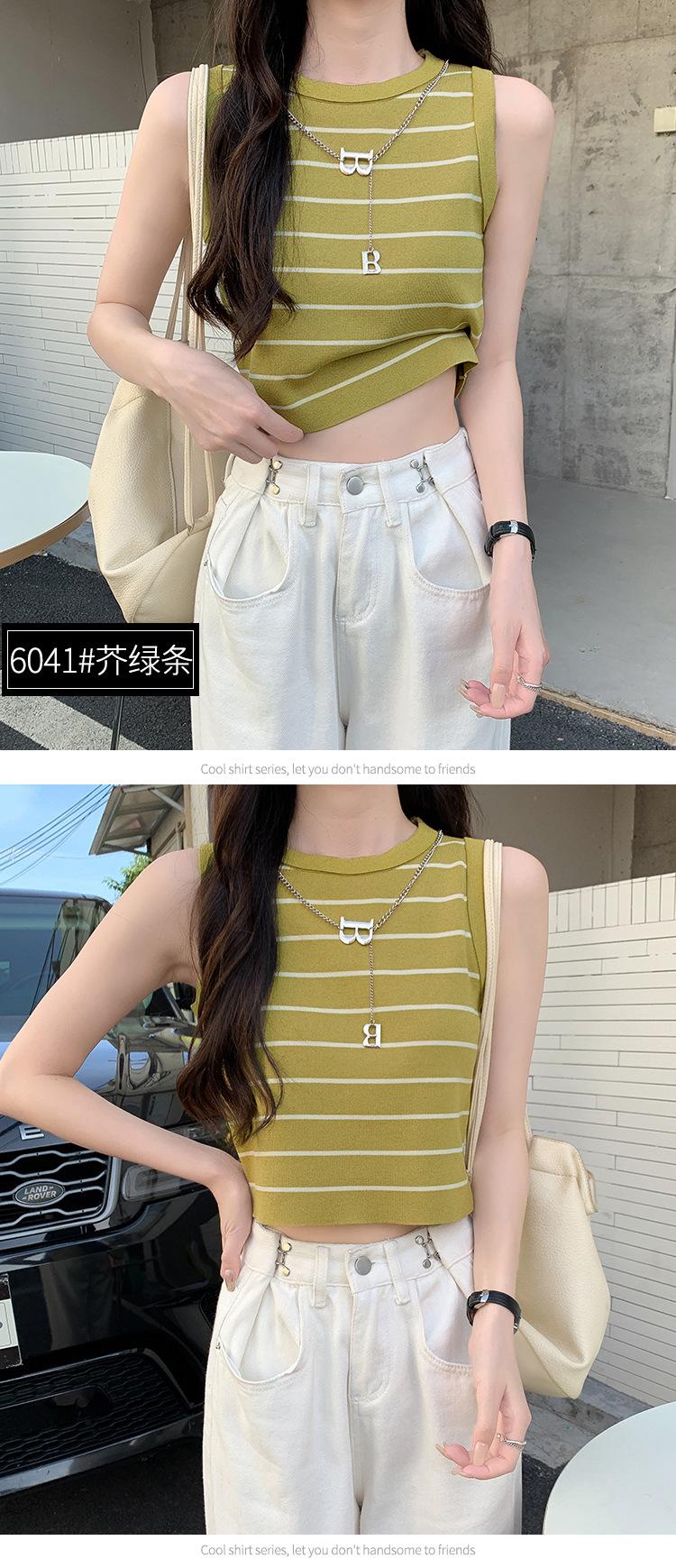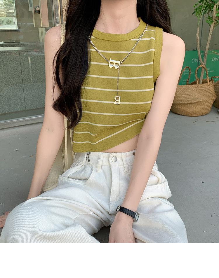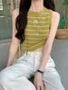 Camisola de punto de seda helada a rayas para llevar en capas, Diseño de verano, Estilo nicho, Versátil, Cintura alta, Corta, Sin mangas