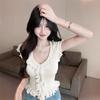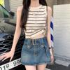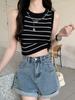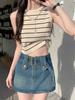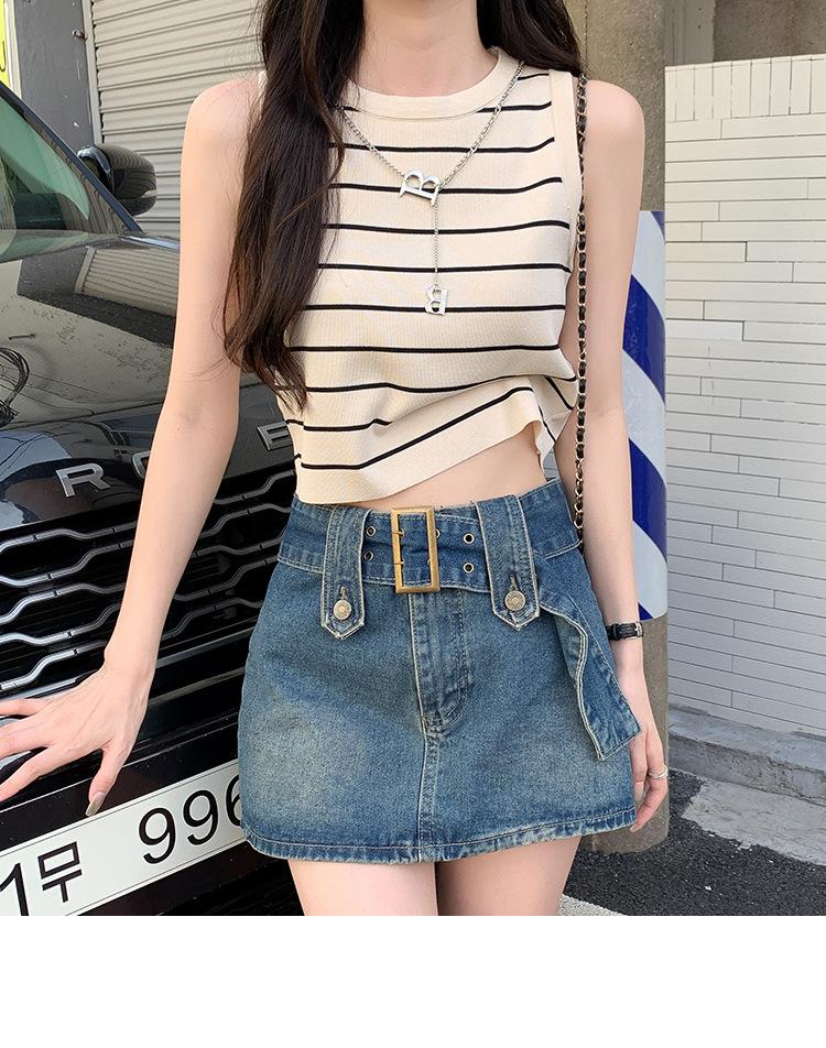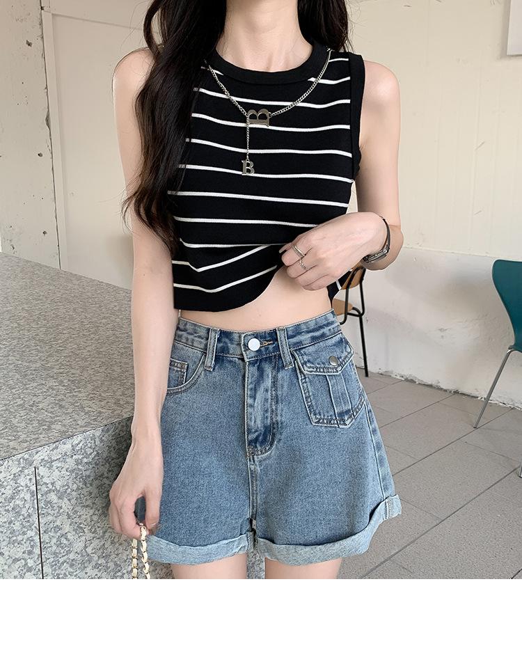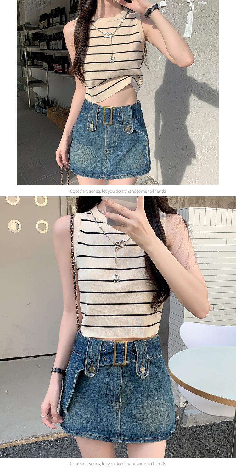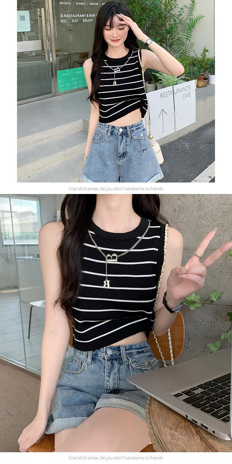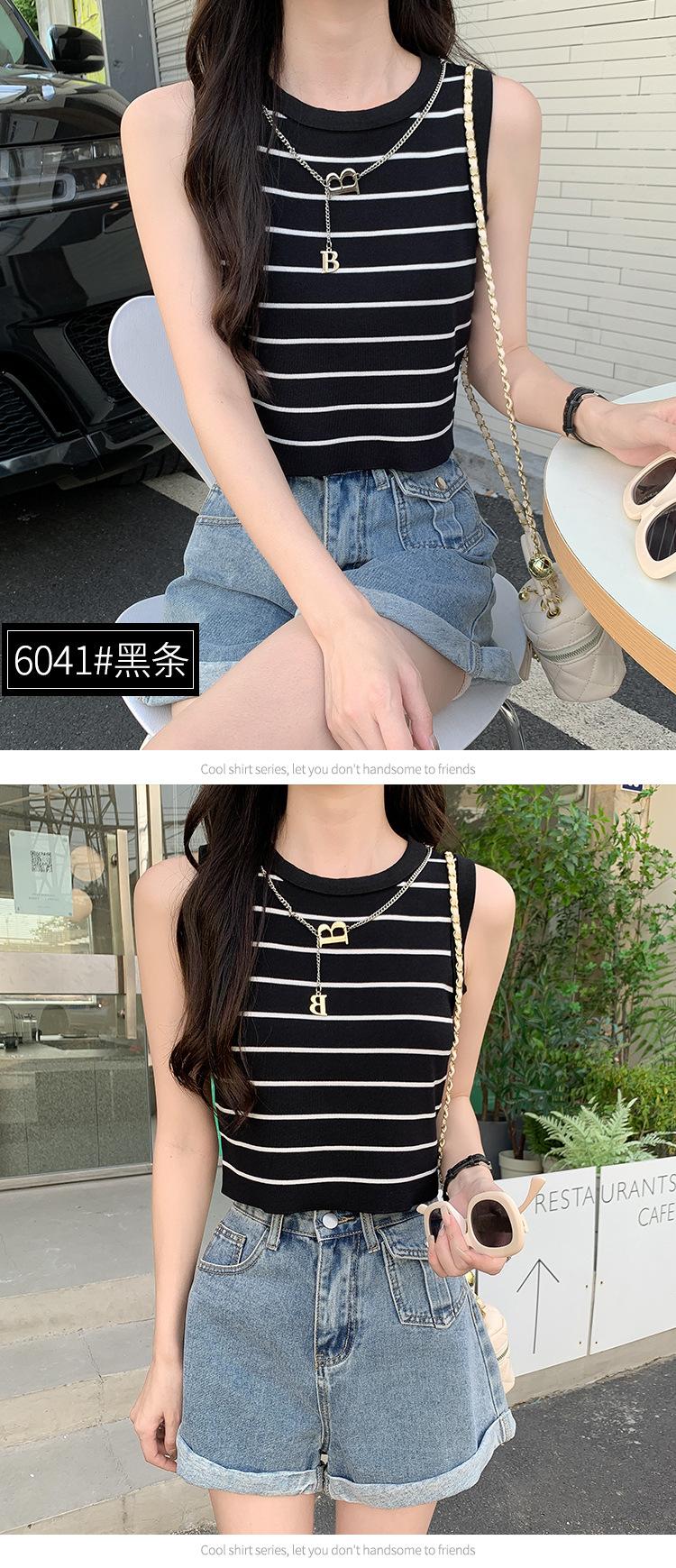 Camisola de punto de seda helada a rayas para llevar en capas, Diseño de verano, Estilo nicho, Versátil, Cintura alta, Corta, Sin mangas