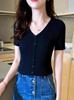 Tejido de Punto Calado Manga Corta para Mujer Verano Nuevo Delgado Estilo Coreano Ajustado Cuello V Abotonado Estilo Joven Camiseta Base para Mujer