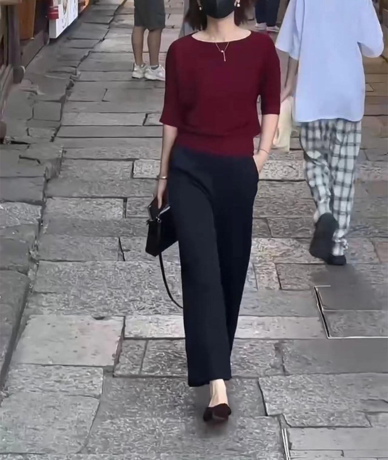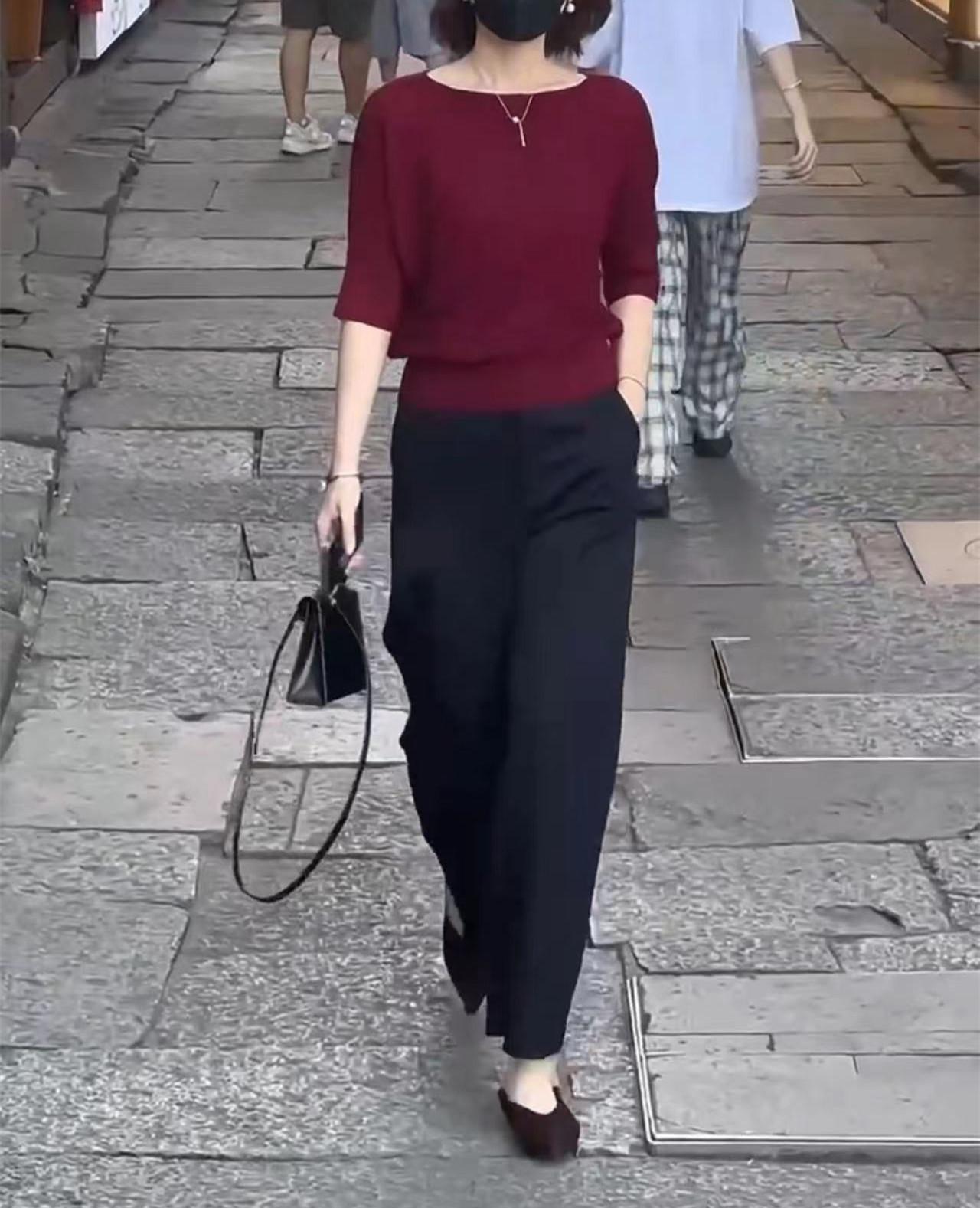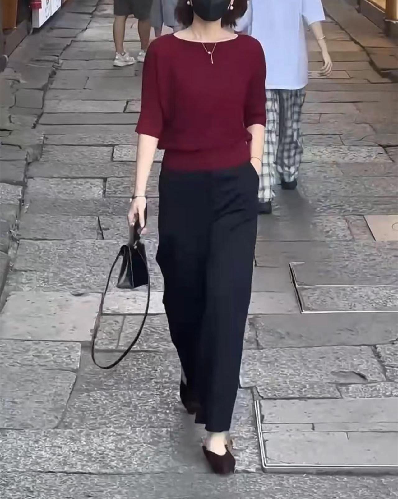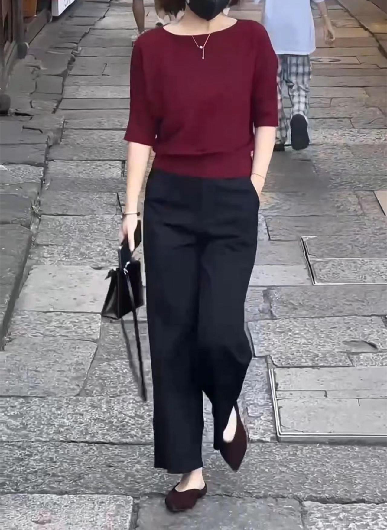 Red top, Brown top, Purple top, Black pants, Red top + black pants