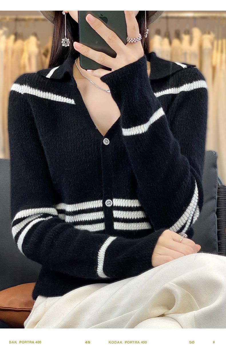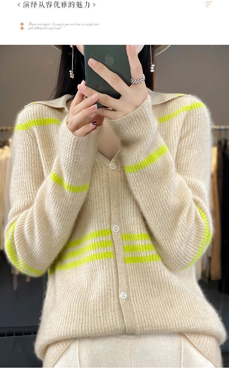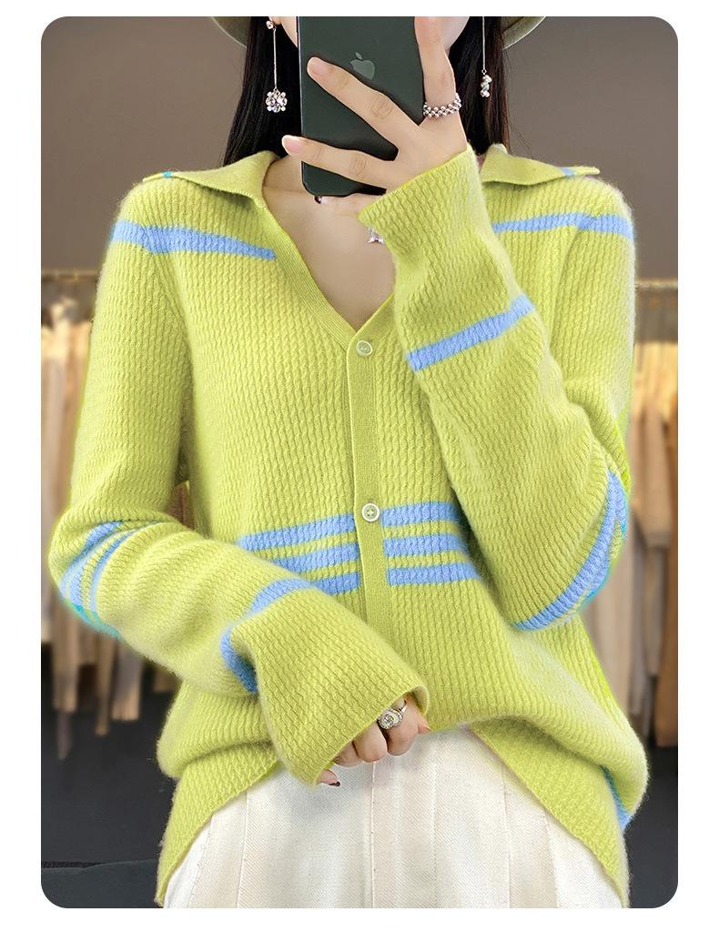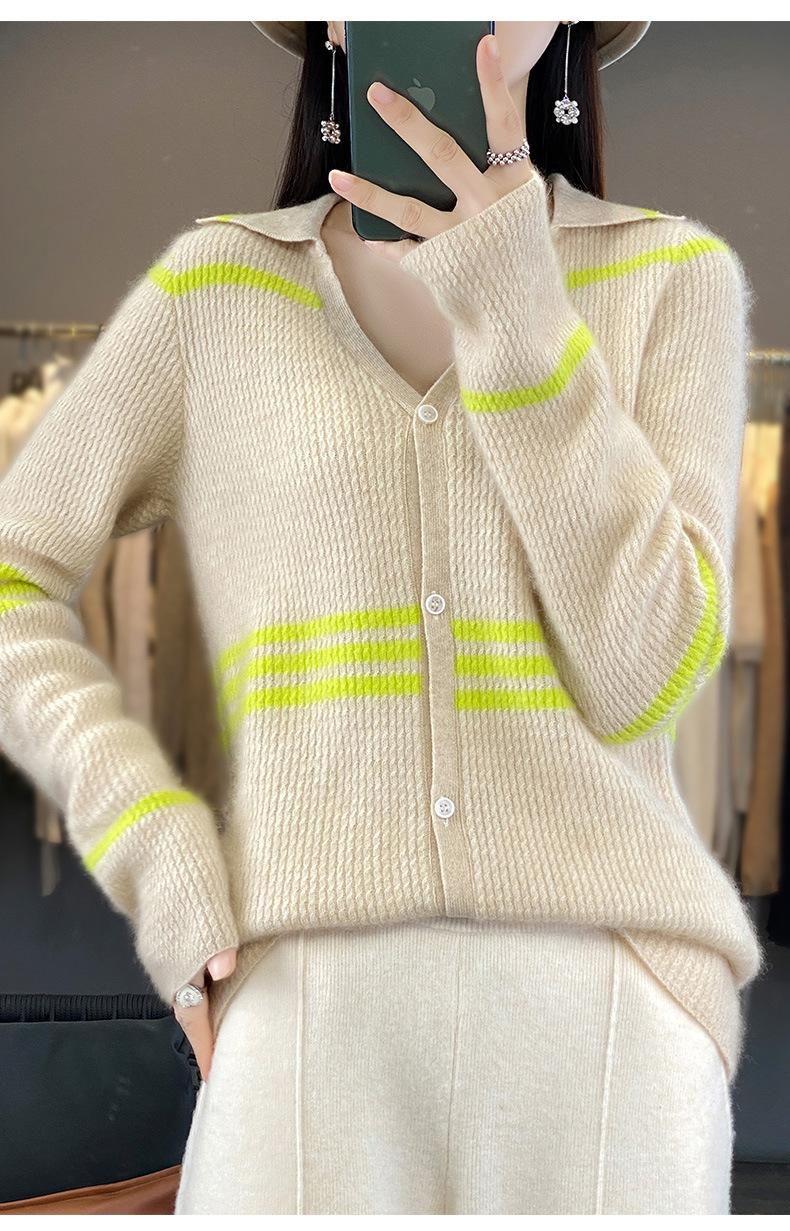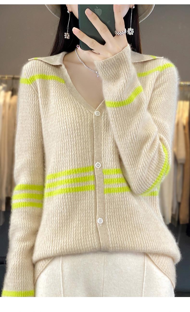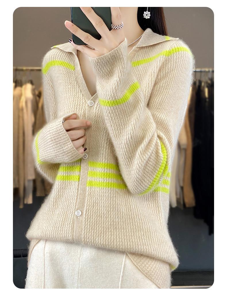 Cárdigan de lana a rayas en contraste para mujer, elegante, sencillo, informal, para ir al trabajo, con hebilla y base de cachemira