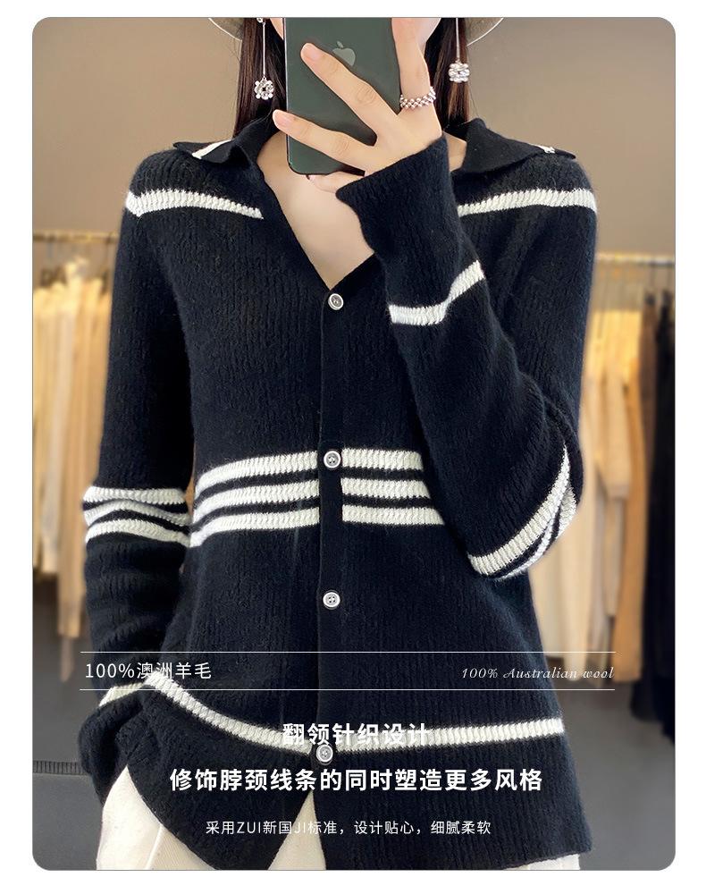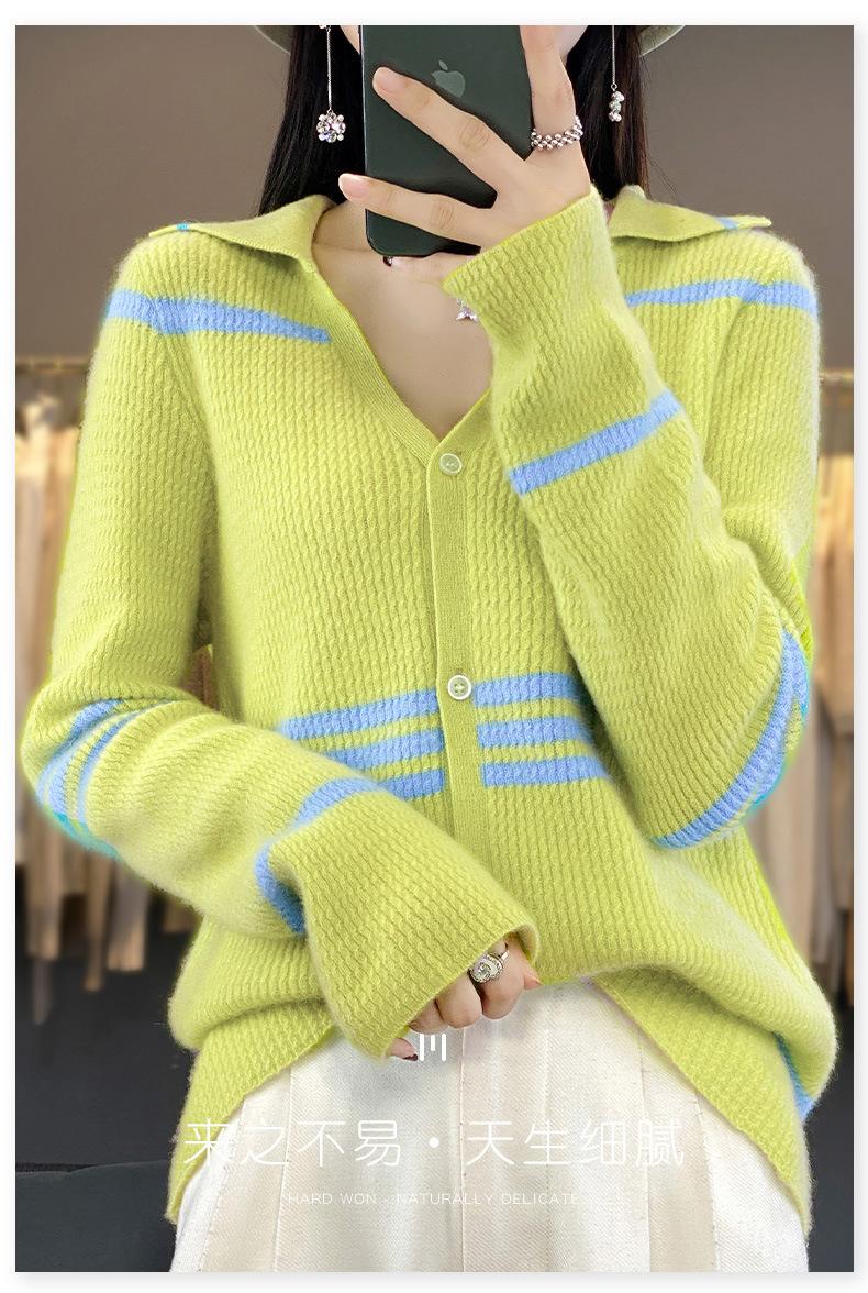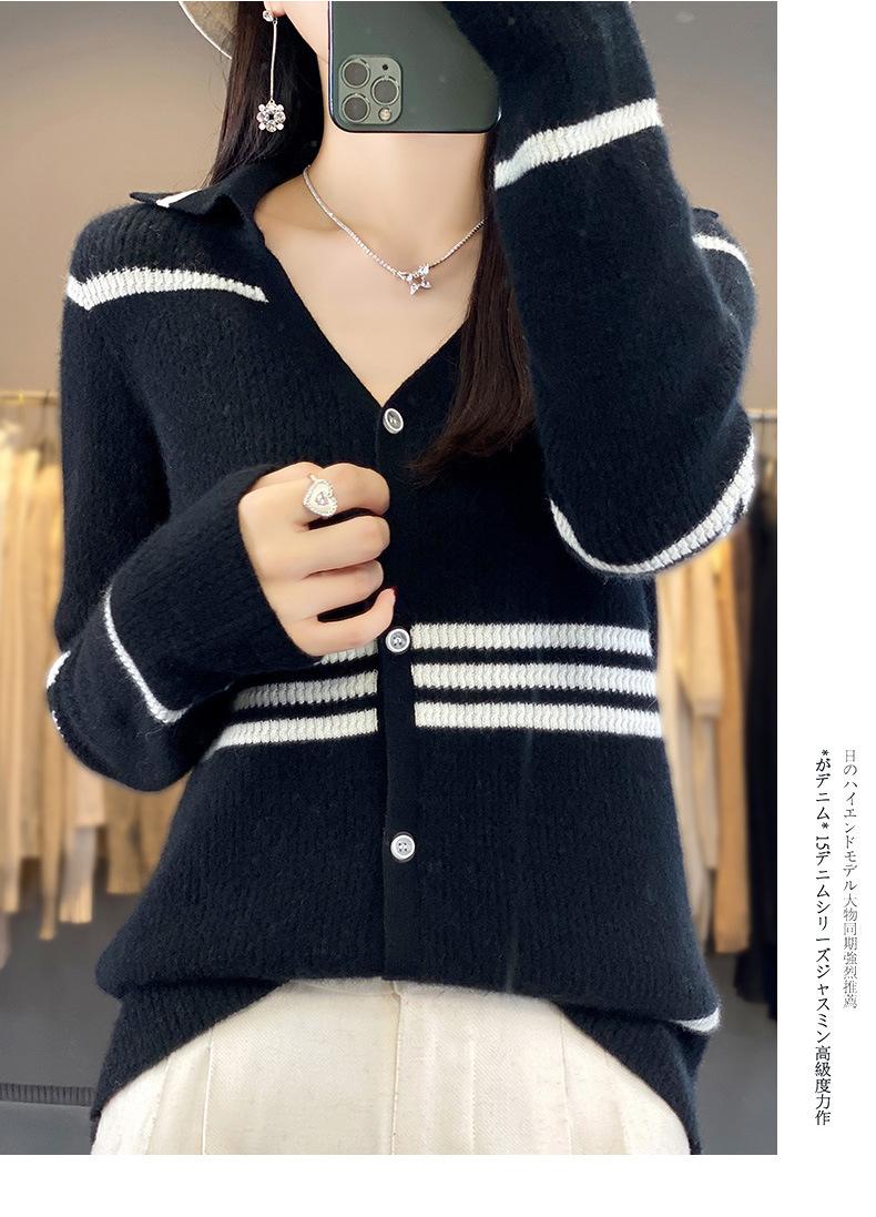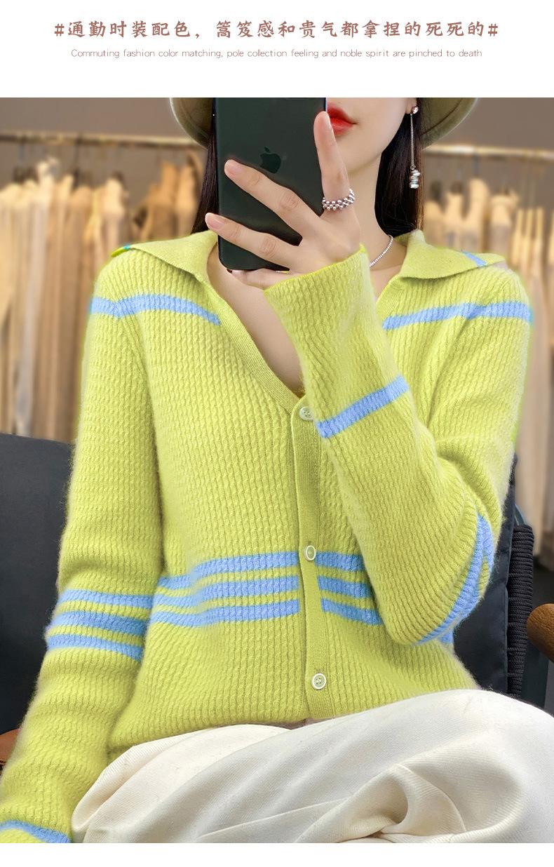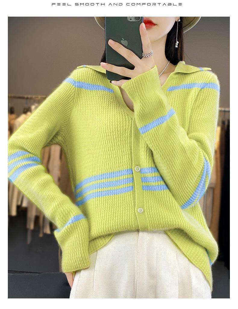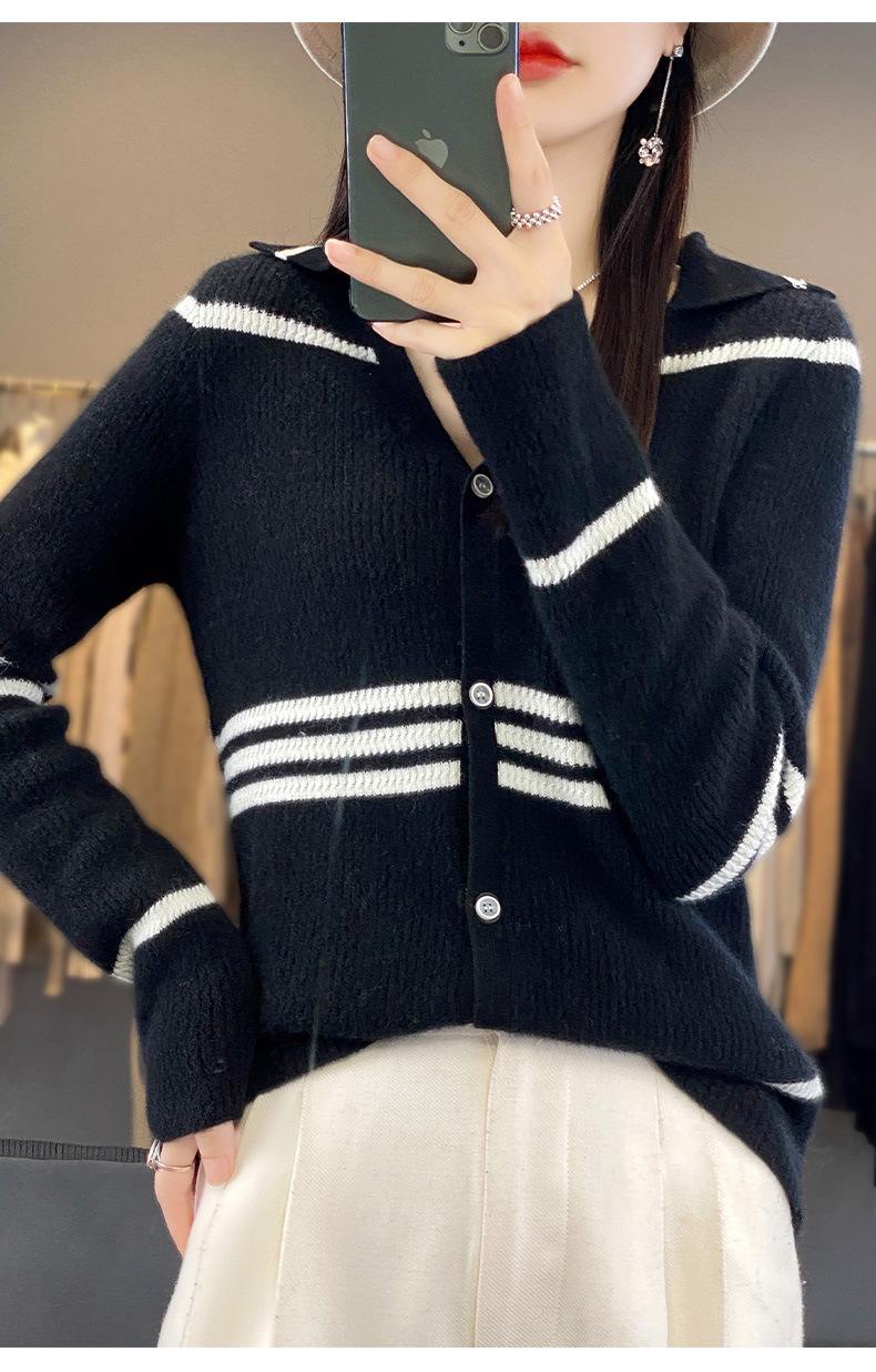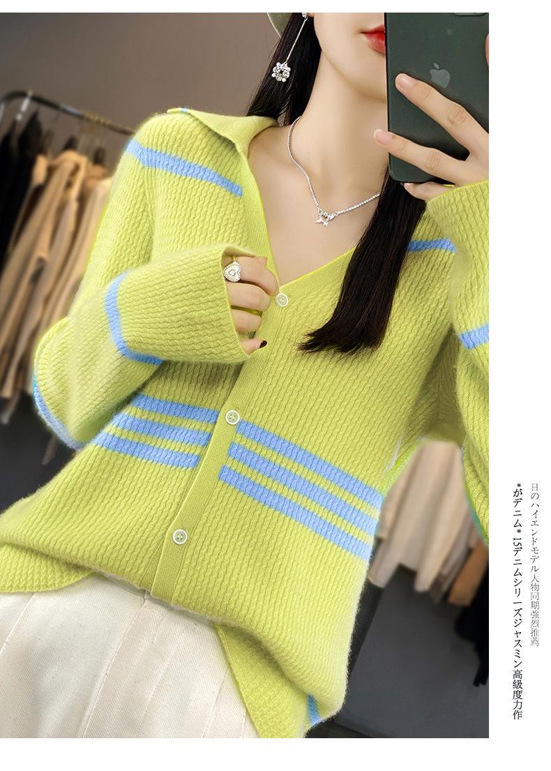 Cárdigan de lana a rayas en contraste para mujer, elegante, sencillo, informal, para ir al trabajo, con hebilla y base de cachemira