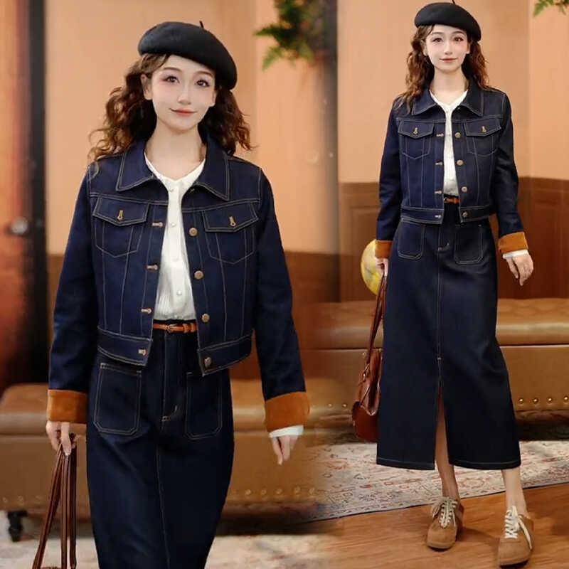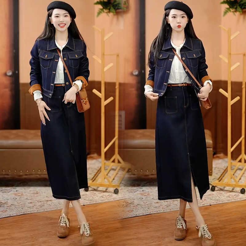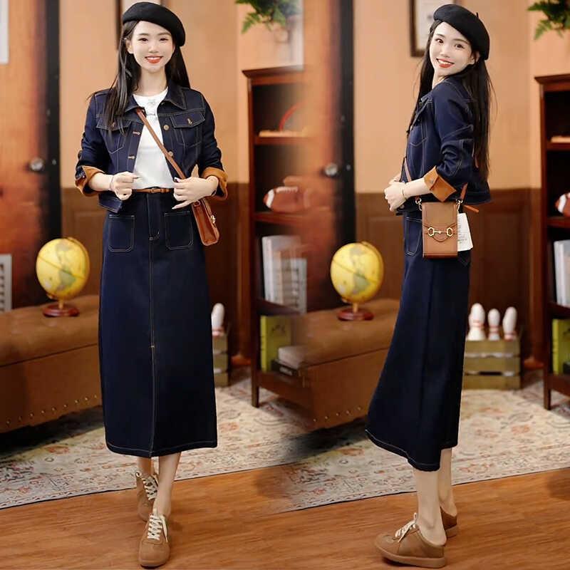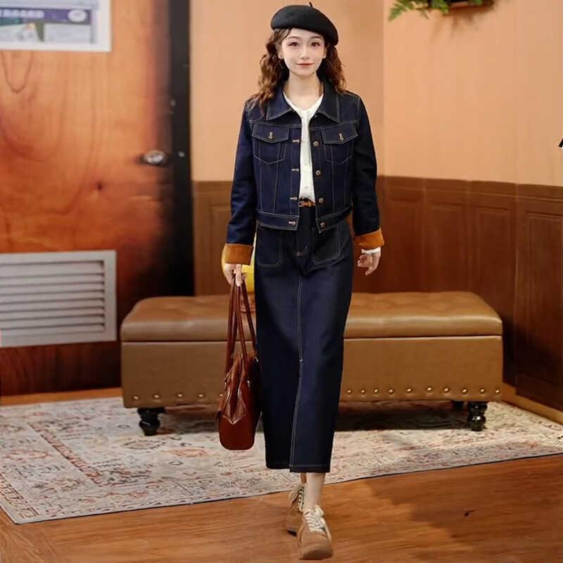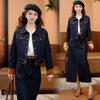 Traje de mezclilla para mujer, otoño 2024, nuevo, pequeño, estilo occidental, retro, abrigo corto, falda adelgazante, conjunto de dos piezas