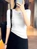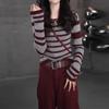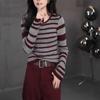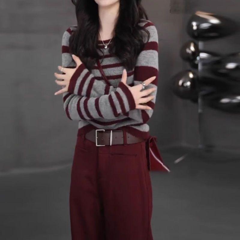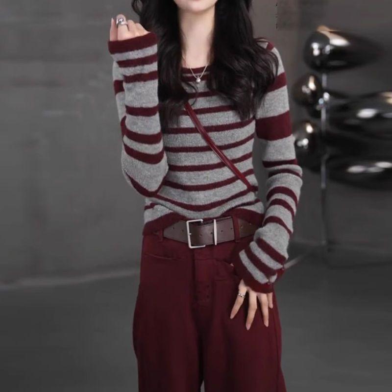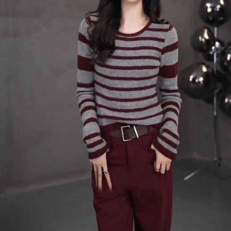 Suéter de cuello redondo a rayas con diseño de contraste de colores de moda para principios de otoño, nueva camisa básica de manga larga de alta gama y corte entallado para mujer