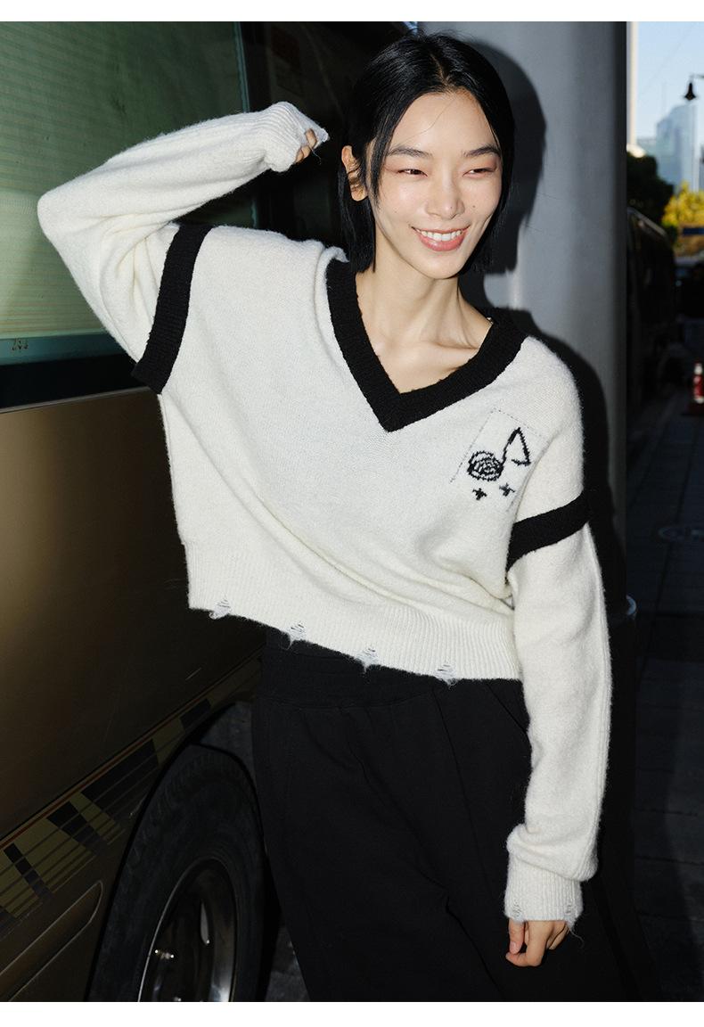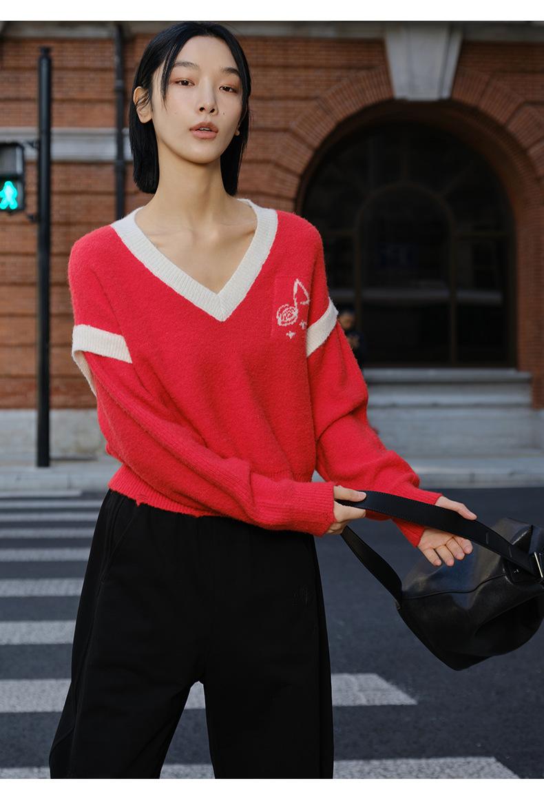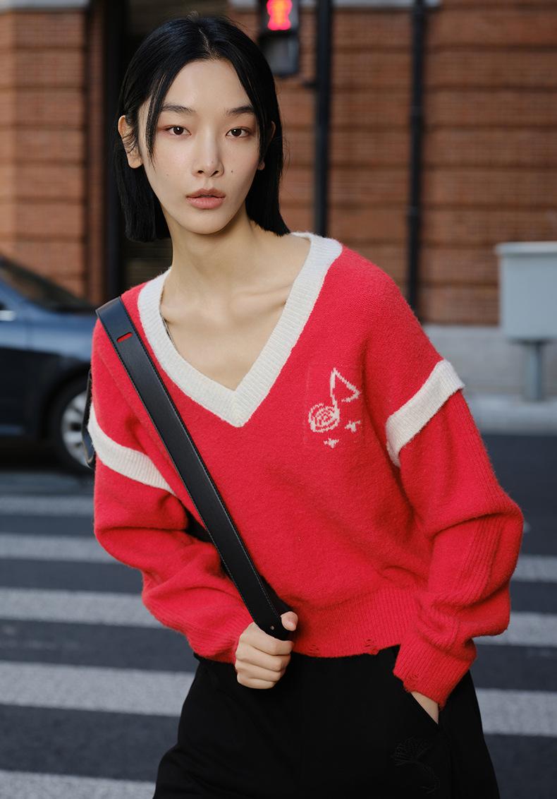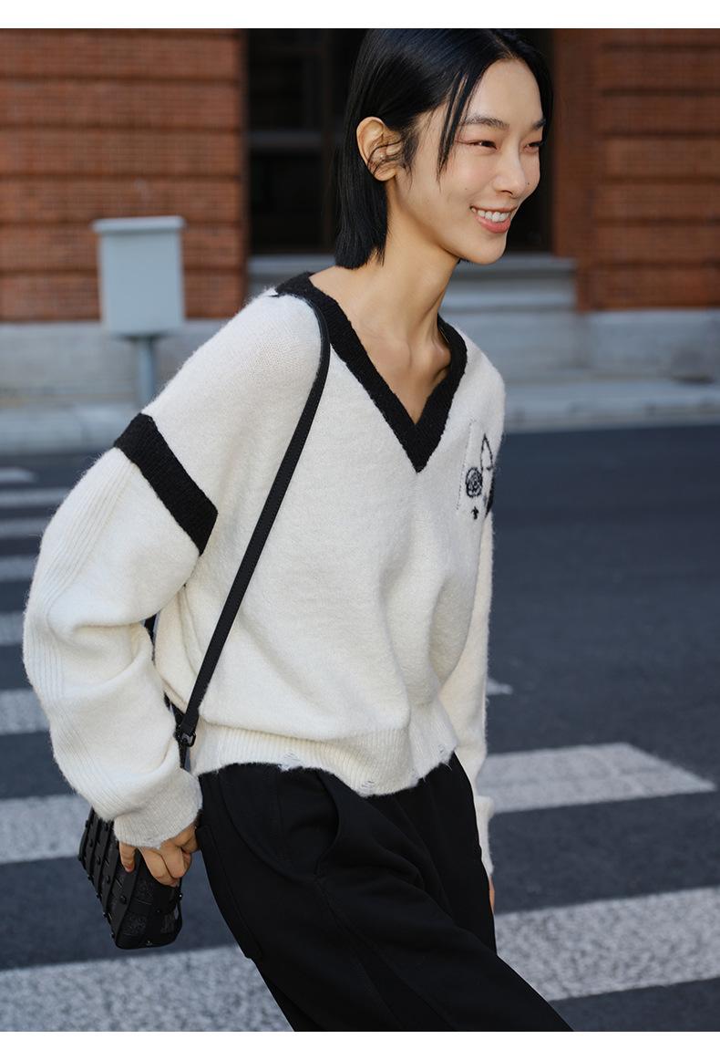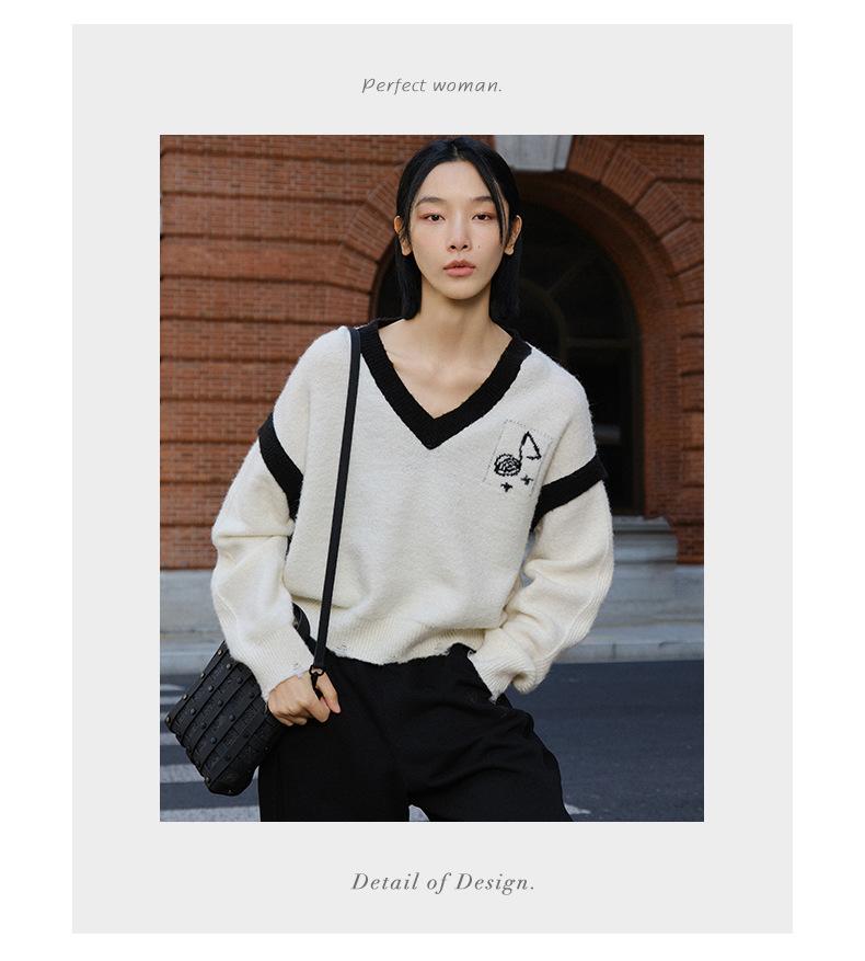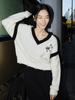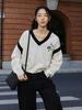 Producto Nuevo Otoño 2025 Jersey Jacquard Color Block Cuello en V Suelto Moda Versátil Diseño Adelgazante Suéter 69180
