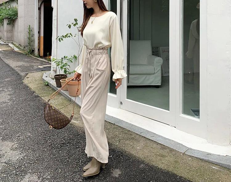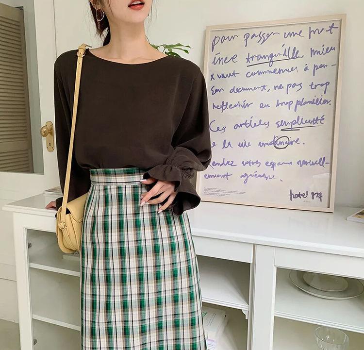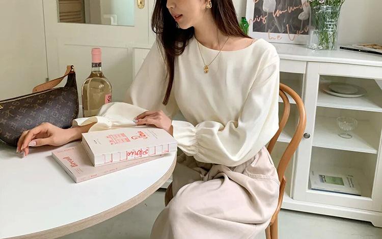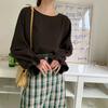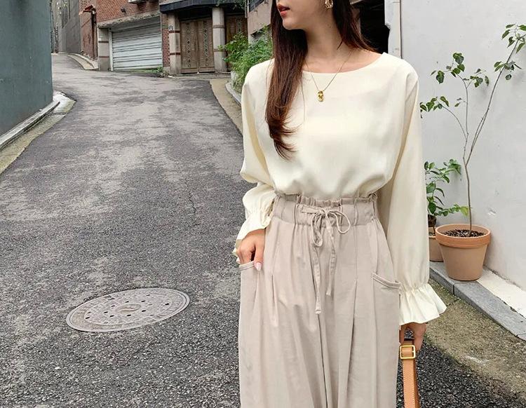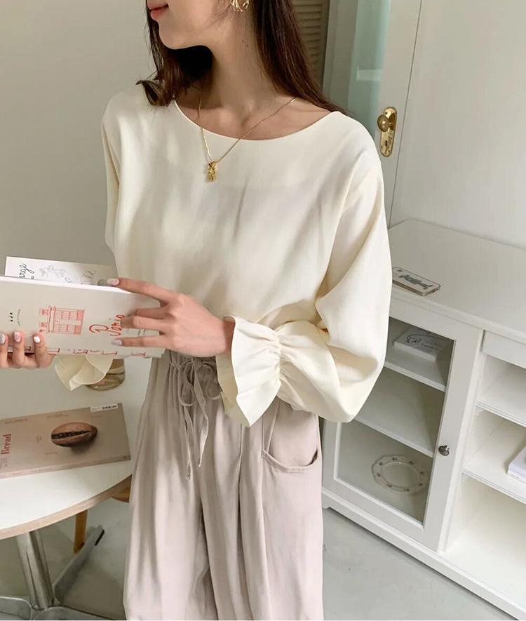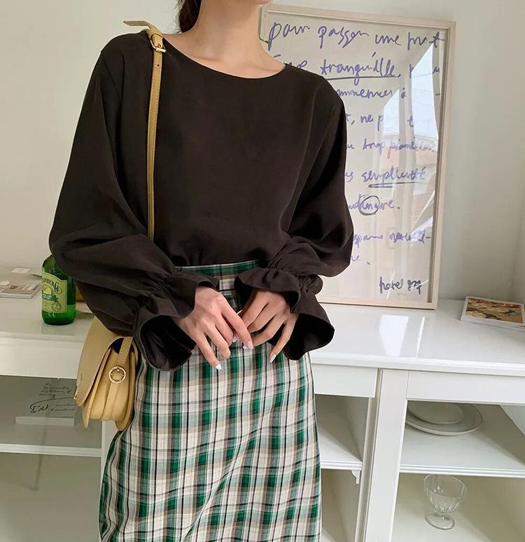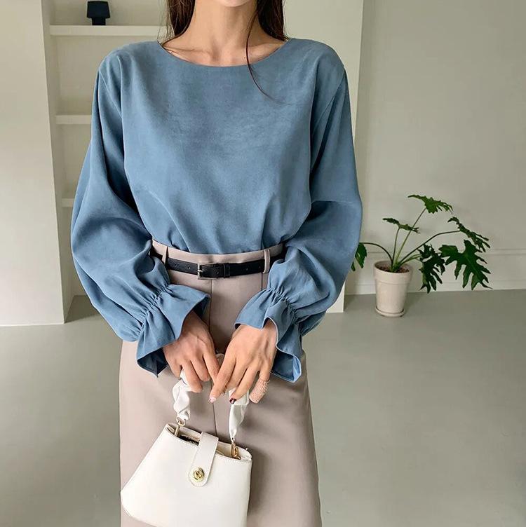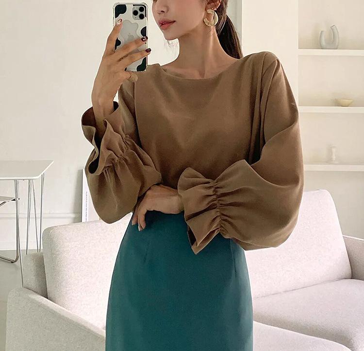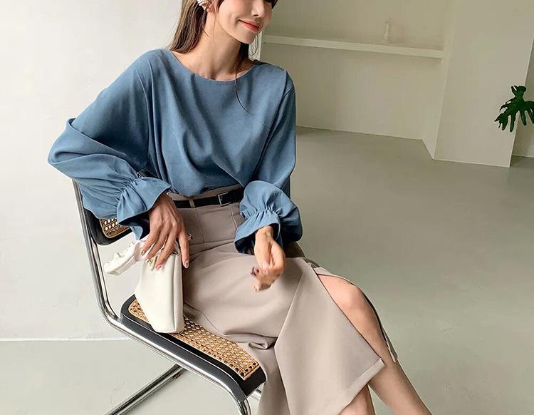 Camiseta de otoño estilo coreano para mujer, combinable con todo, cuello redondo, manga acampanada, jersey de color liso