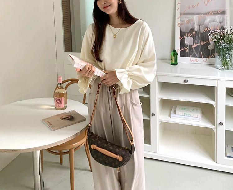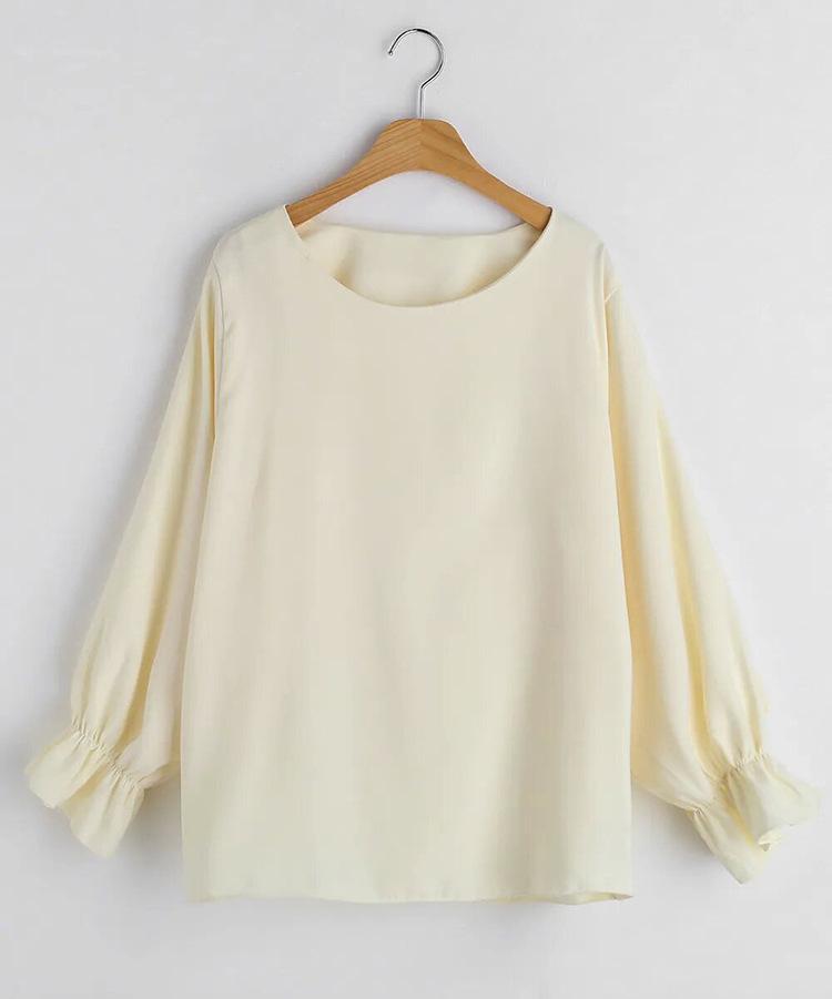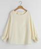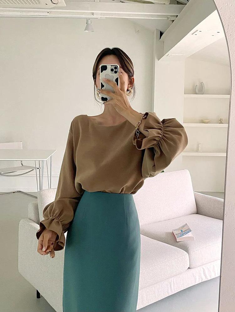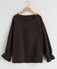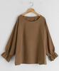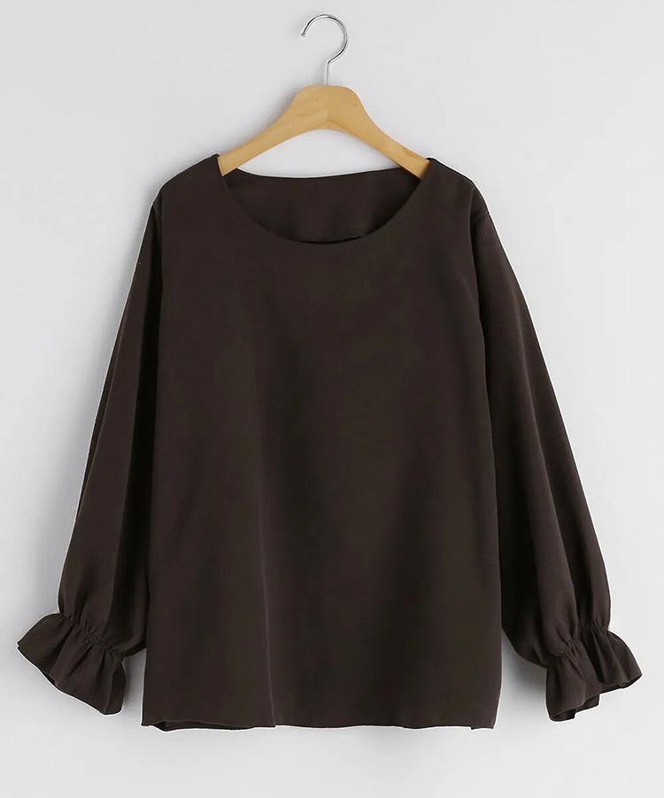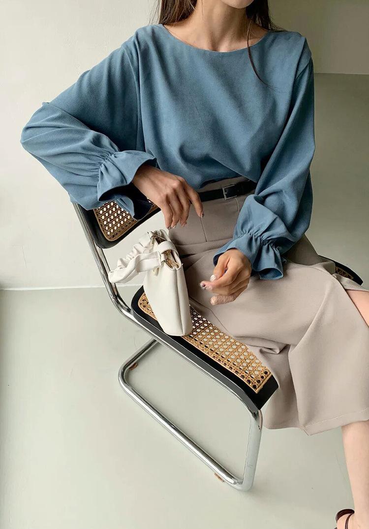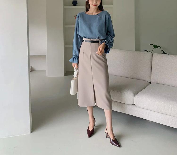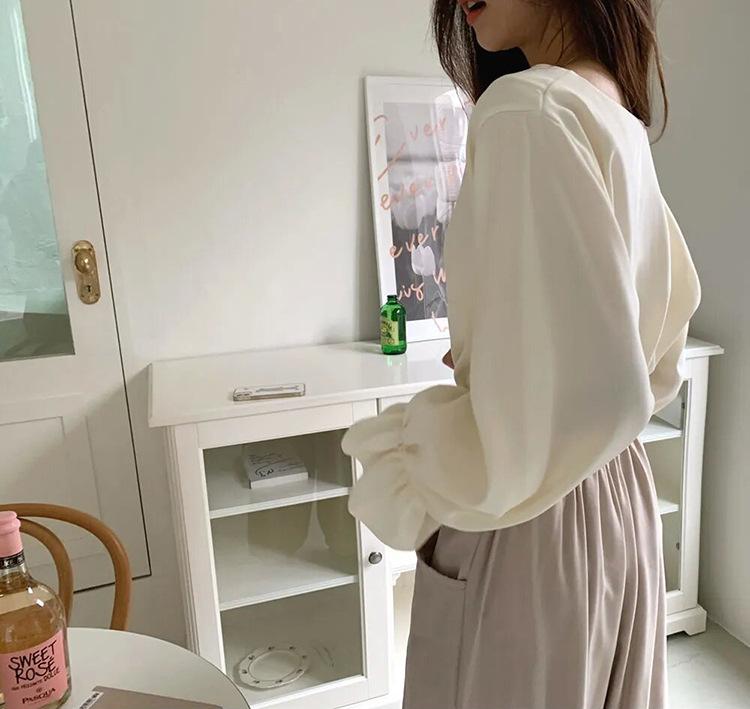 Camiseta de otoño estilo coreano para mujer, combinable con todo, cuello redondo, manga acampanada, jersey de color liso