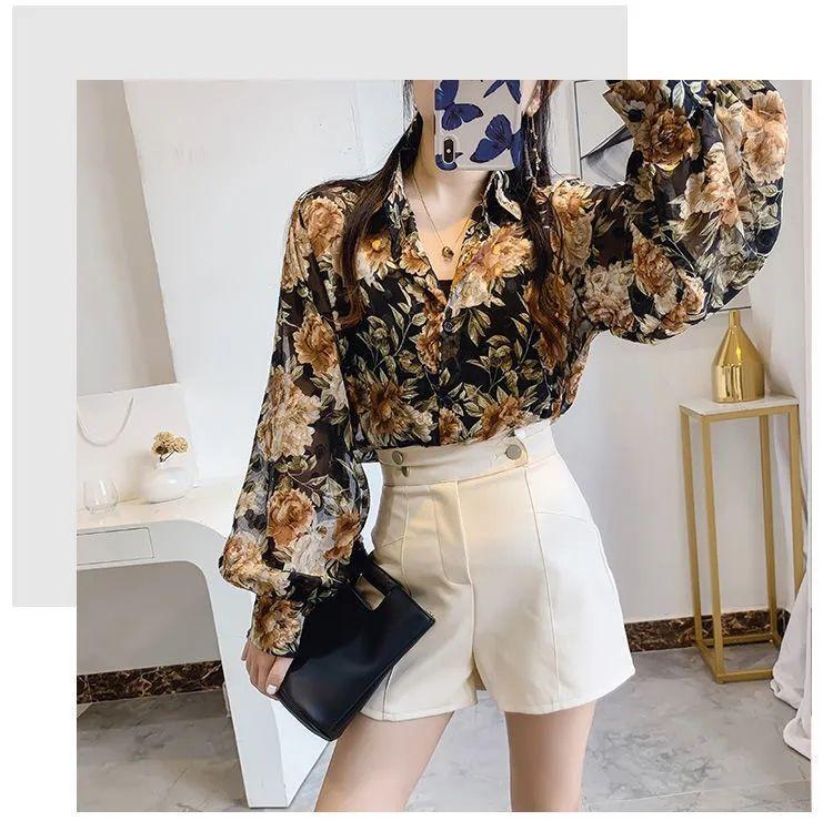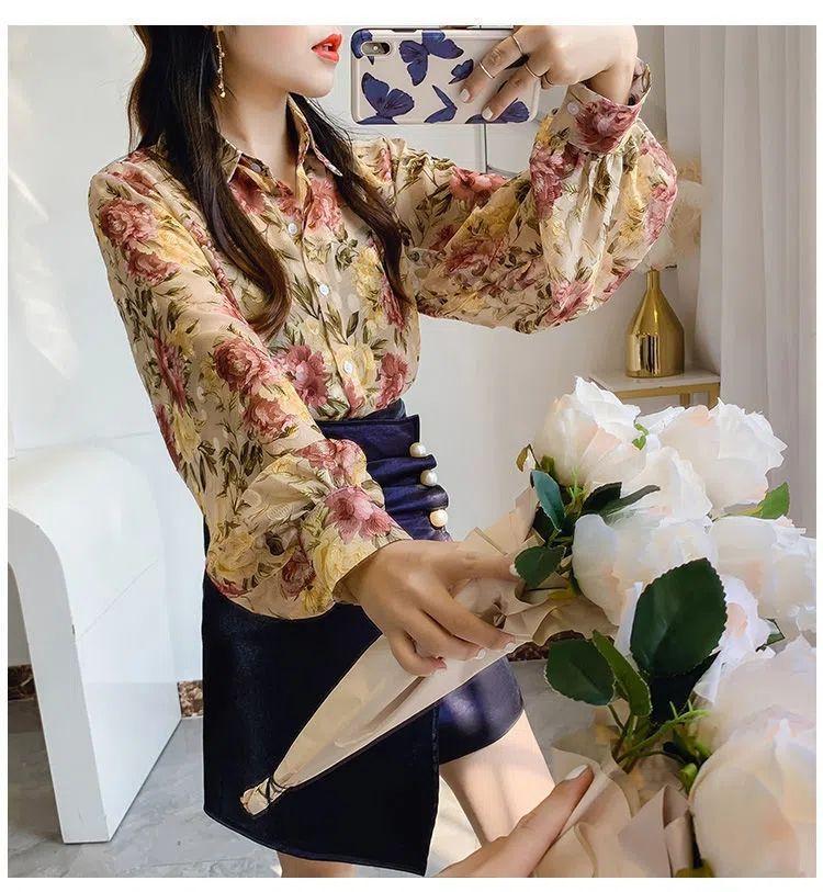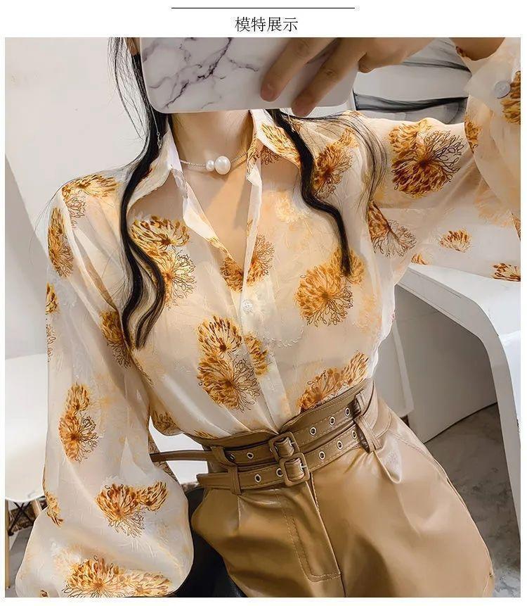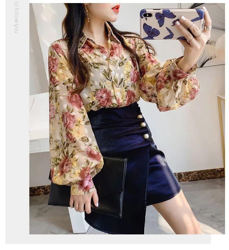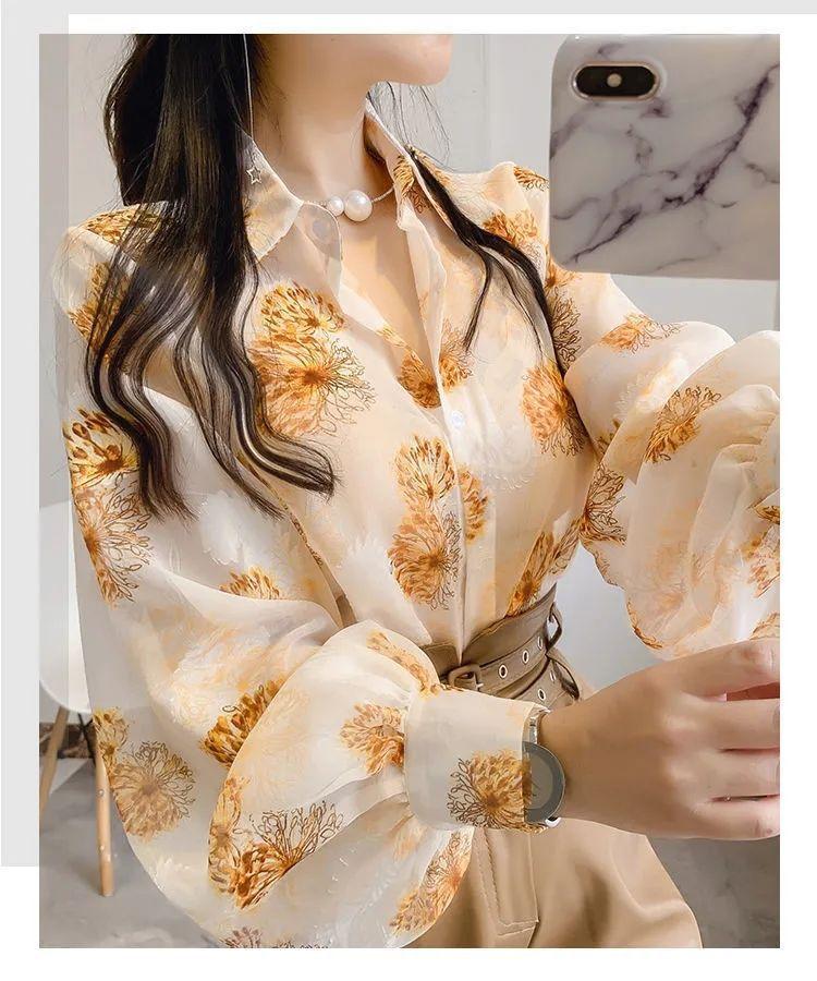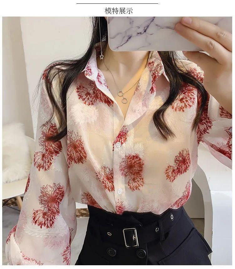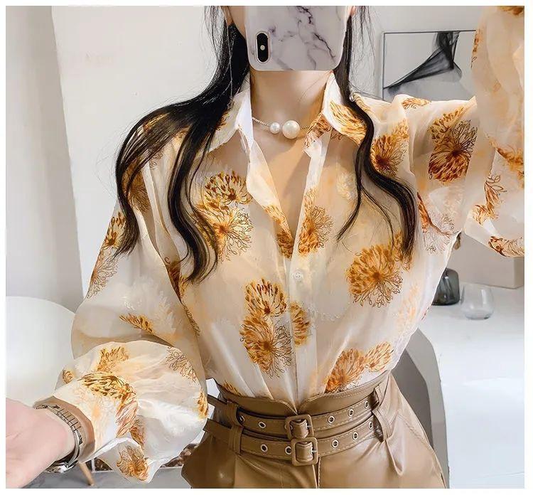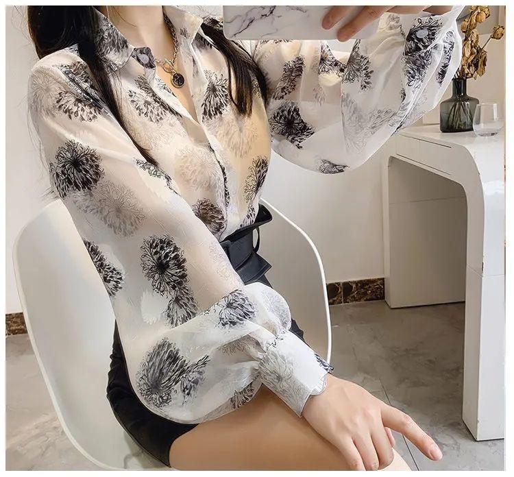 Ropa de Protección Solar de Manga Linterna Tops de Mujer Otoño Retro Camisas de Gasa Moda Femenina Floral Temperamento Camisas para Aire Acondicionado Camisas de Mujer