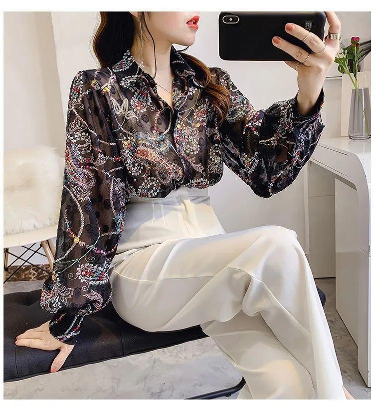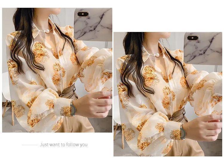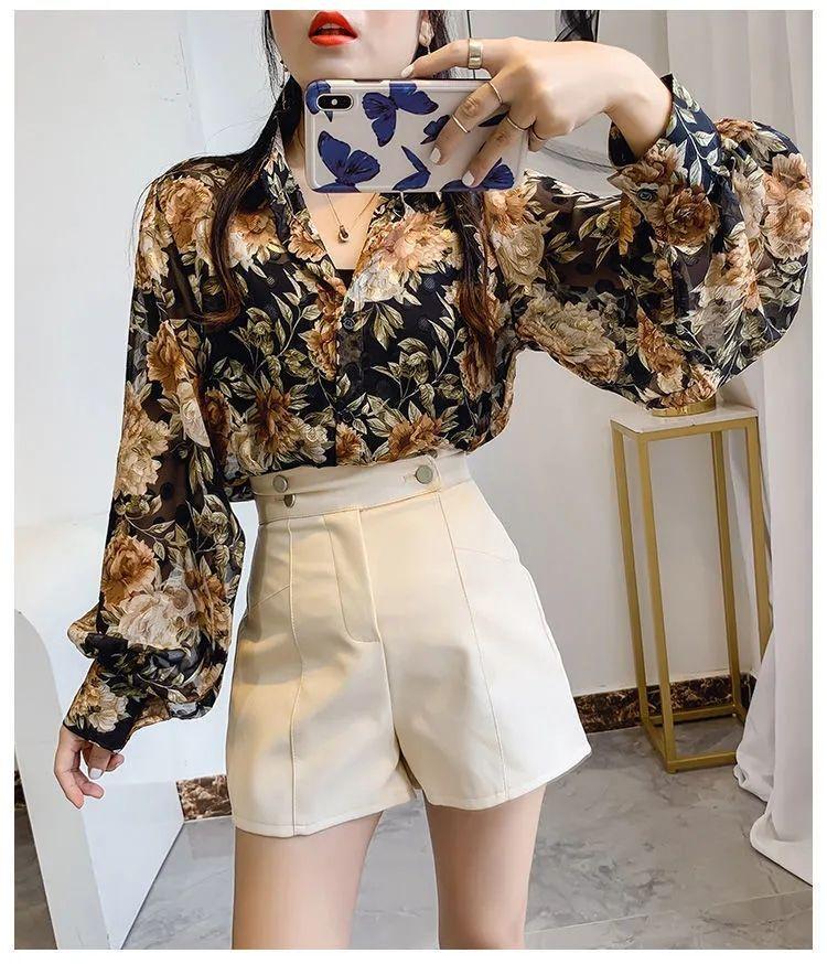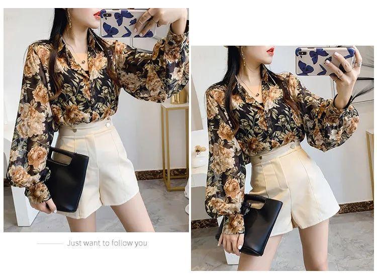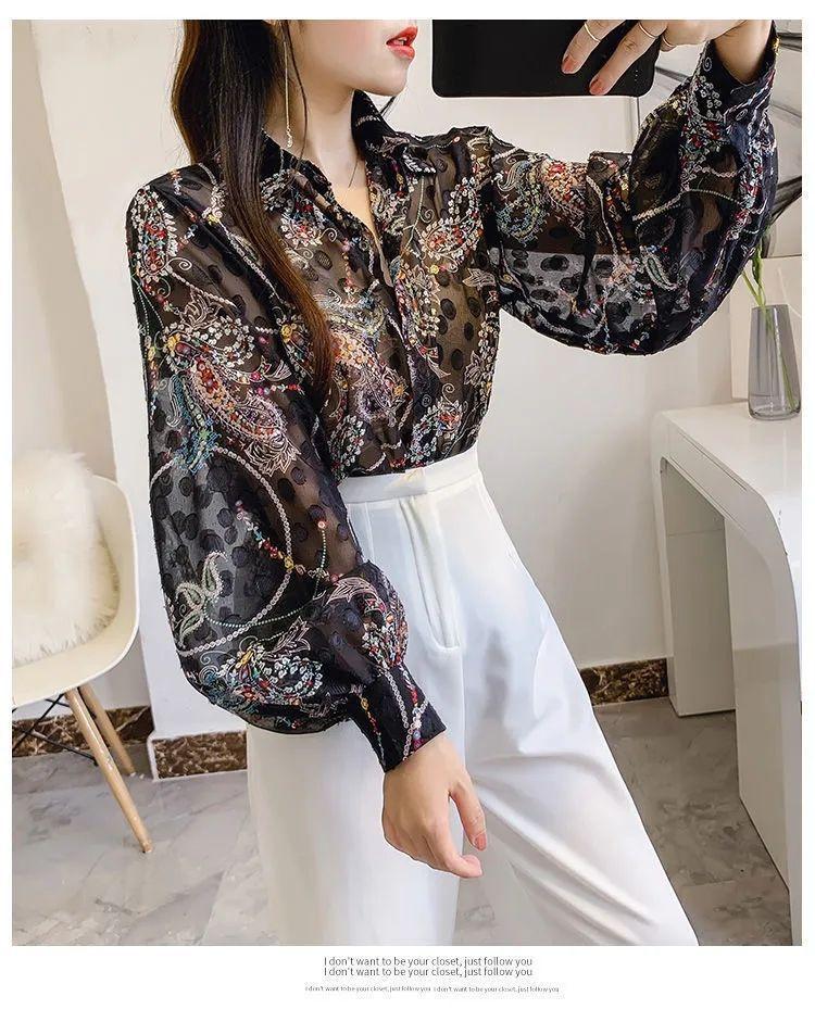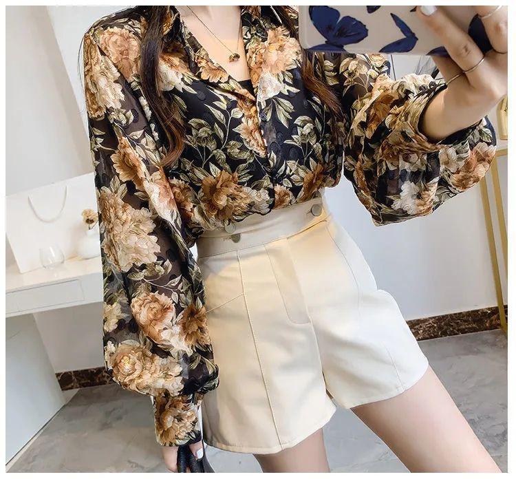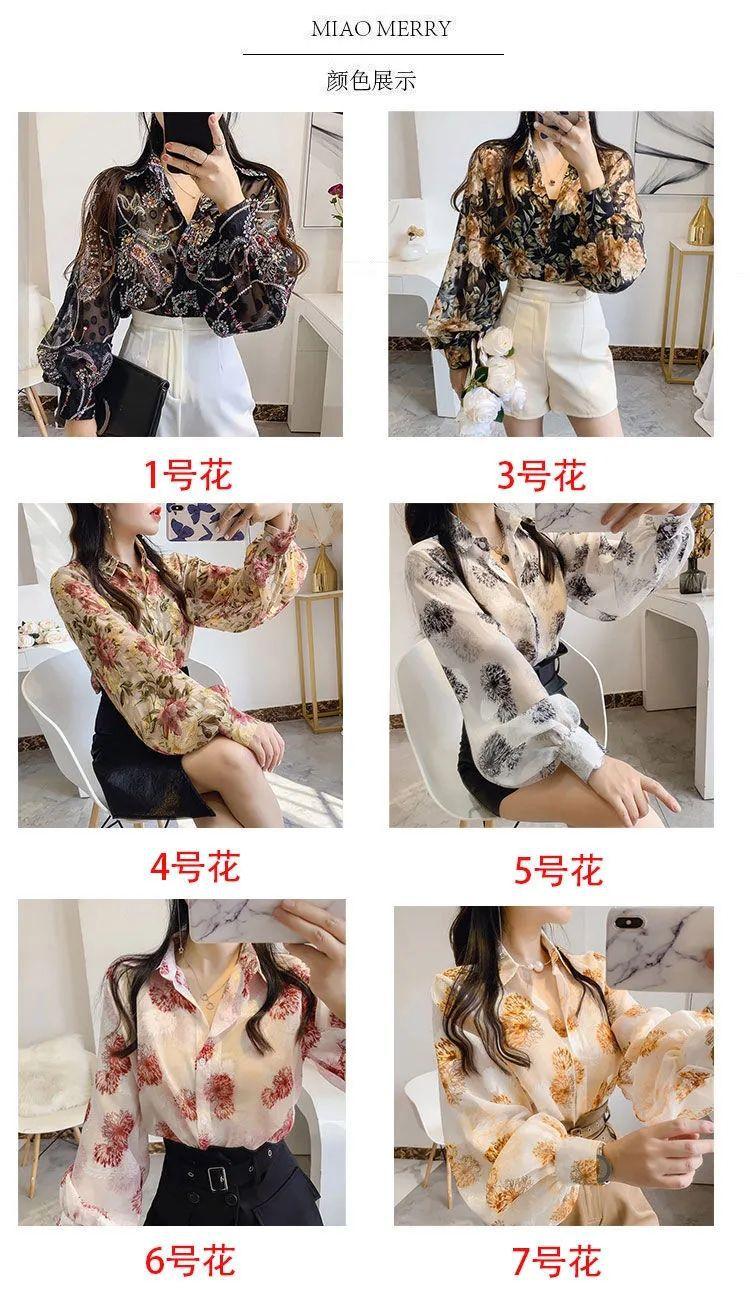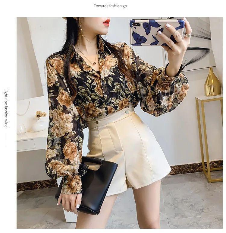 Ropa de Protección Solar de Manga Linterna Tops de Mujer Otoño Retro Camisas de Gasa Moda Femenina Floral Temperamento Camisas para Aire Acondicionado Camisas de Mujer