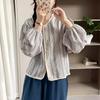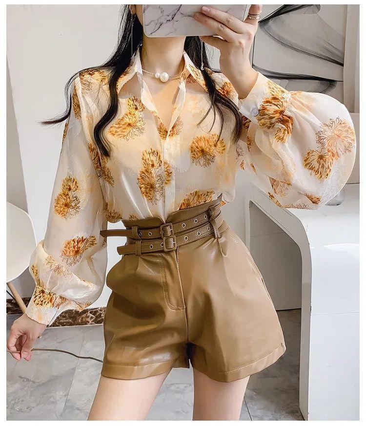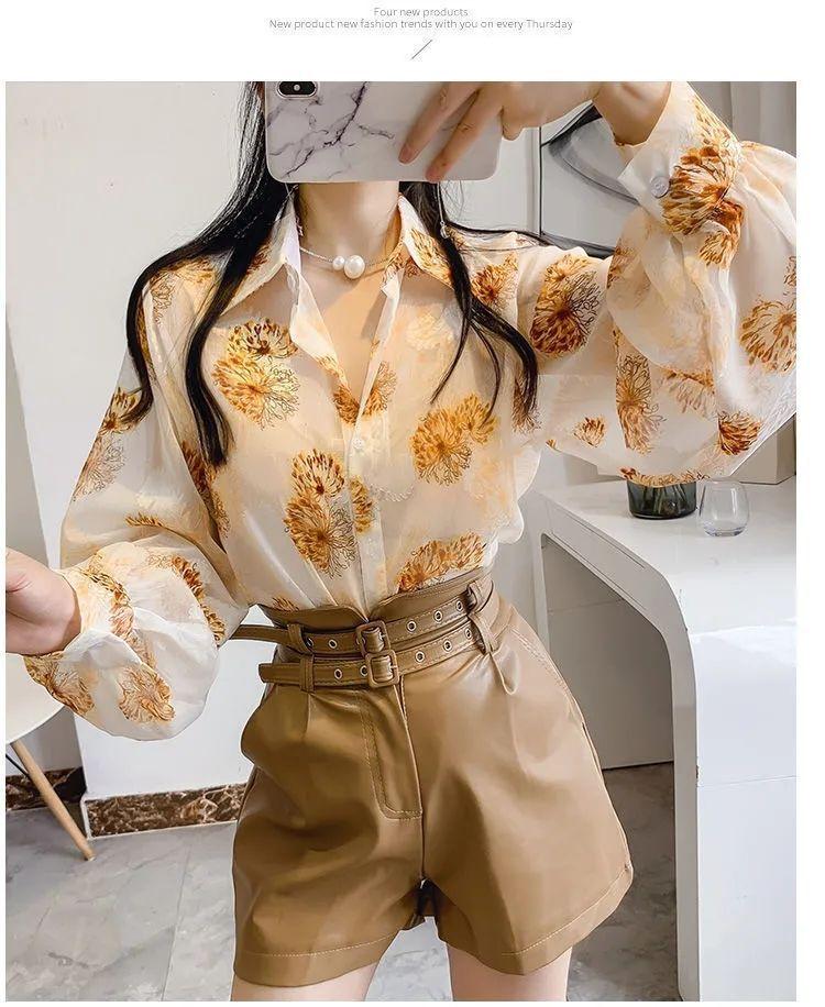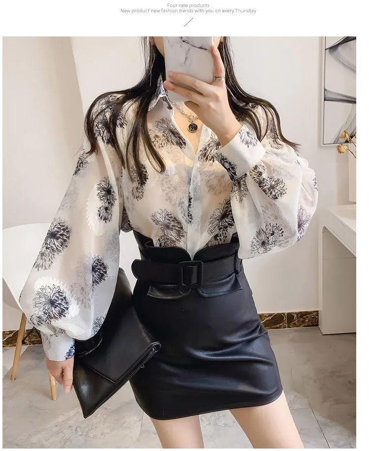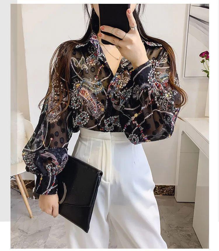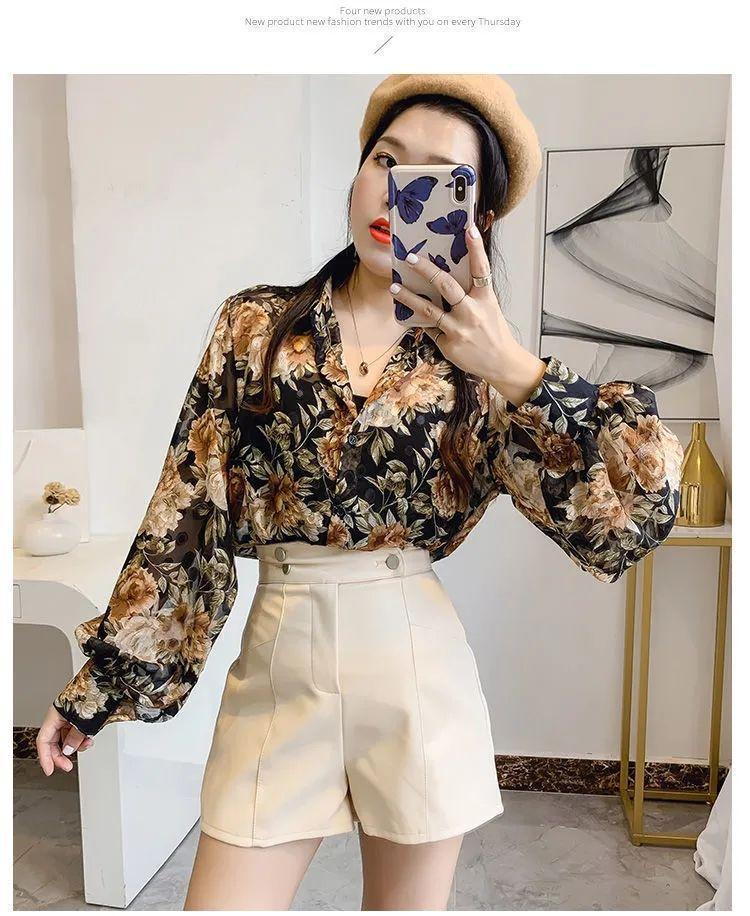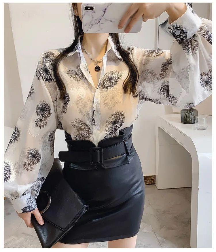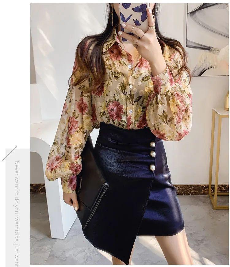 Ropa de Protección Solar de Manga Linterna Tops de Mujer Otoño Retro Camisas de Gasa Moda Femenina Floral Temperamento Camisas para Aire Acondicionado Camisas de Mujer