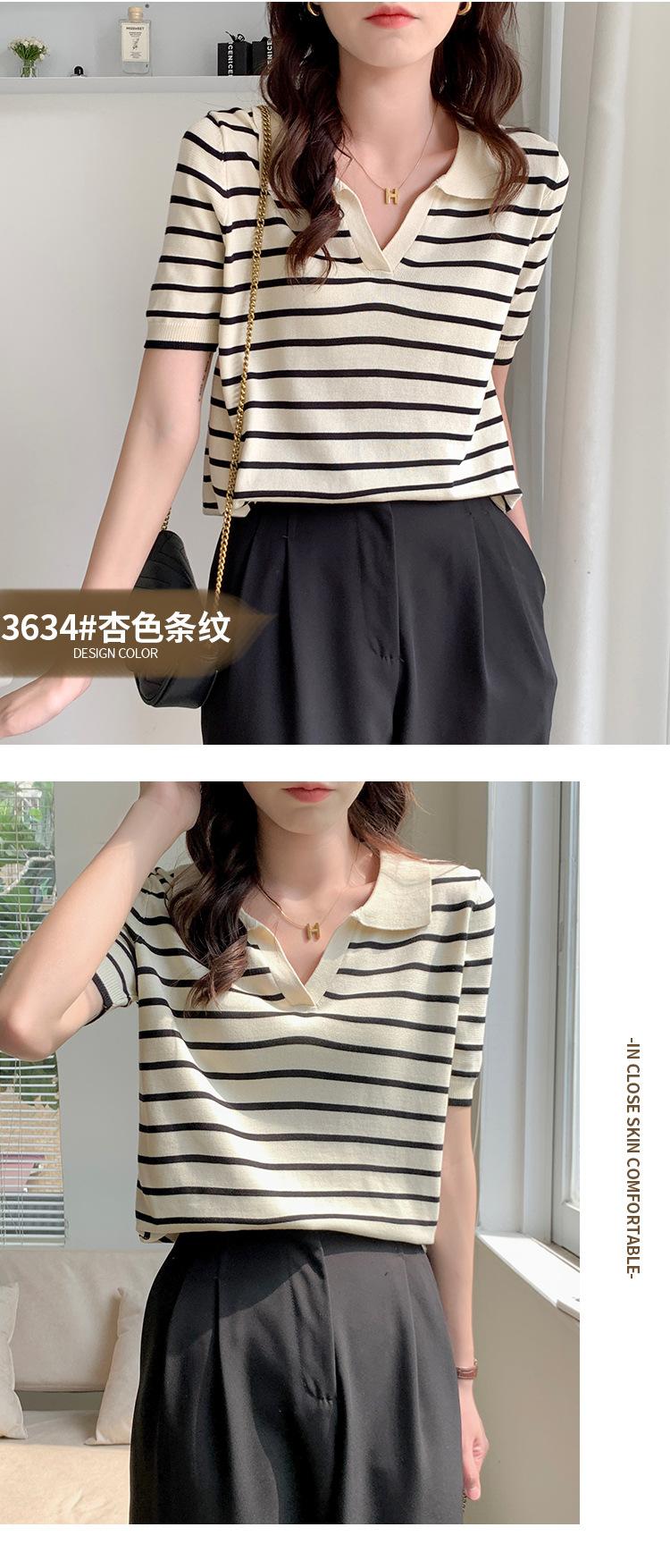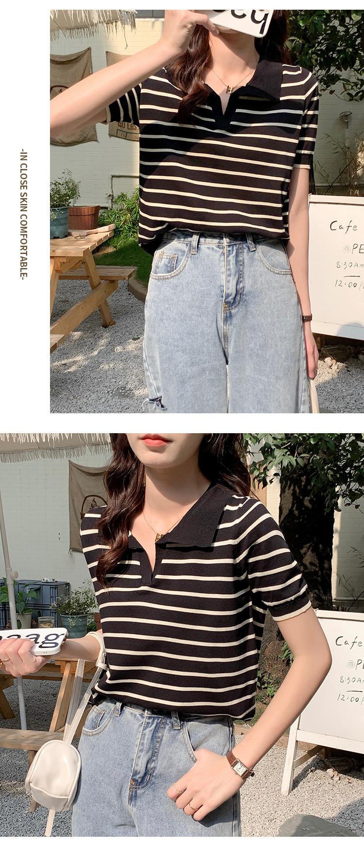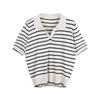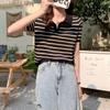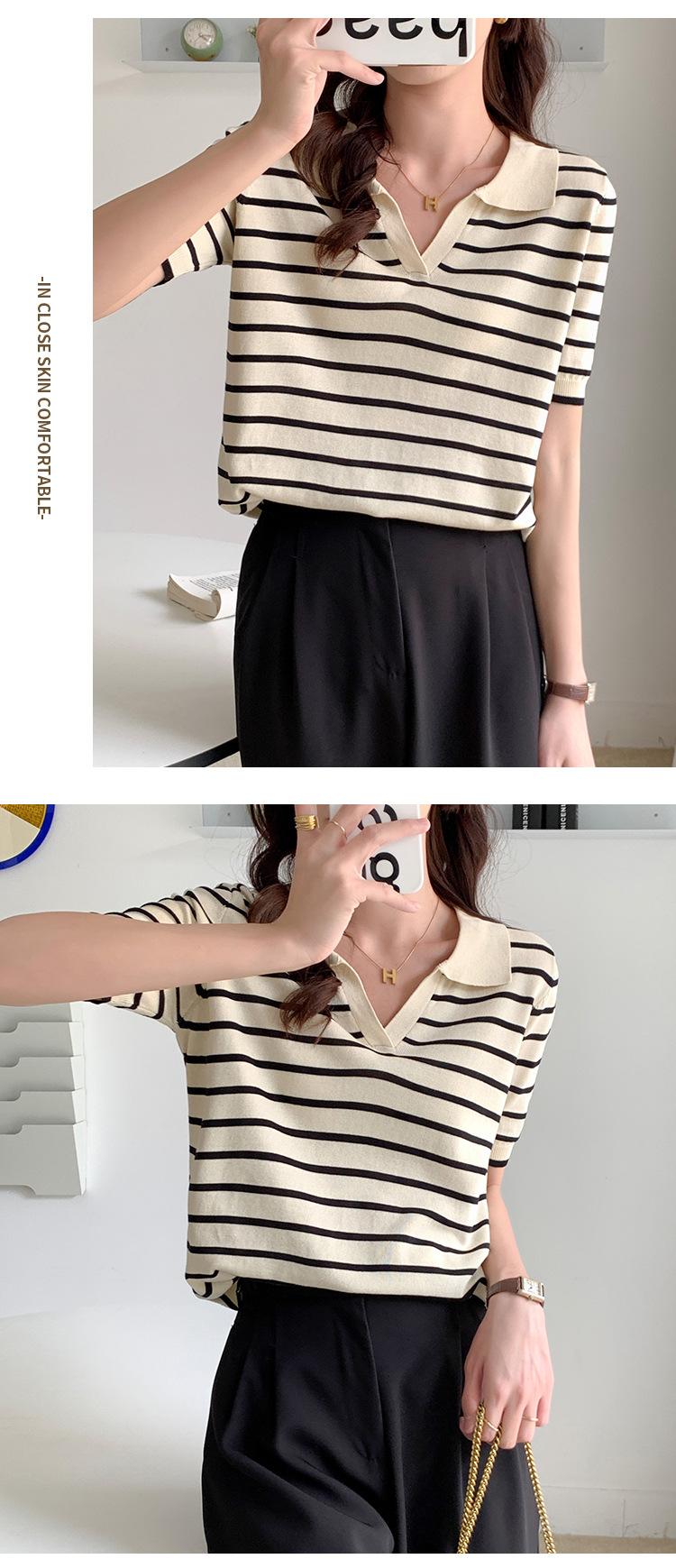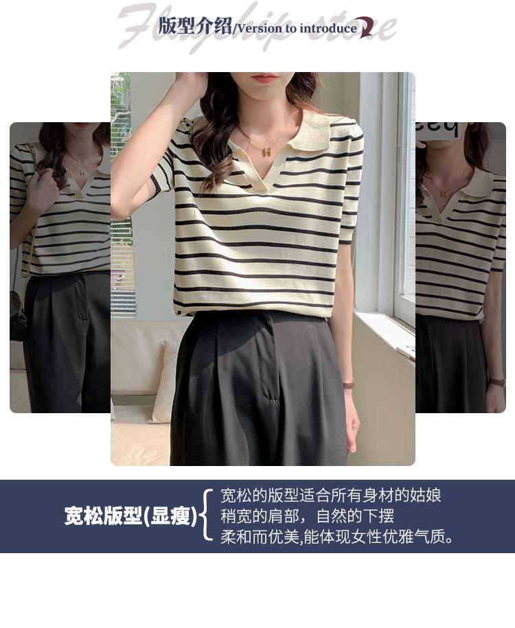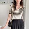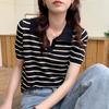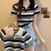 Suéter de punto de manga corta a rayas con cuello de polo para mujer, diseño holgado y fino de verano, camiseta coreana con cuello en V y estilo nicho.