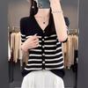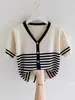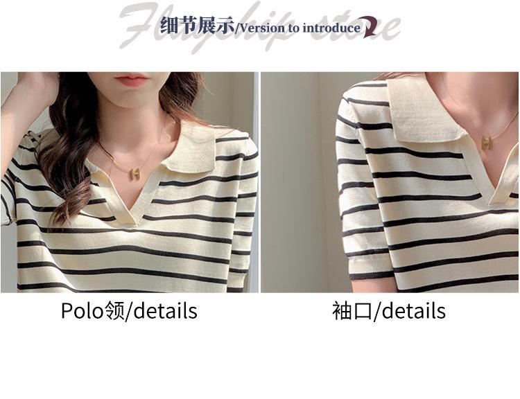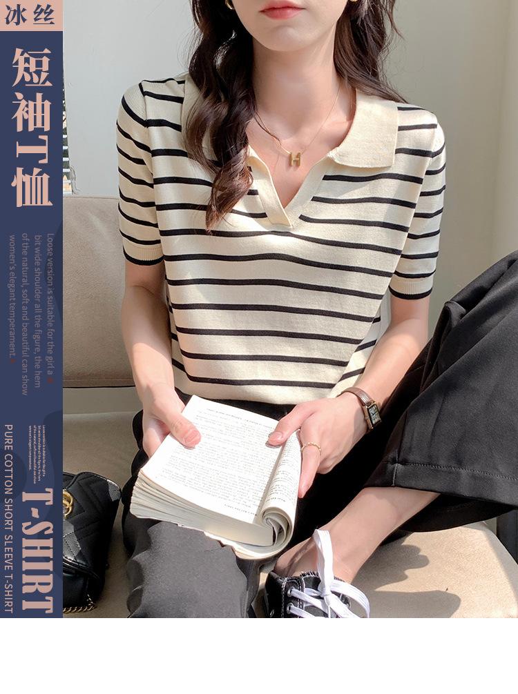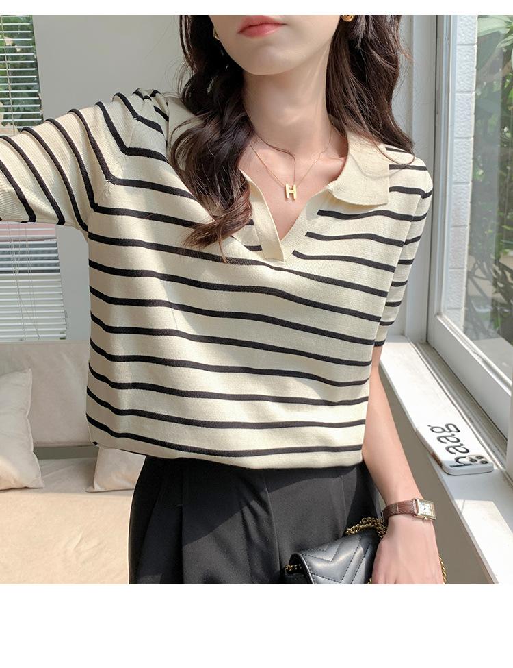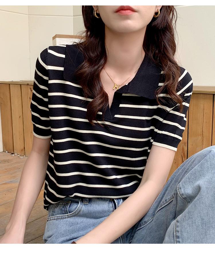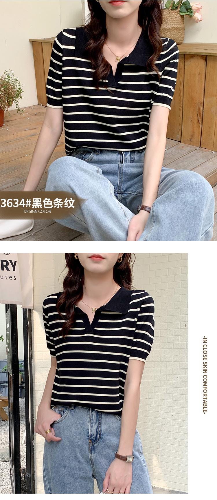 Suéter de punto de manga corta a rayas con cuello de polo para mujer, diseño holgado y fino de verano, camiseta coreana con cuello en V y estilo nicho.