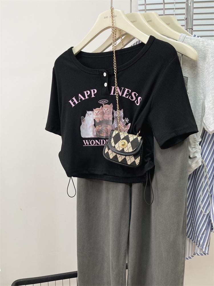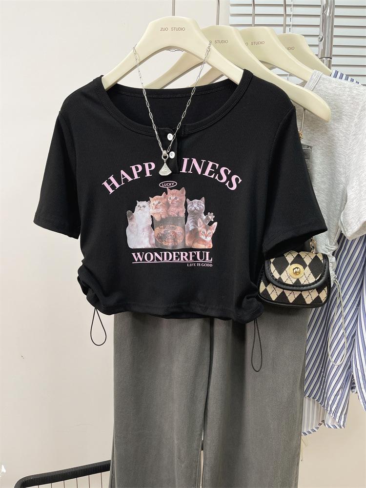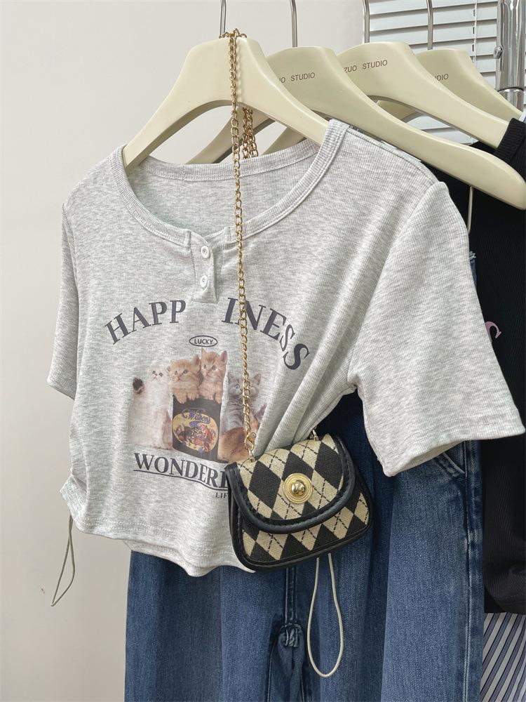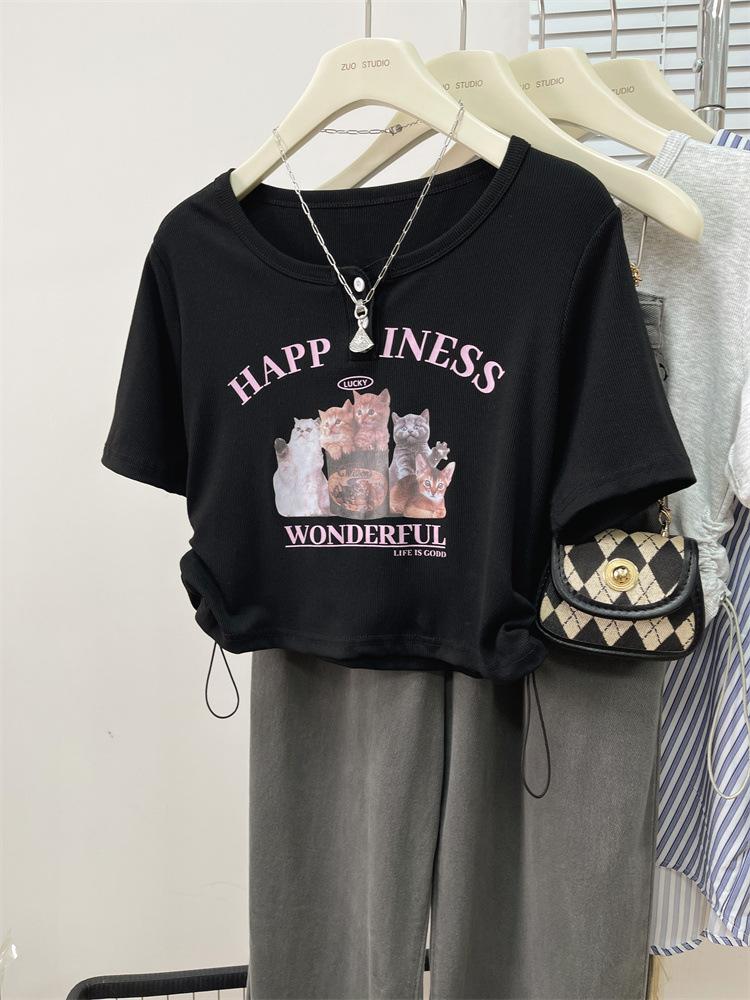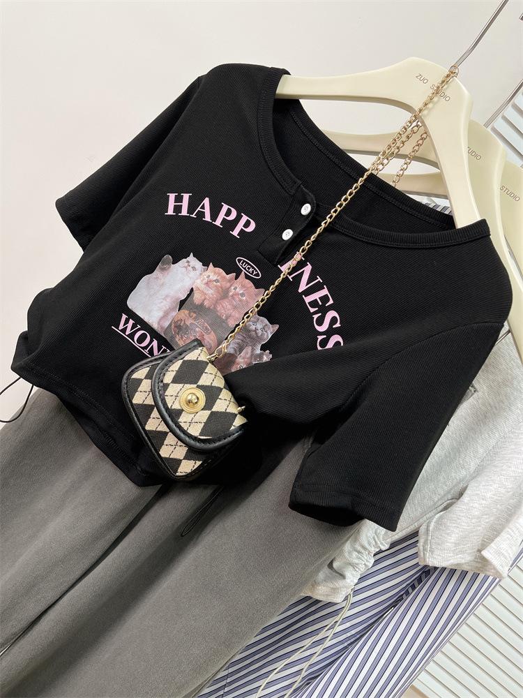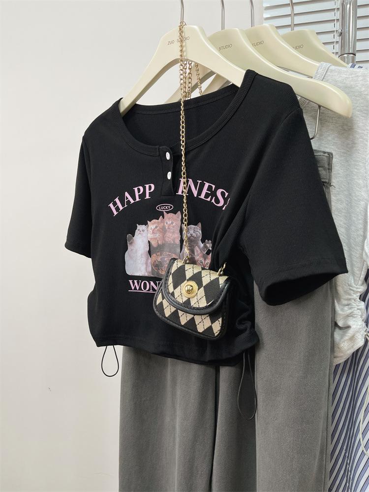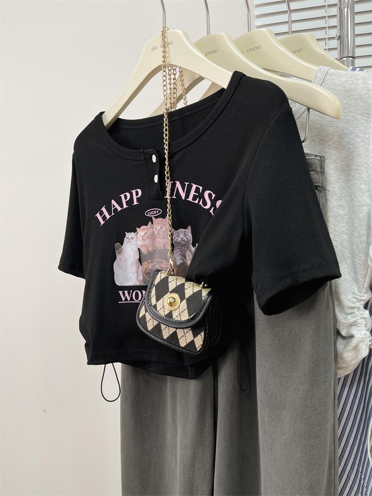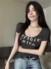 Camiseta de manga corta con hombros descubiertos para mujer, diseño de verano 2024, estilo nicho americano, con estampado dulce y sexy, corte ajustado y corto.