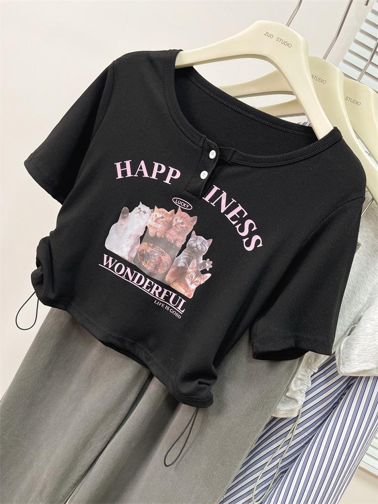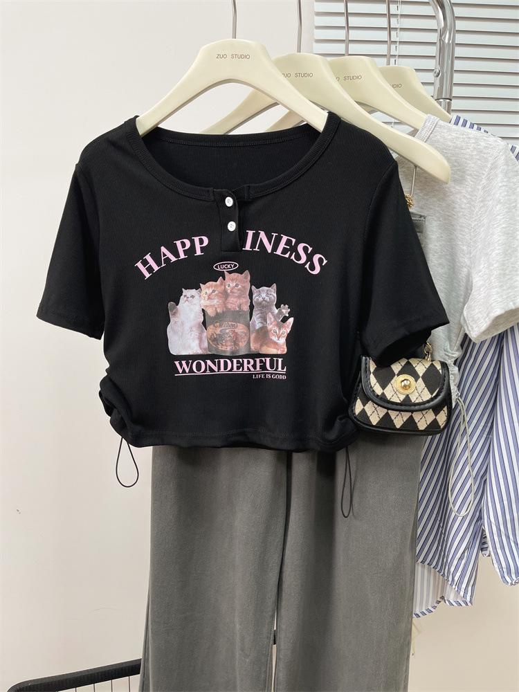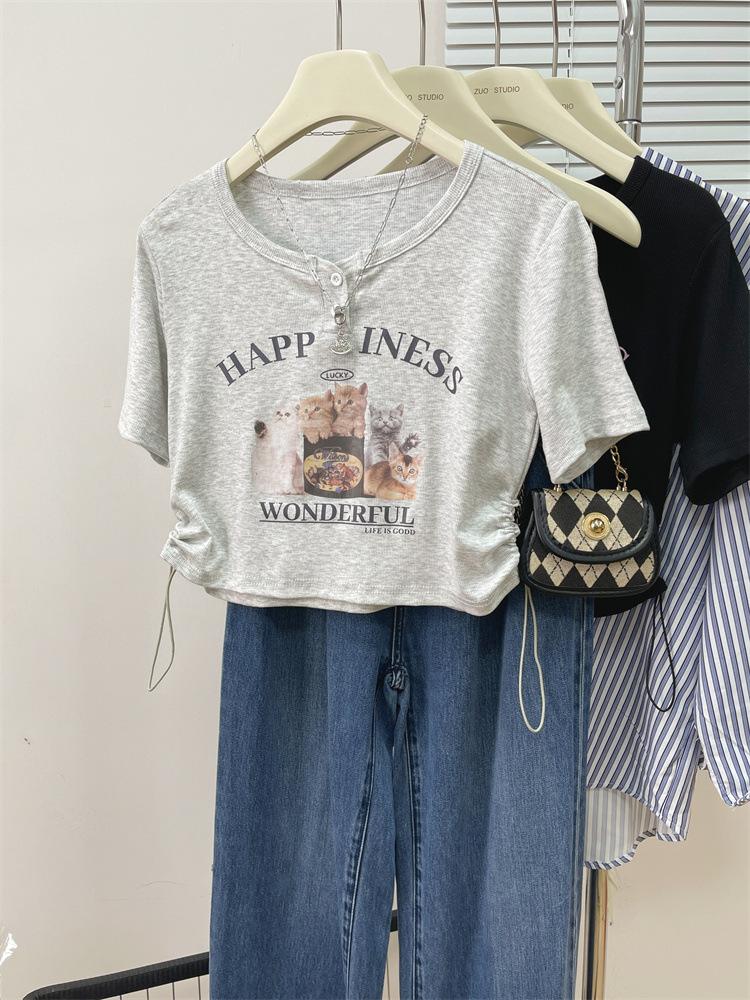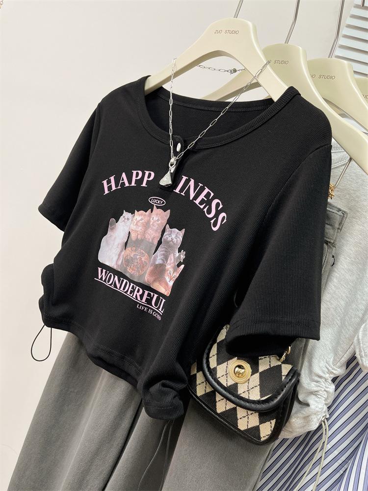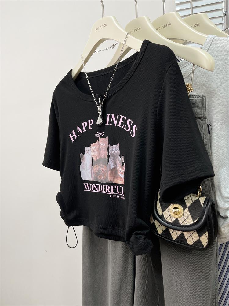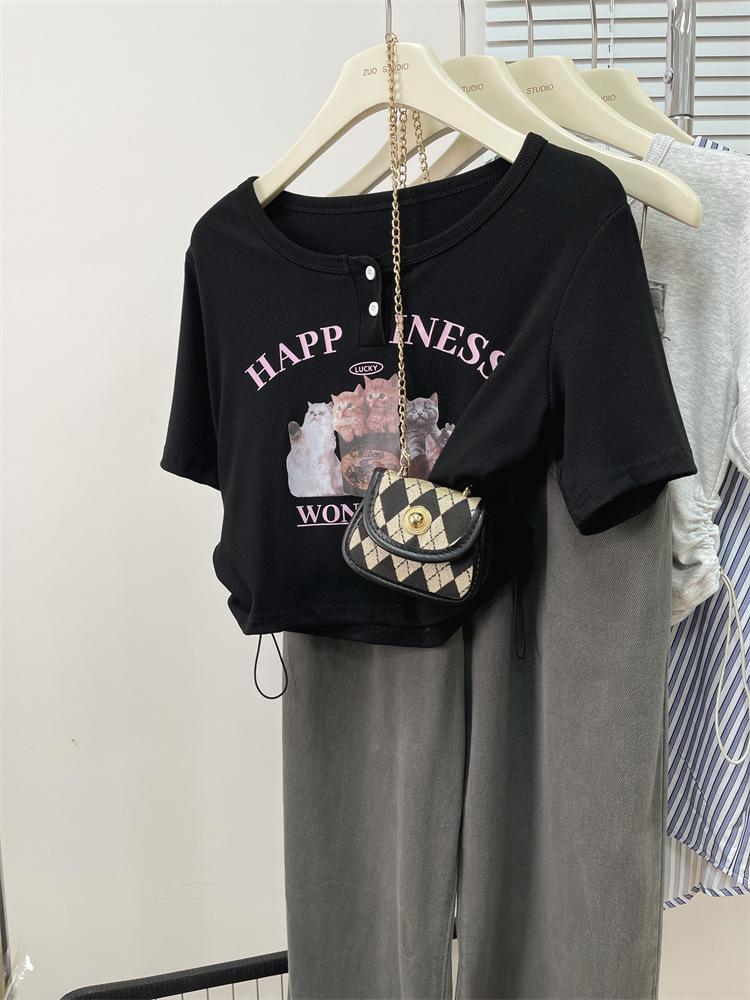 Camiseta de manga corta con hombros descubiertos para mujer, diseño de verano 2024, estilo nicho americano, con estampado dulce y sexy, corte ajustado y corto.