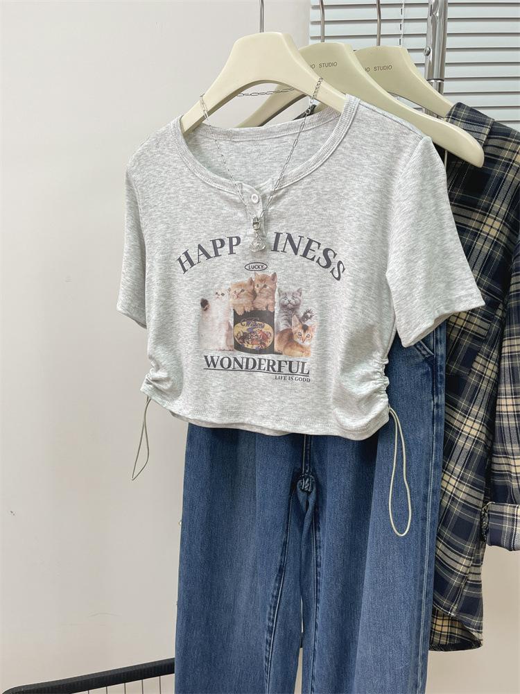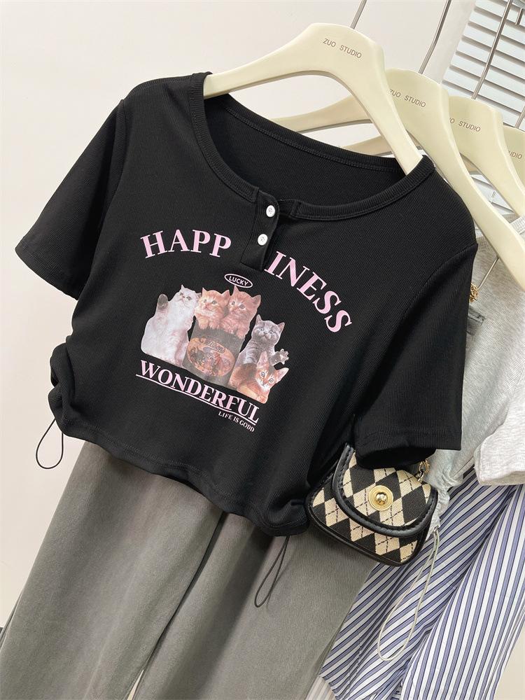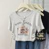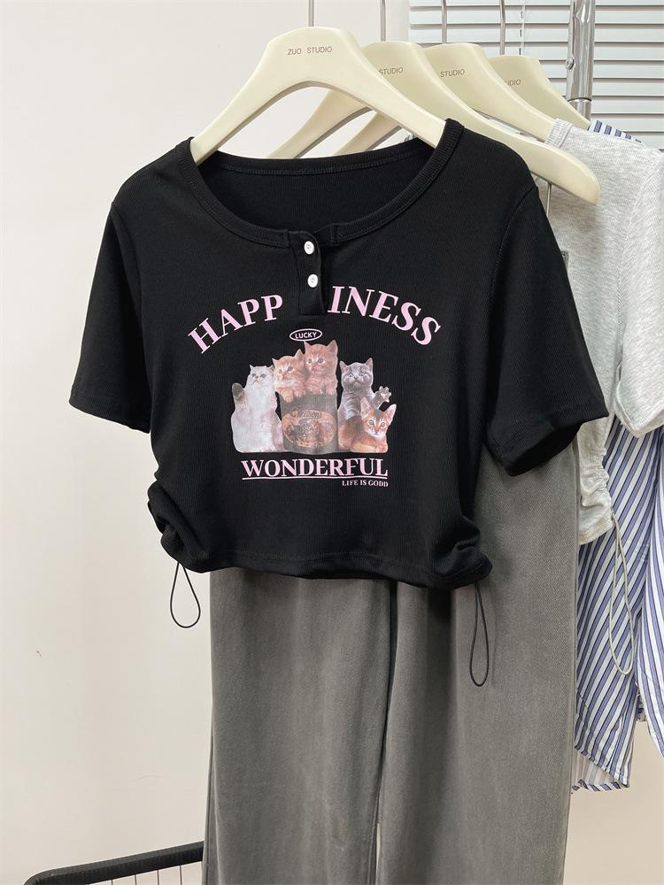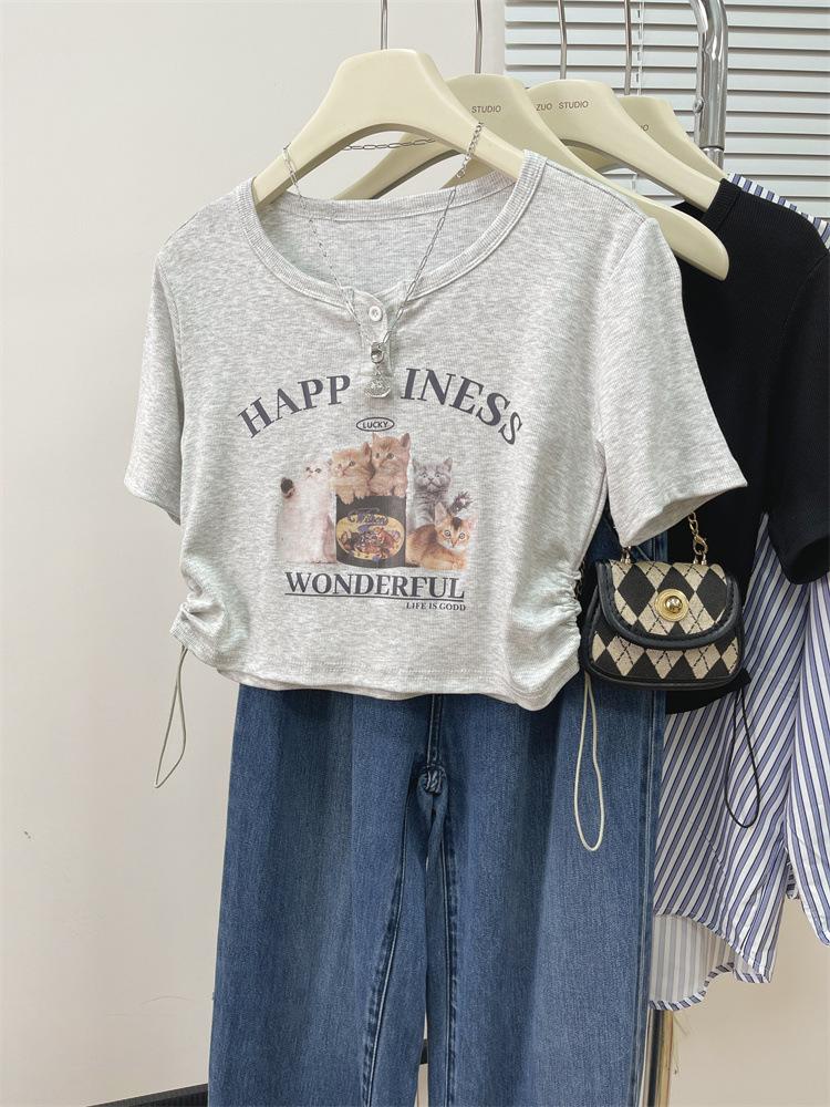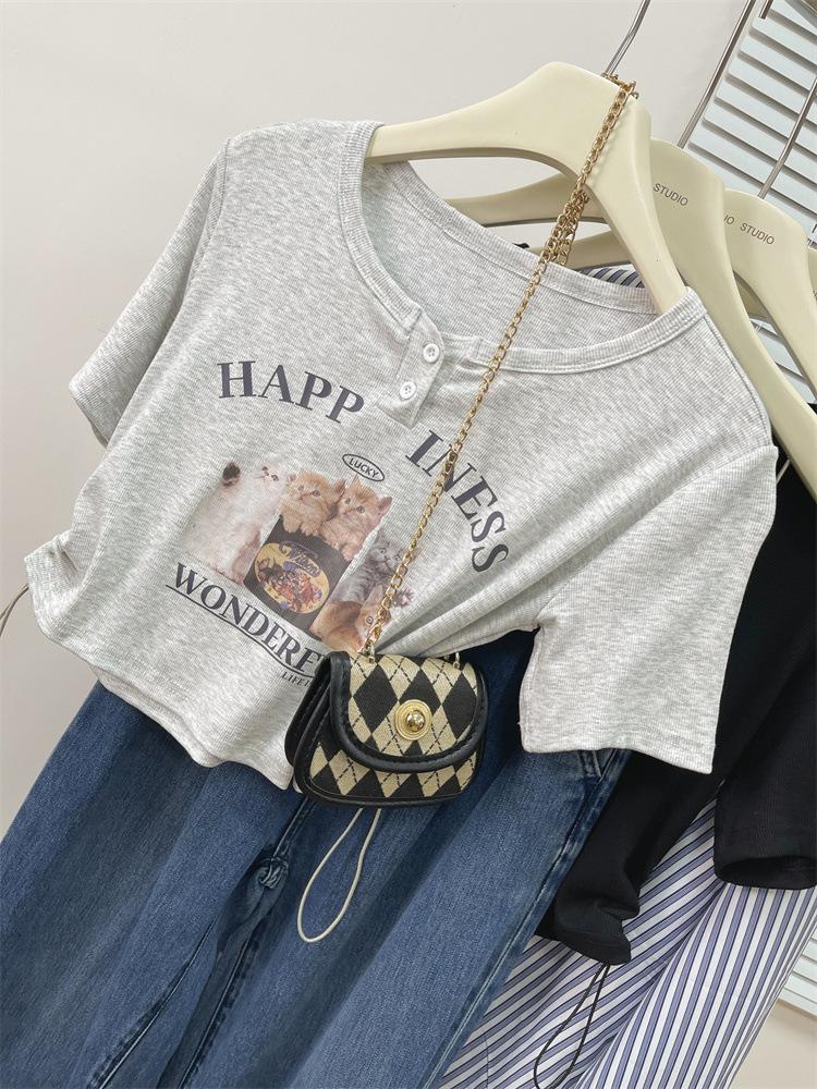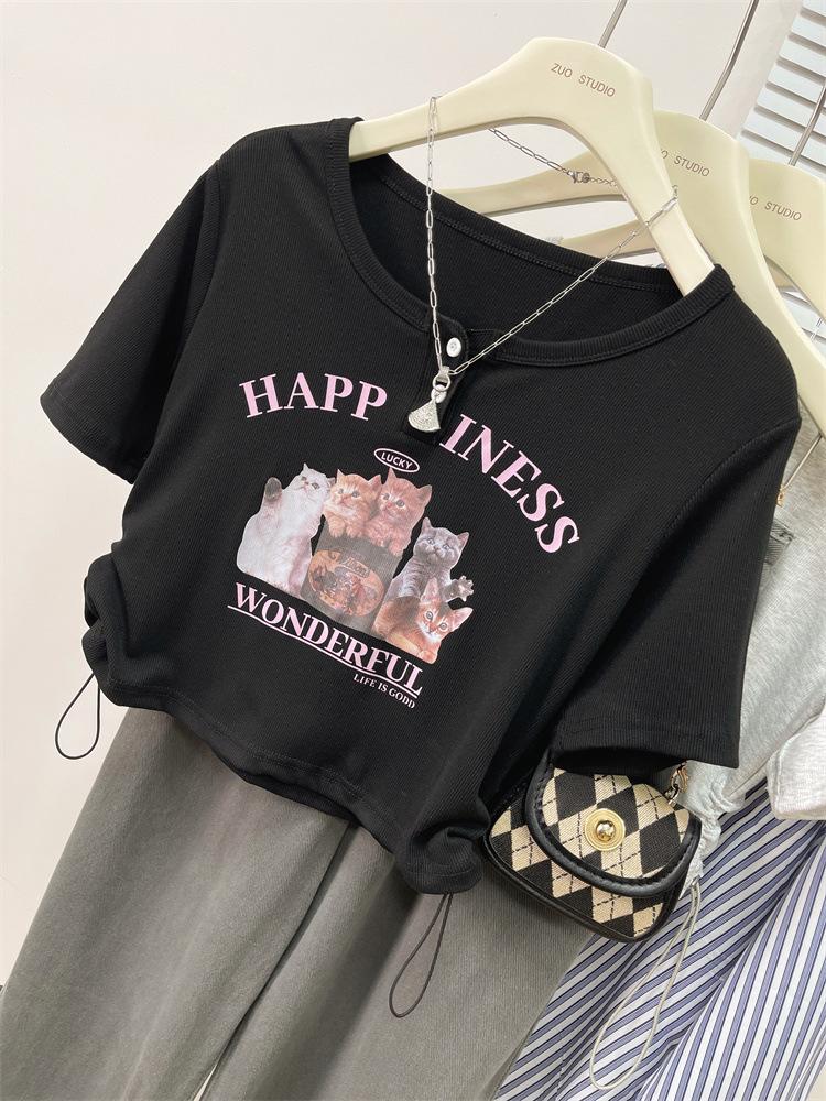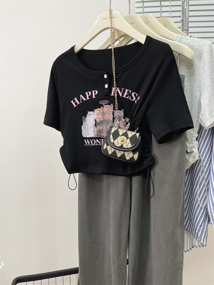 Camiseta de manga corta con hombros descubiertos para mujer, diseño de verano 2024, estilo nicho americano, con estampado dulce y sexy, corte ajustado y corto.