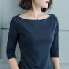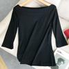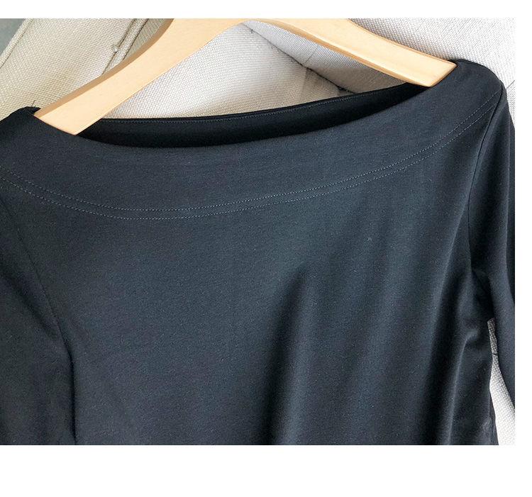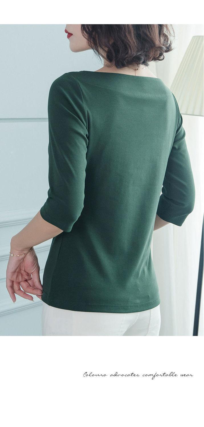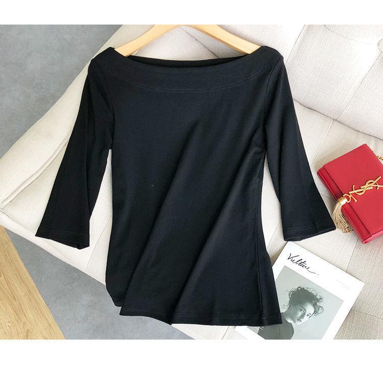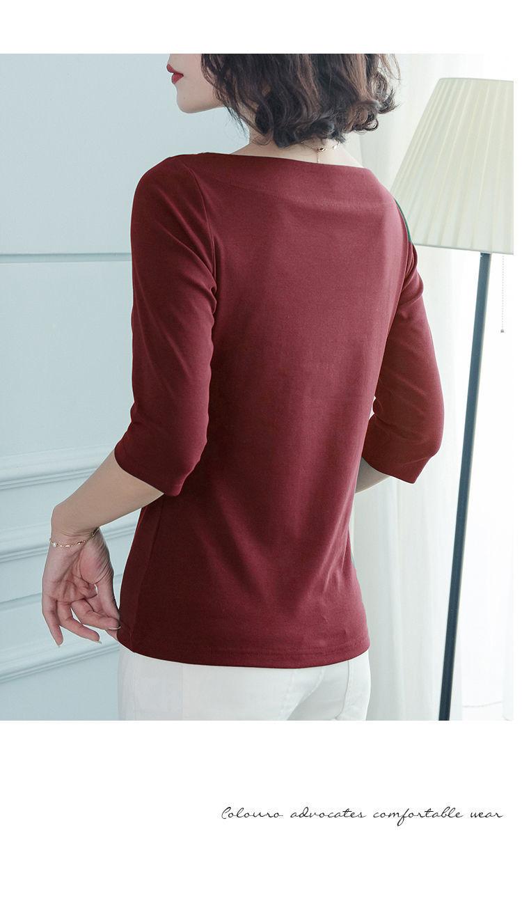 [Algodón puro] Camiseta de otoño con hombros descubiertos, color liso, ajustada, para mujer, de siete mangas