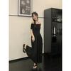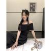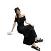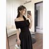 SODaZZZ Vestido negro de un solo hombro para mujer Nuevo vestido de línea A elegante casual estilo Hepburn falda larga