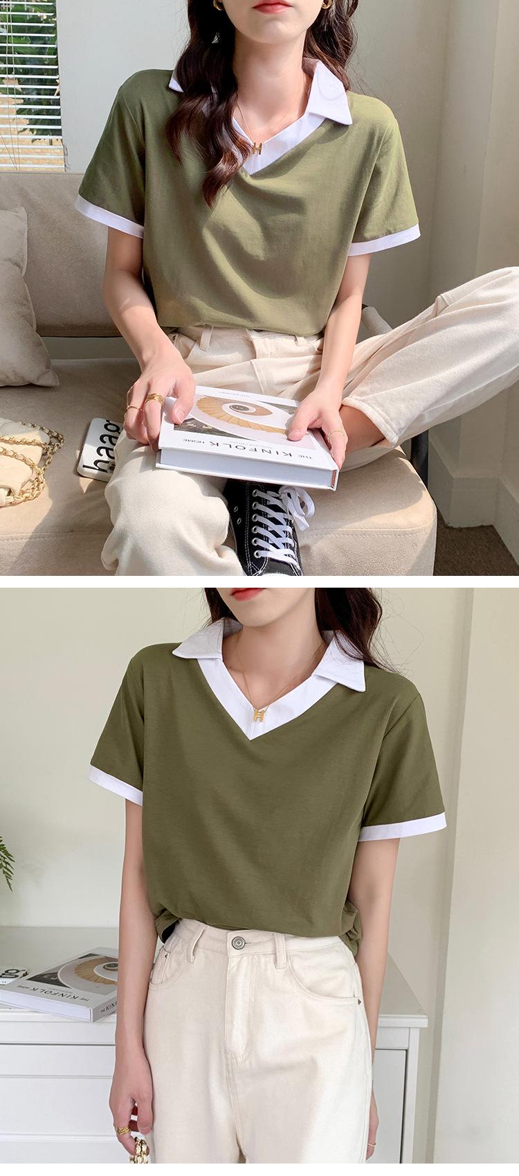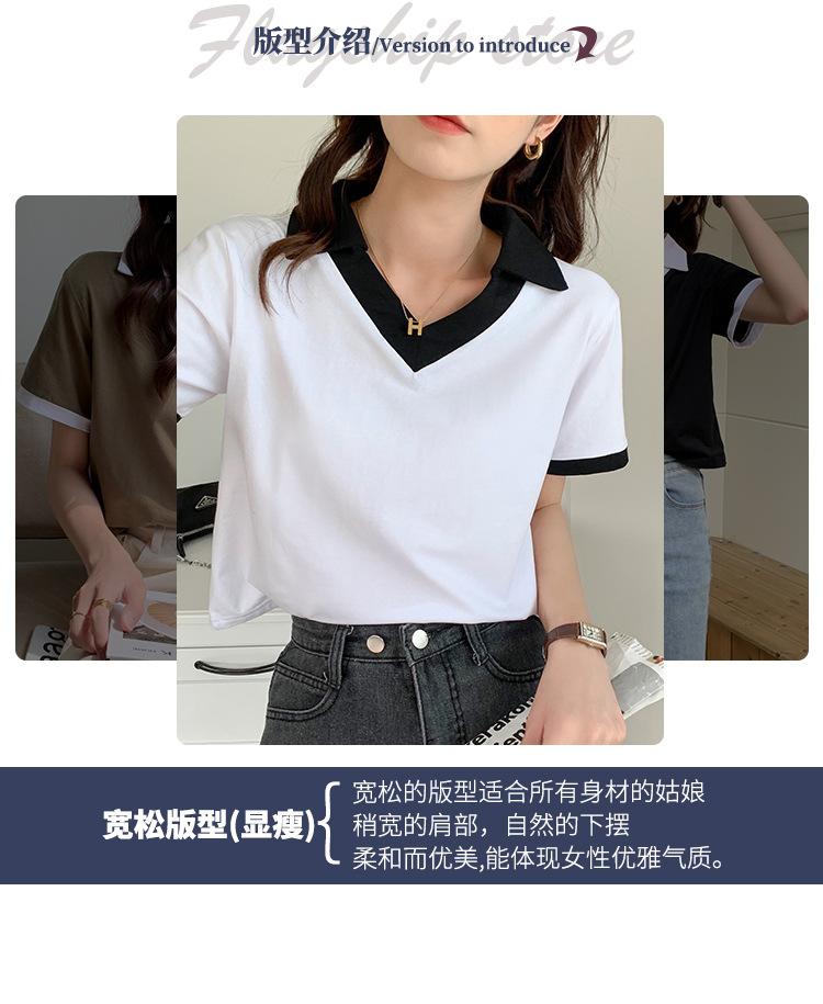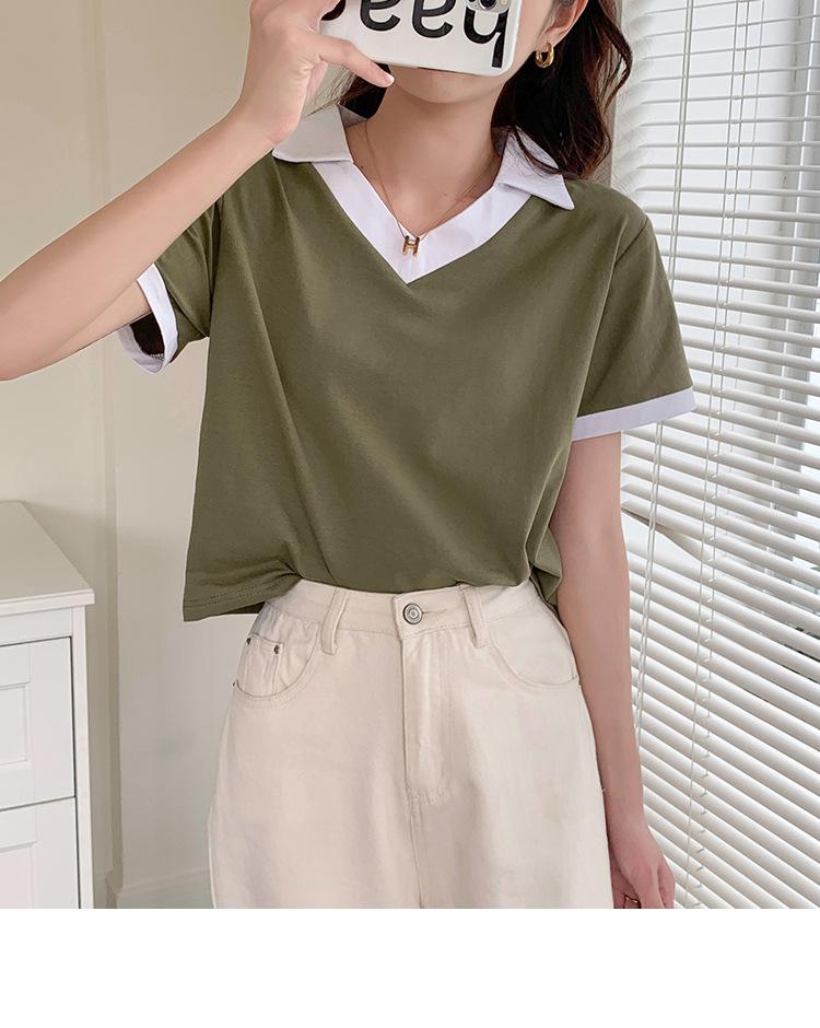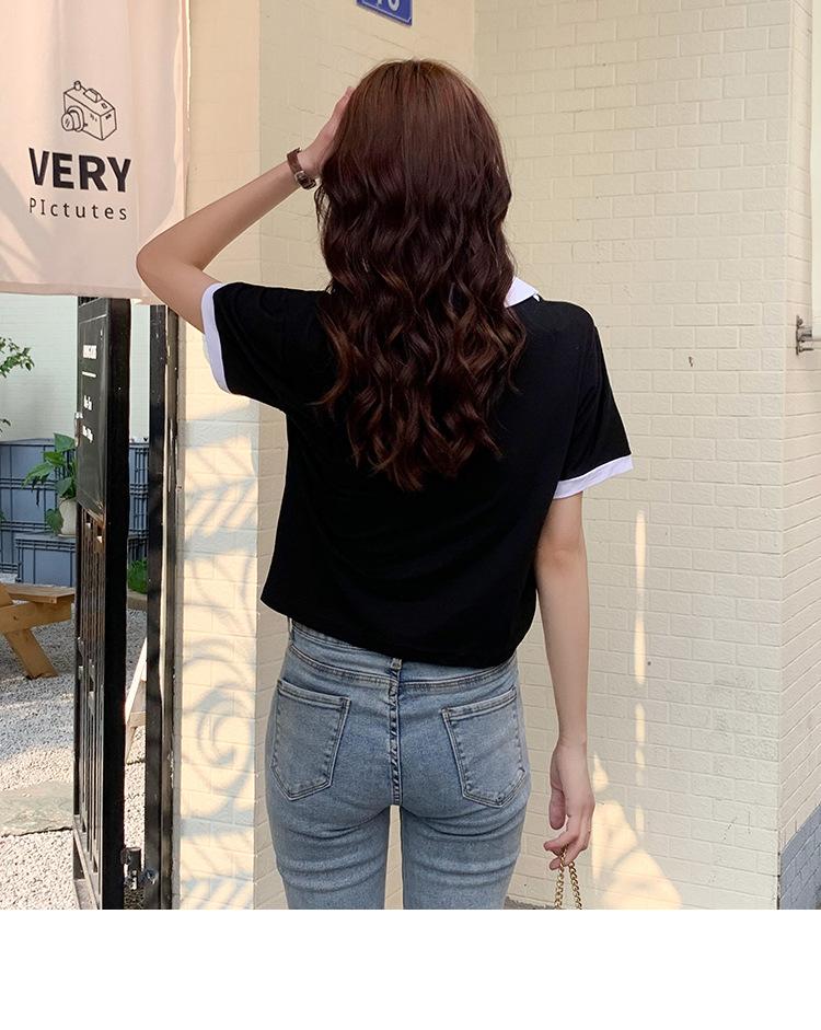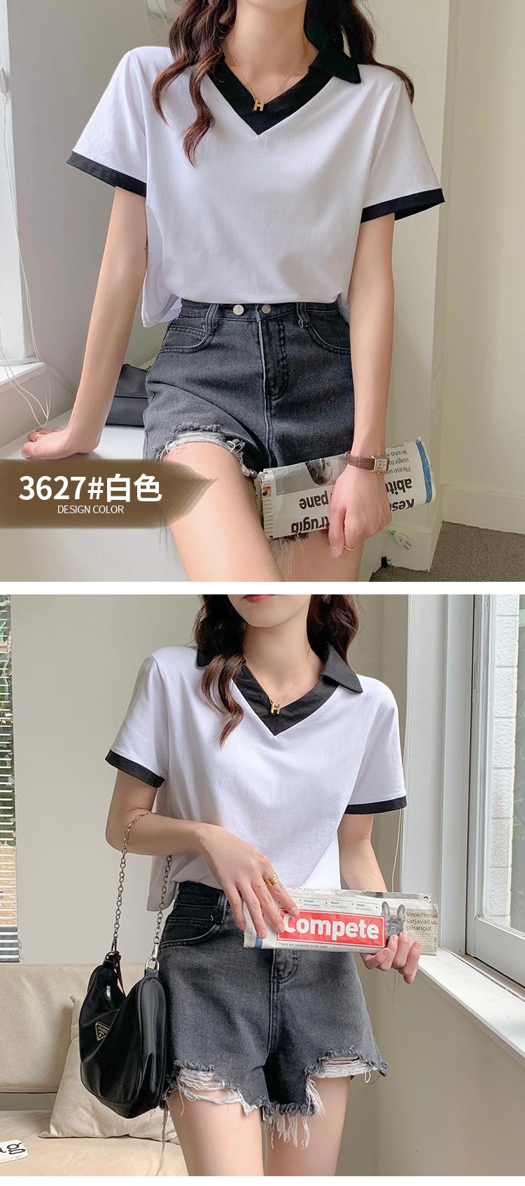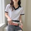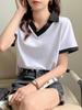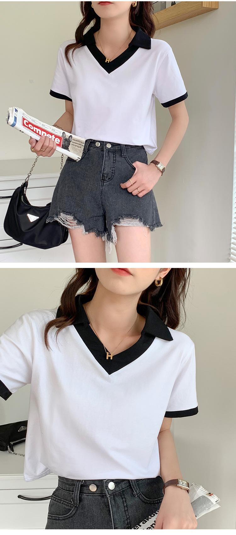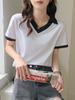 Verano 2024 95% Algodón Puro Cuello en V Hombro Regular Manga Corta Camiseta para Mujer Cintura Alta Corta Patchwork Manga Media Top Marca de Moda