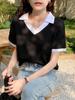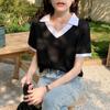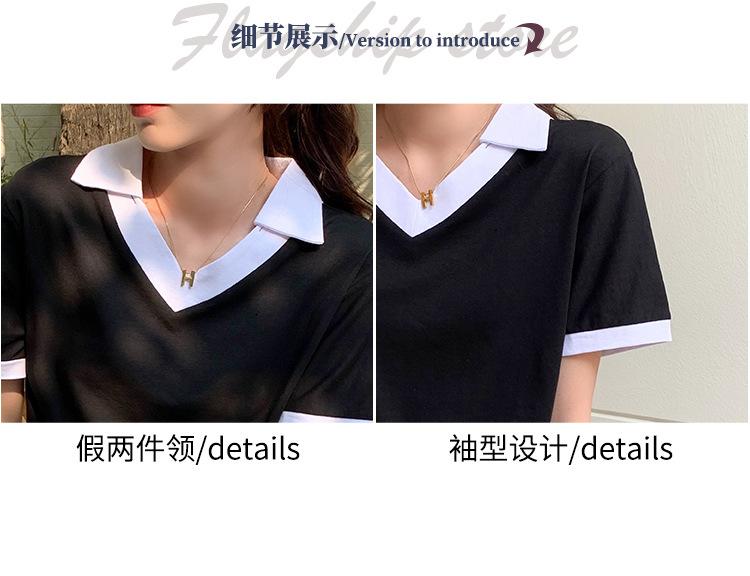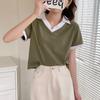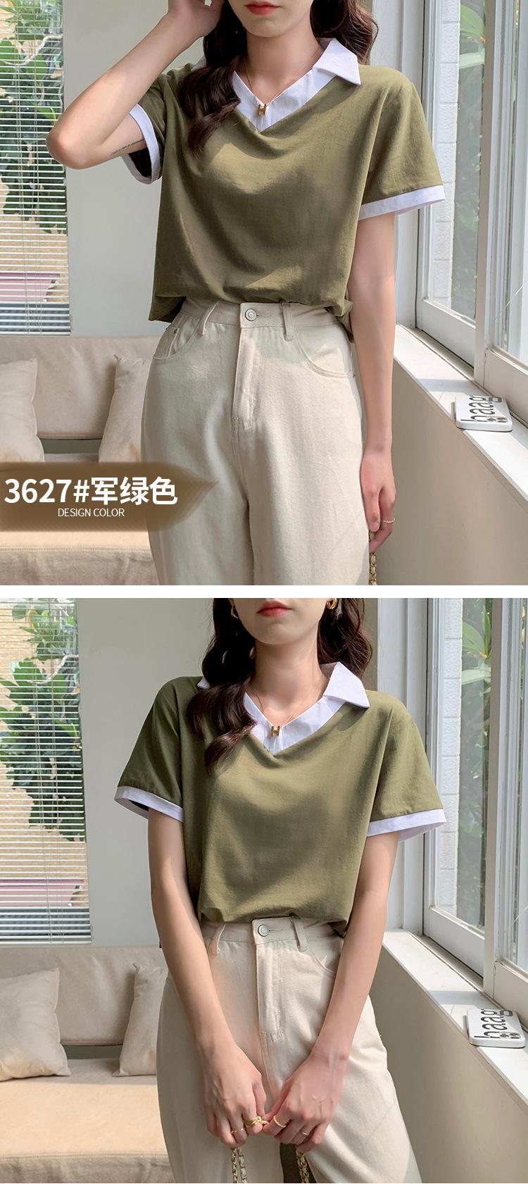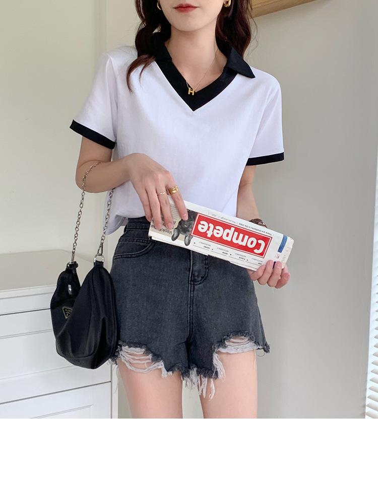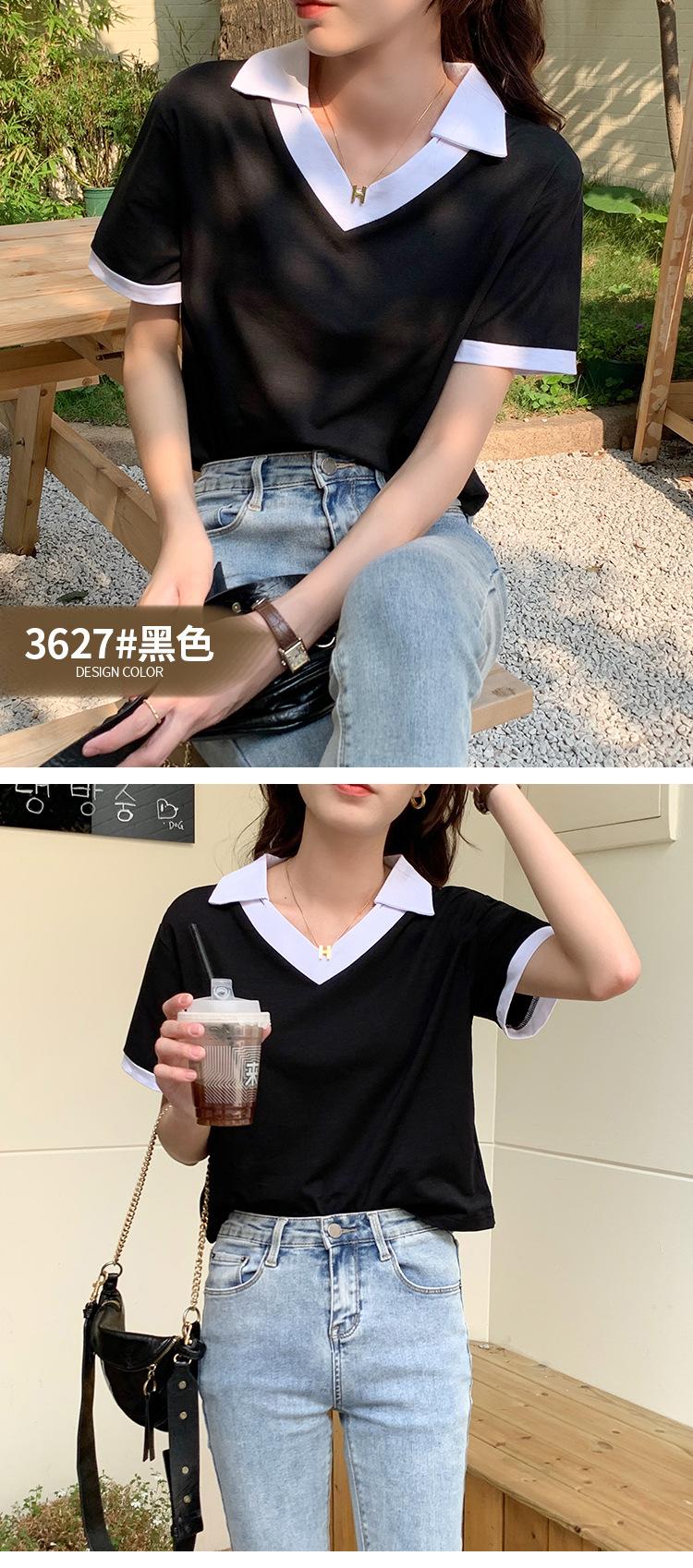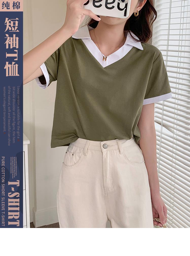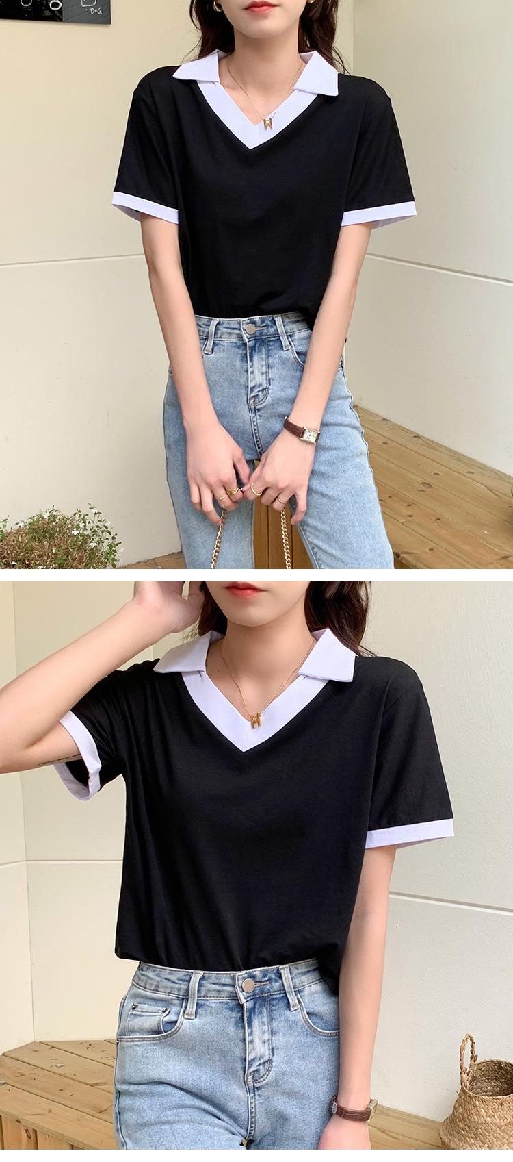 Verano 2024 95% Algodón Puro Cuello en V Hombro Regular Manga Corta Camiseta para Mujer Cintura Alta Corta Patchwork Manga Media Top Marca de Moda
