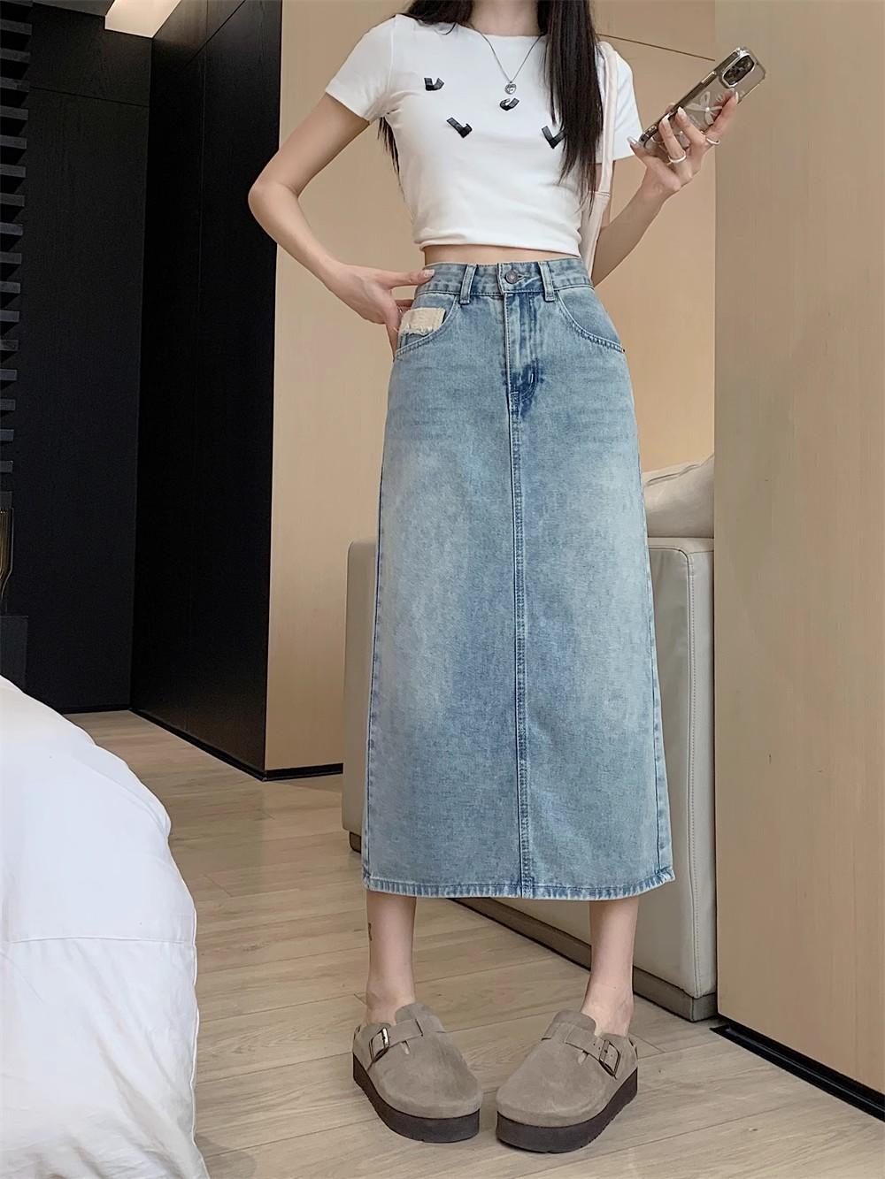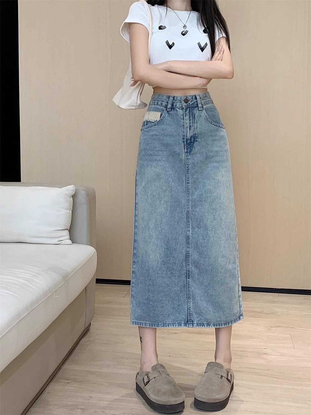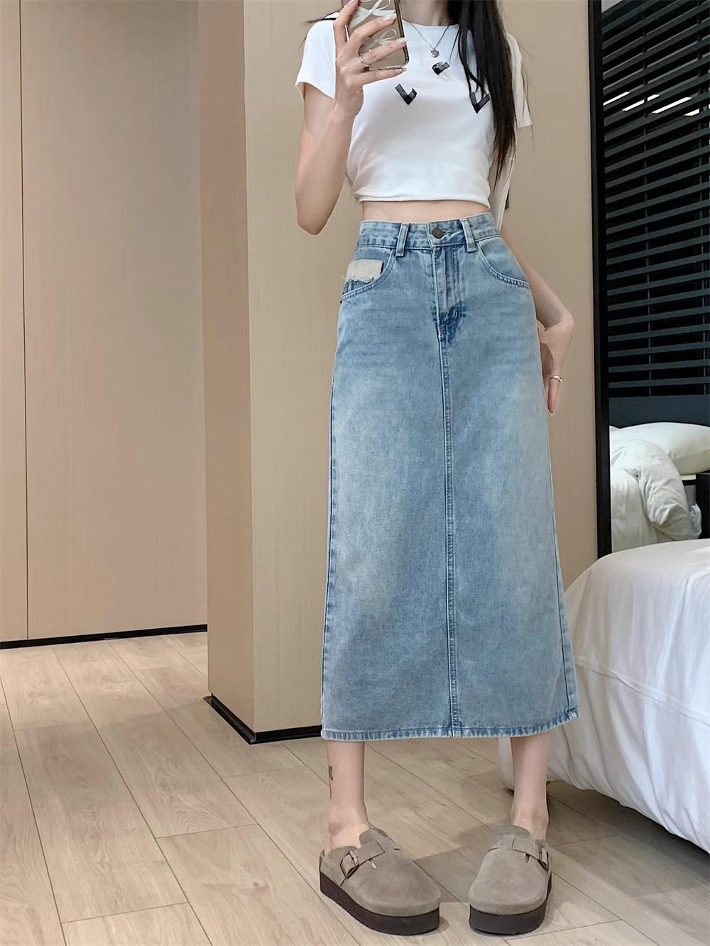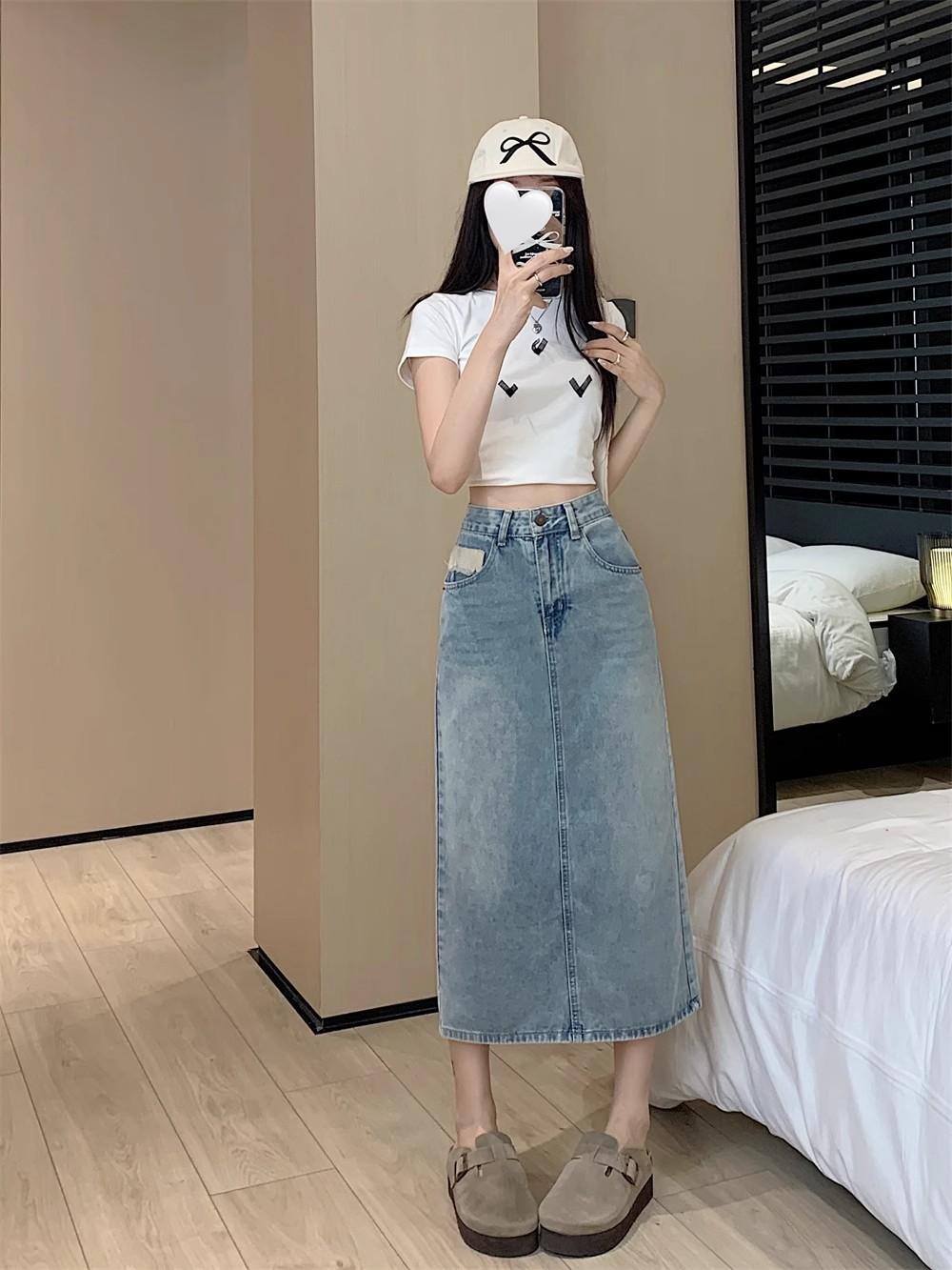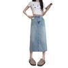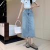 2024 Nueva Falda Vaquera de Verano de Cintura Alta con Corte en A para Mujer Talla Extra Gordo mm Aspecto Adelgazante Largo Medio Abertura Falda Cubre Caderas