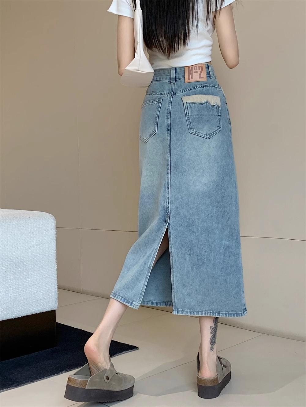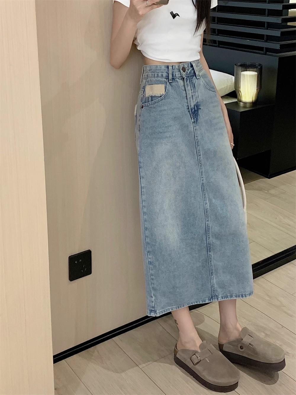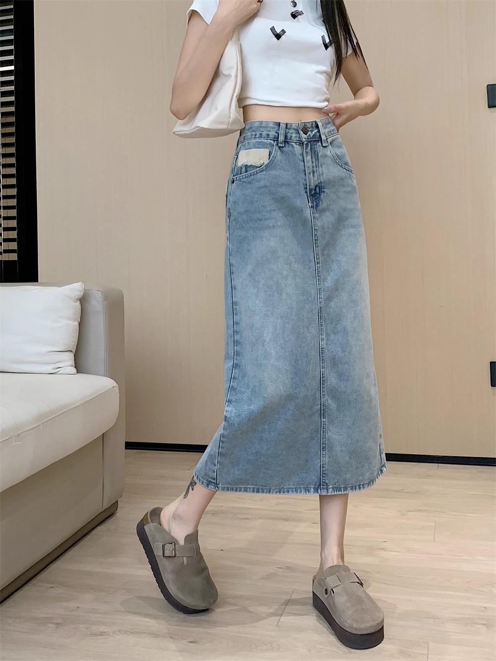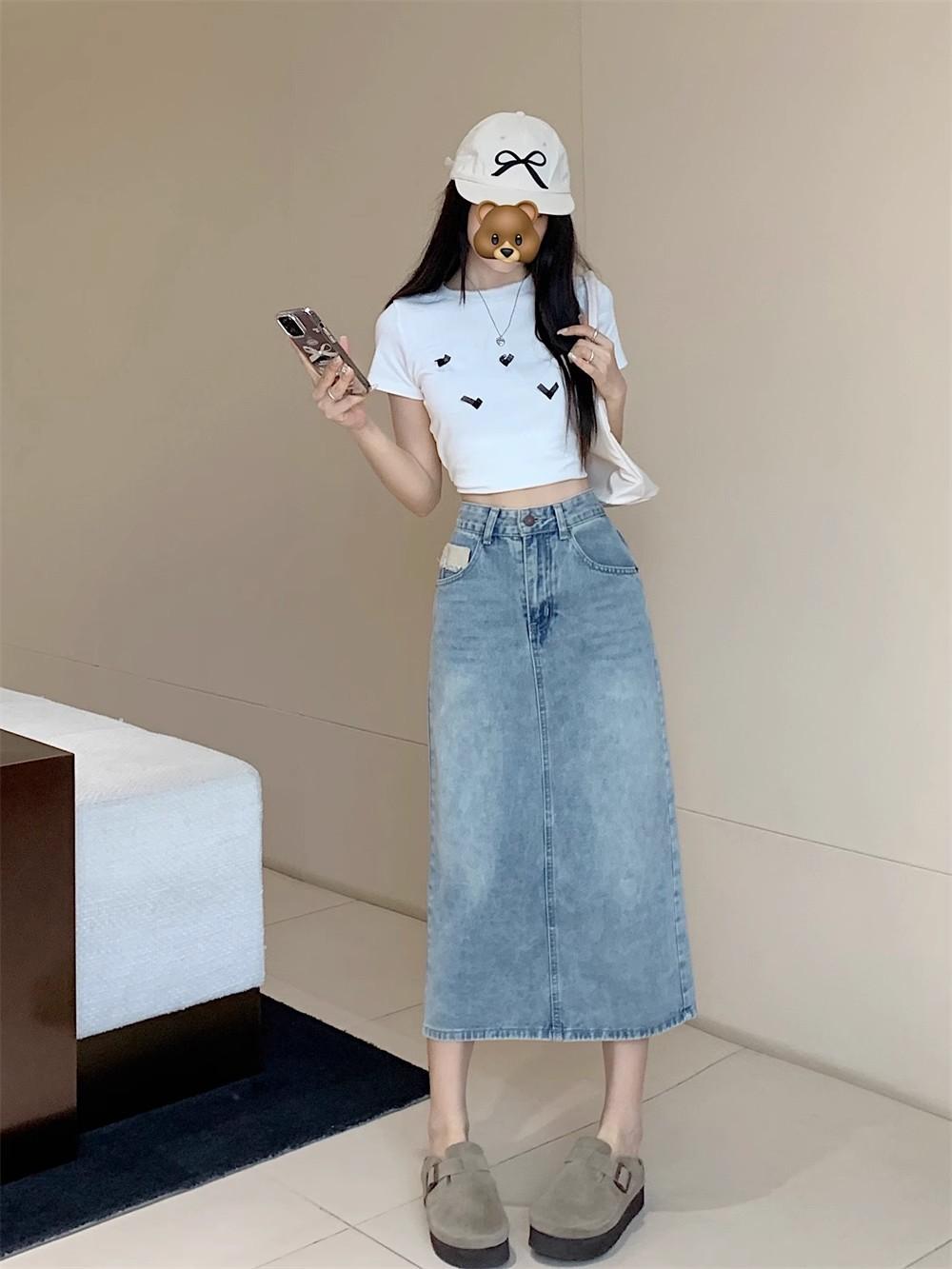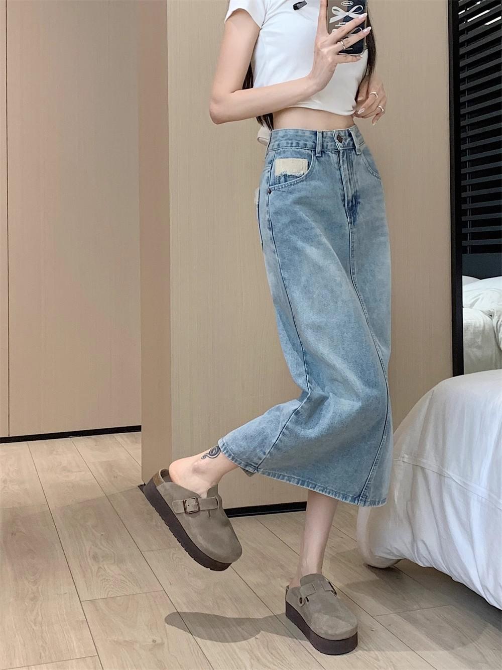 2024 Nueva Falda Vaquera de Verano de Cintura Alta con Corte en A para Mujer Talla Extra Gordo mm Aspecto Adelgazante Largo Medio Abertura Falda Cubre Caderas