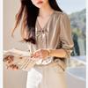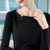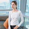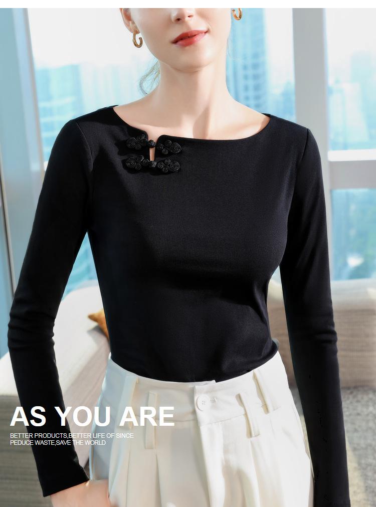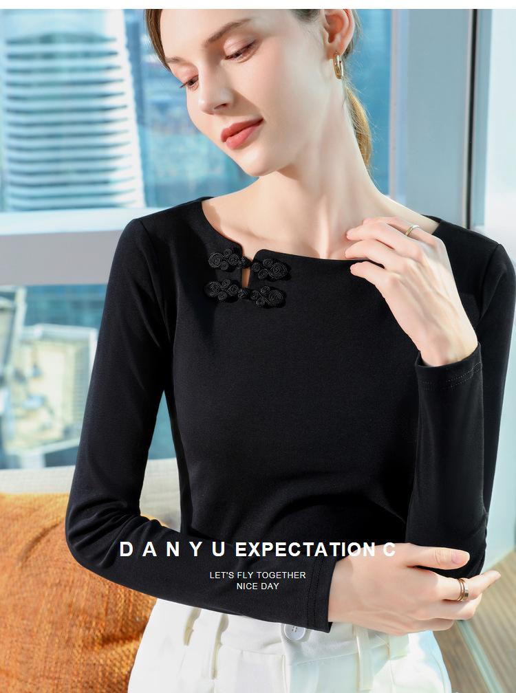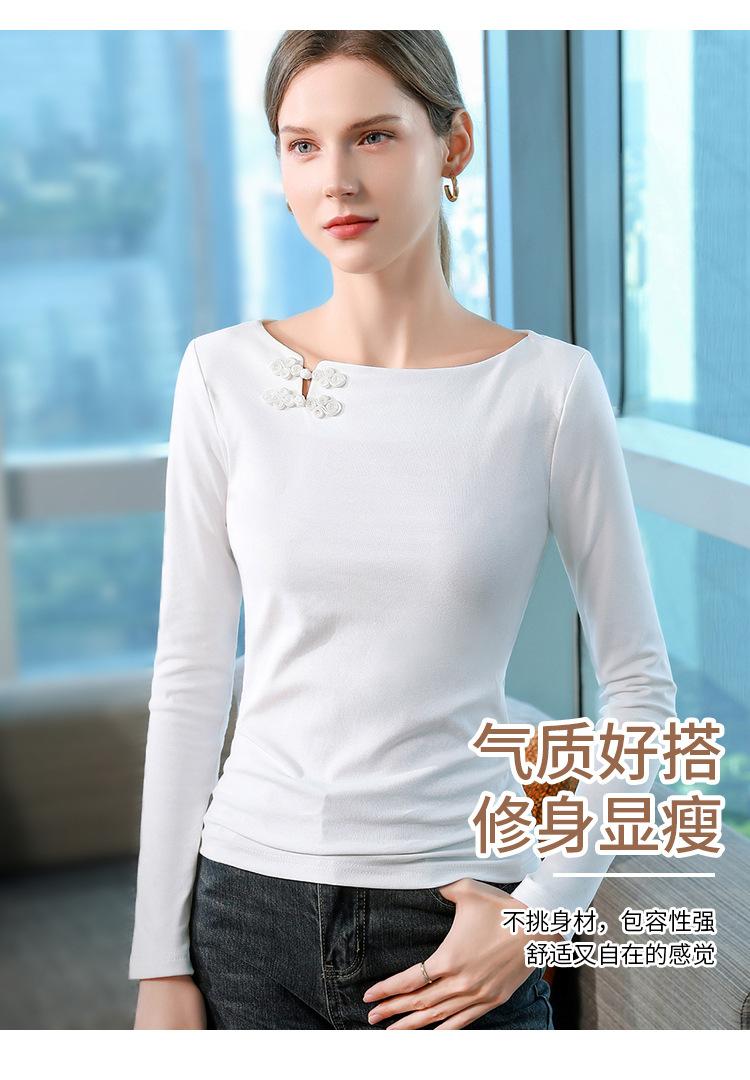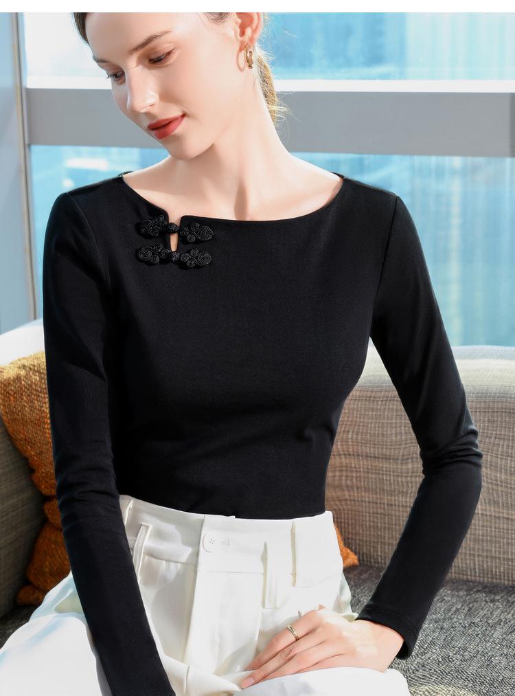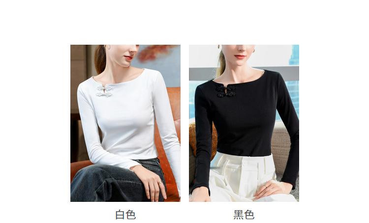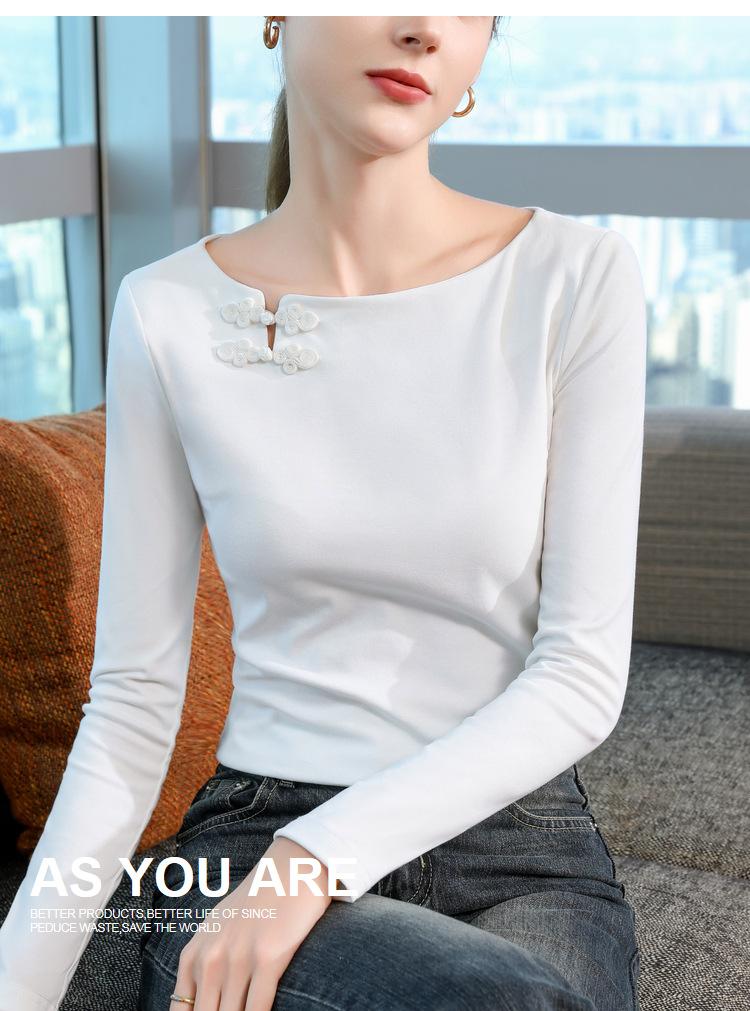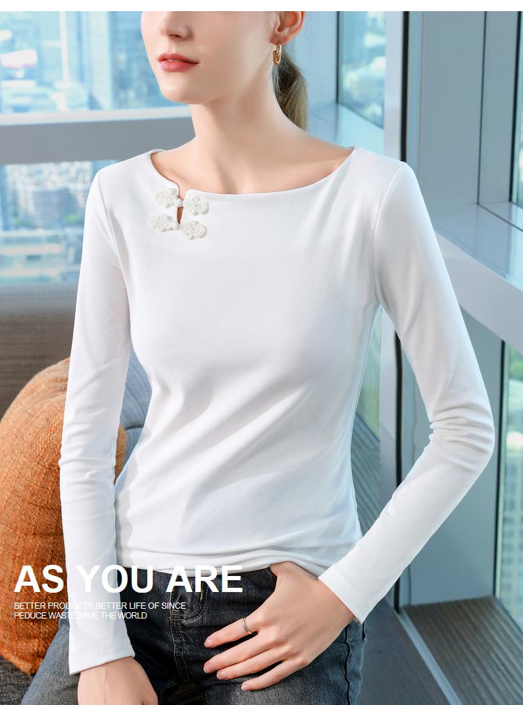 Nueva blusa de estilo chino con cuello de una palabra 2024, nueva camisa básica blanca de manga larga con hombros descubiertos y hebilla de estilo nacional para otoño e invierno, ropa para mujer