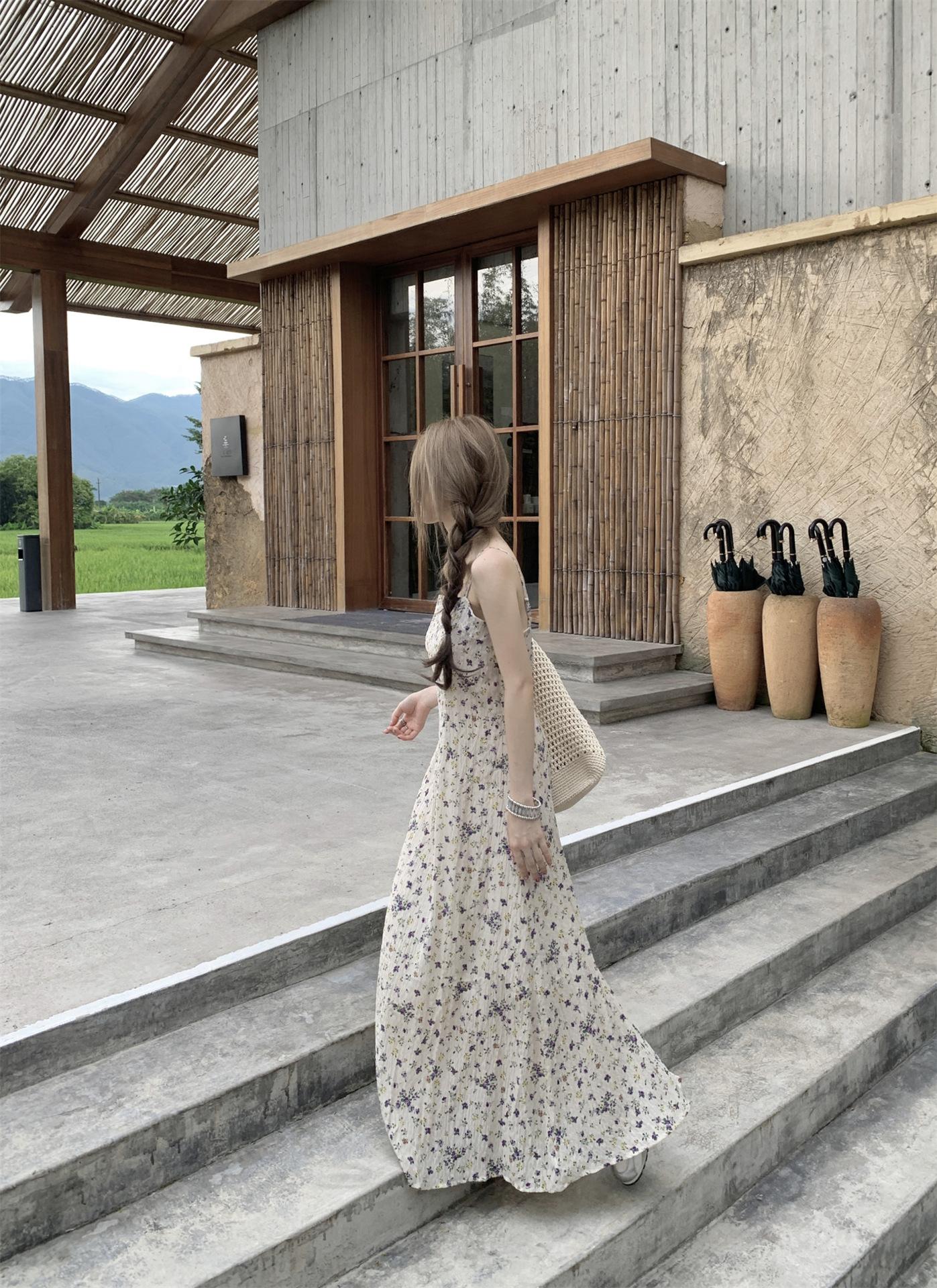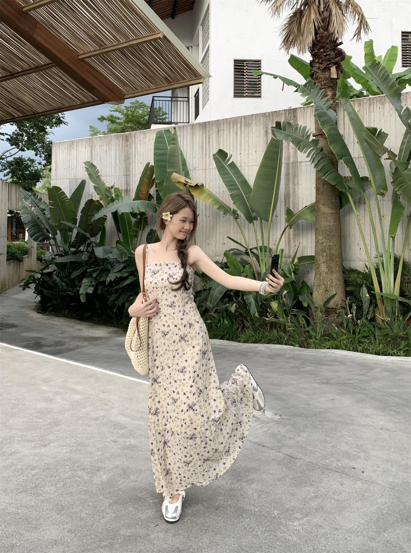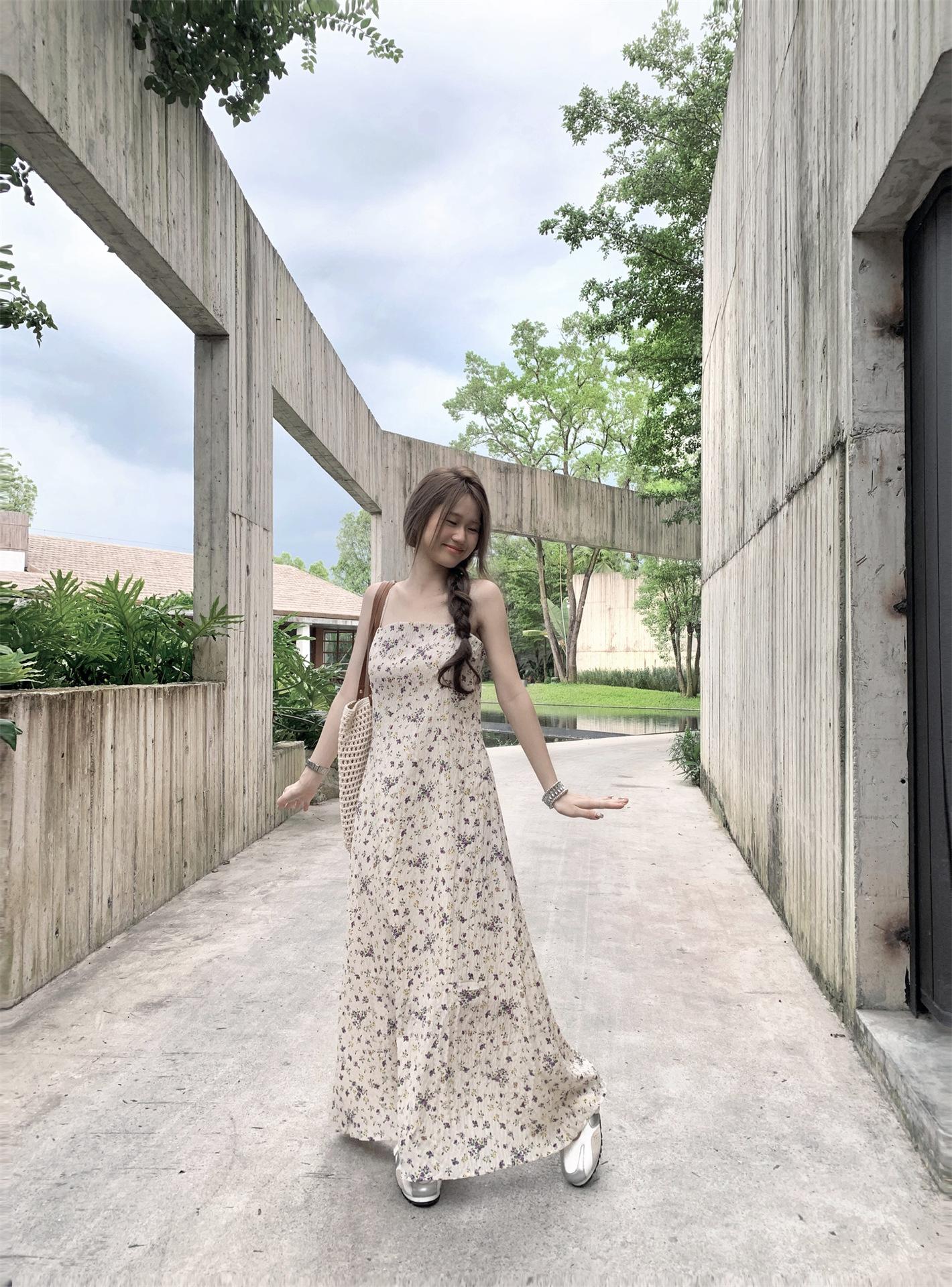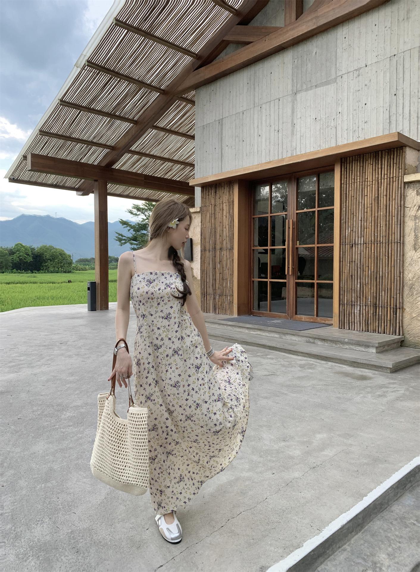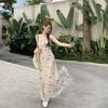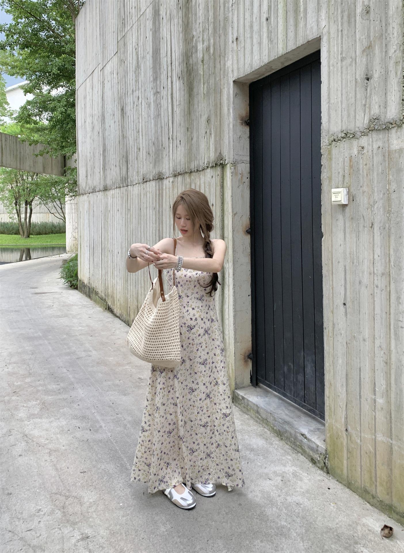 Talla Grande Estilo Francés Estilo Femenino Look Adelgazante Vestido Floral con Tirantes Verano Blanco Dulce Pequeño Fresco Línea A Falda Larga