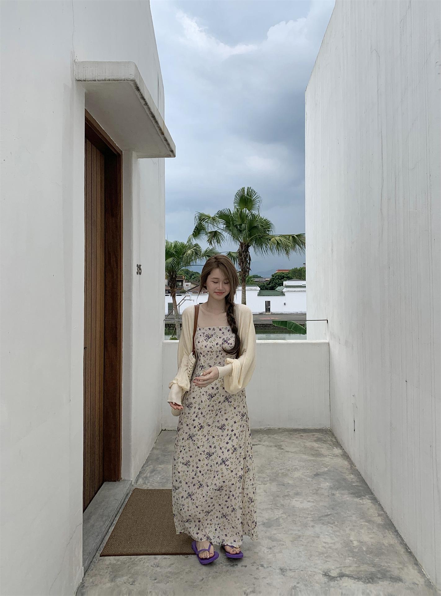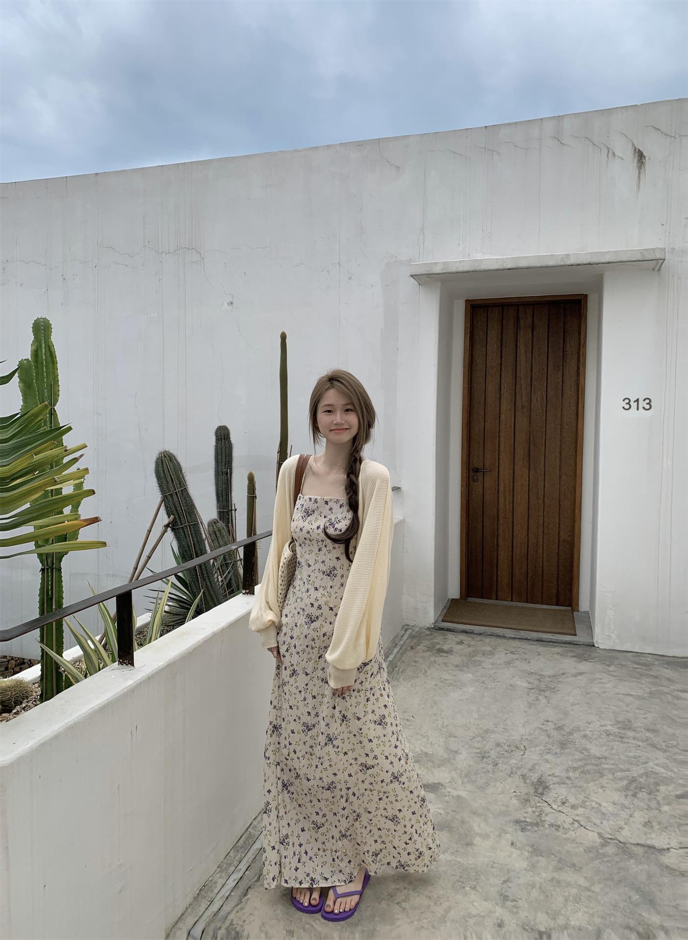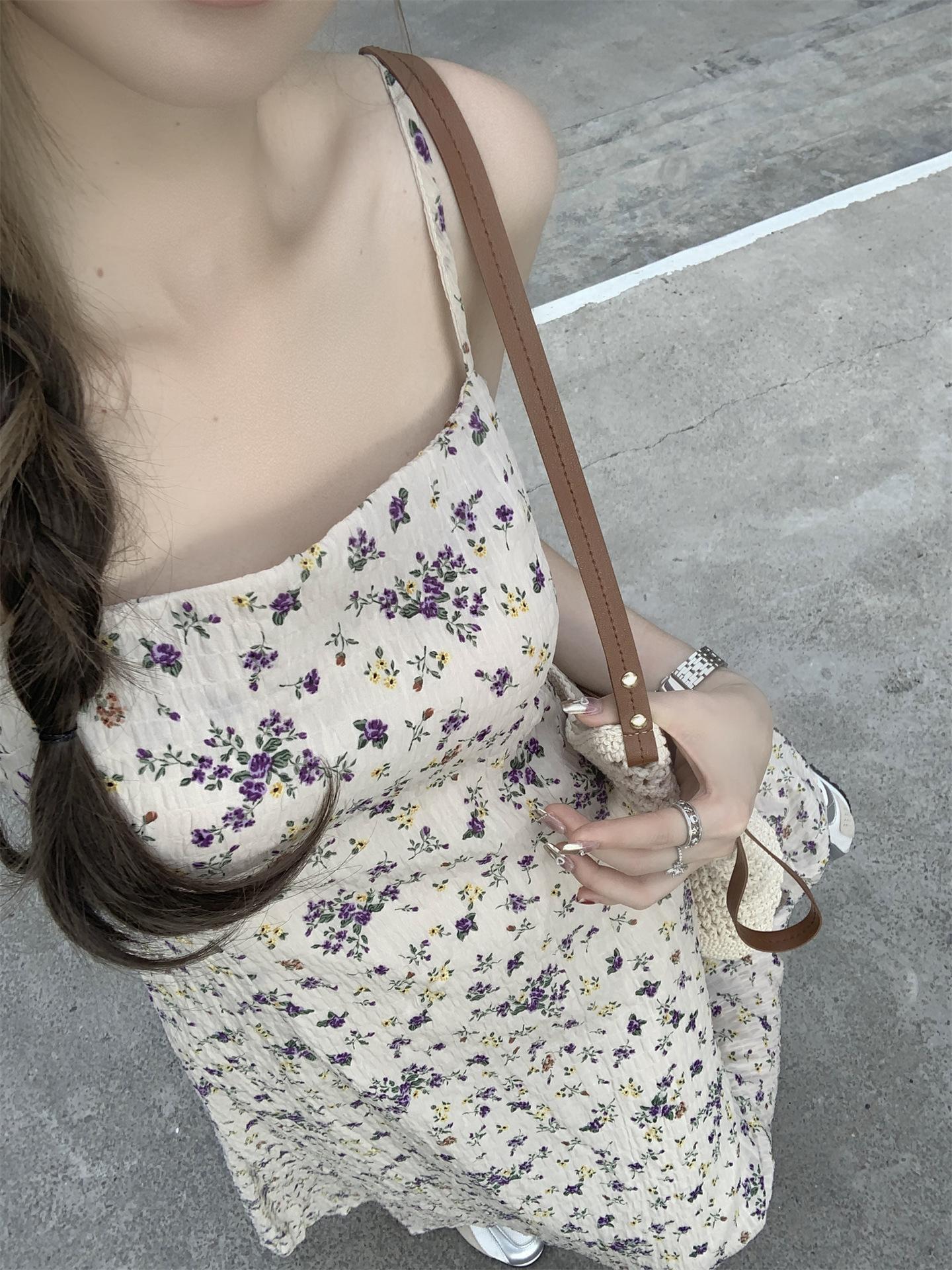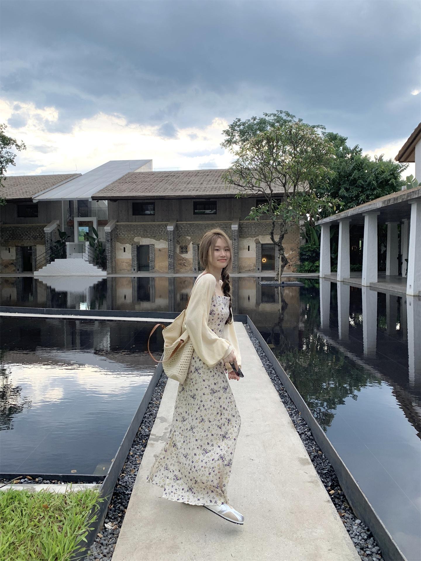 Talla Grande Estilo Francés Estilo Femenino Look Adelgazante Vestido Floral con Tirantes Verano Blanco Dulce Pequeño Fresco Línea A Falda Larga