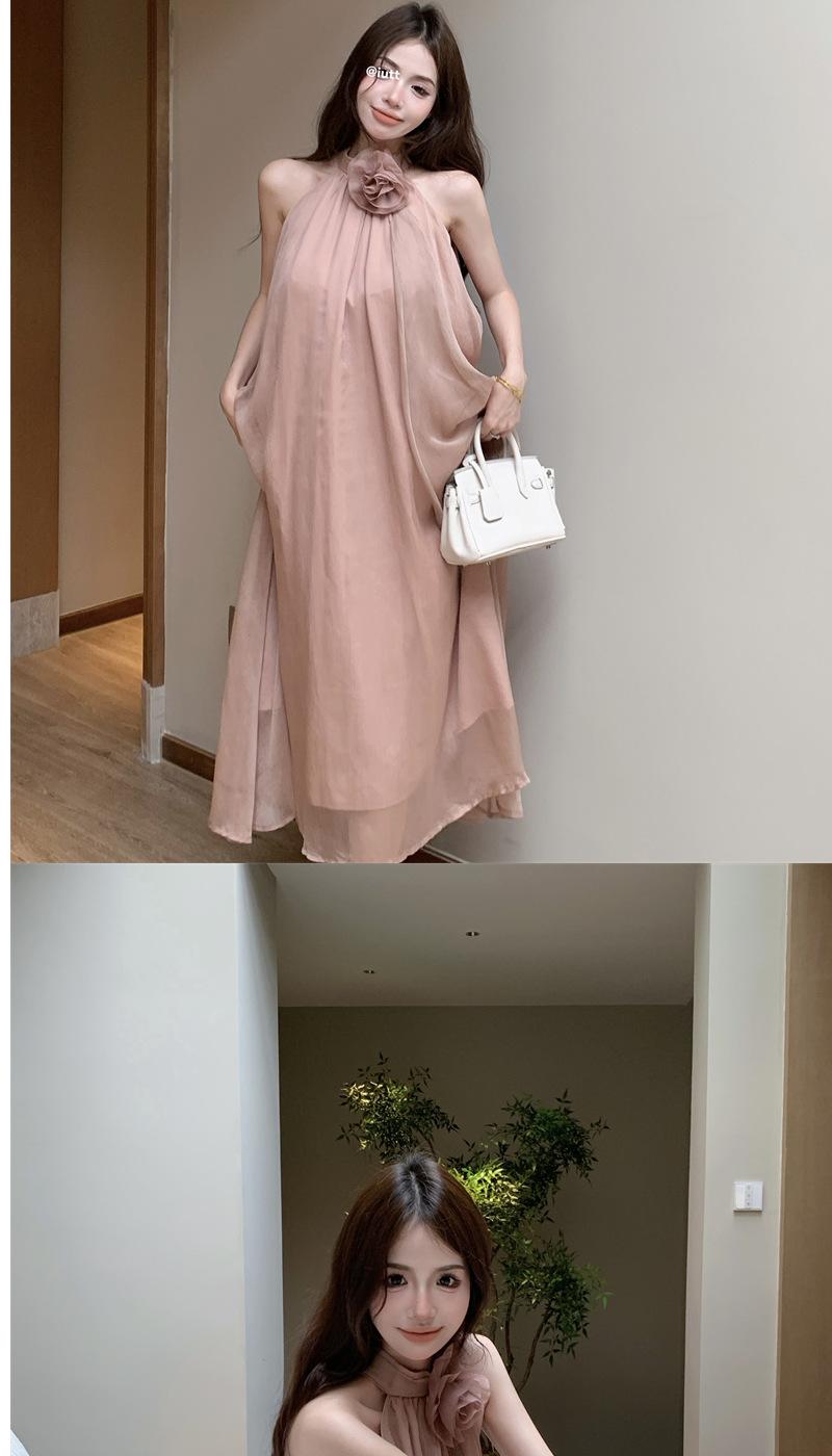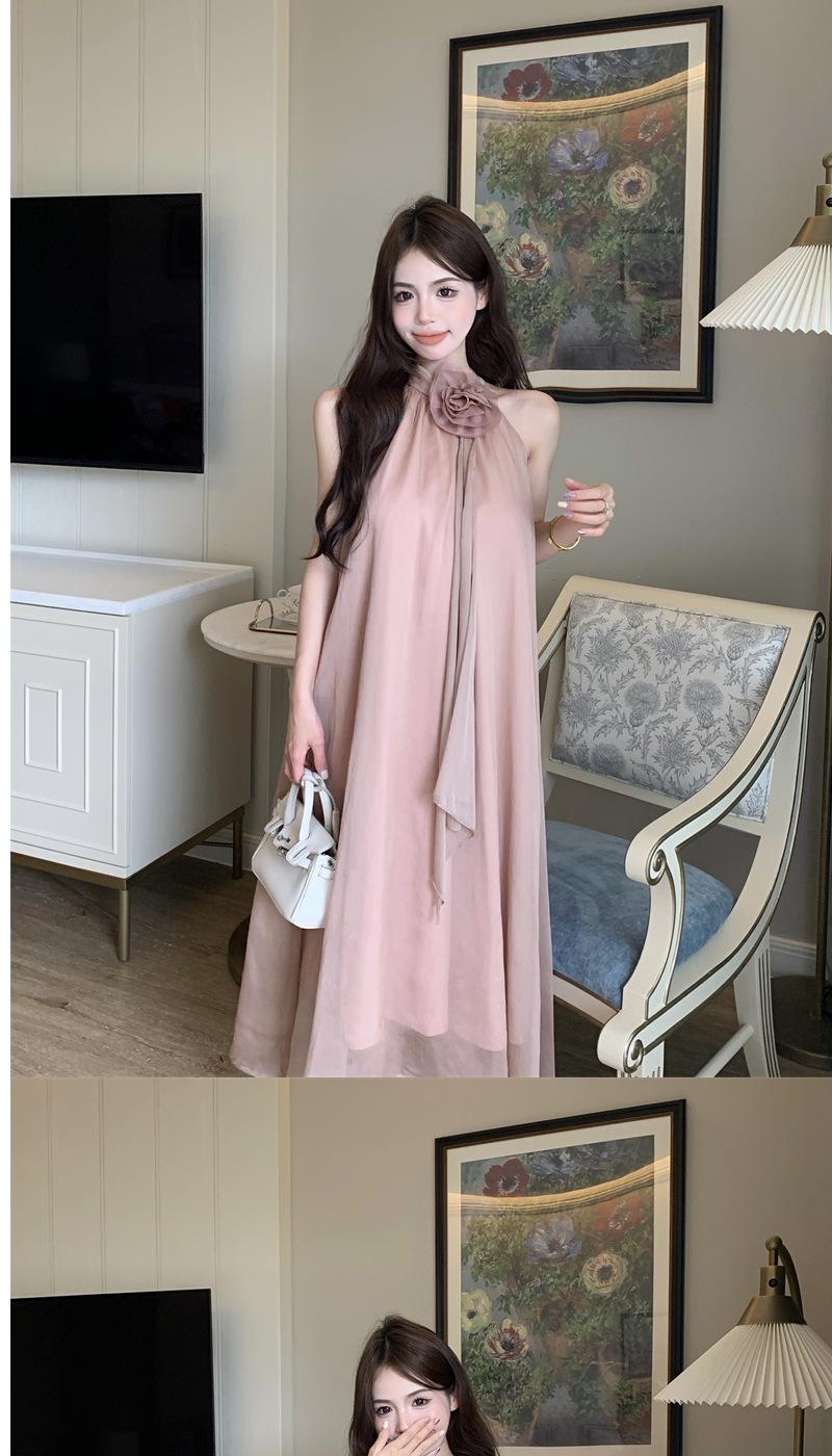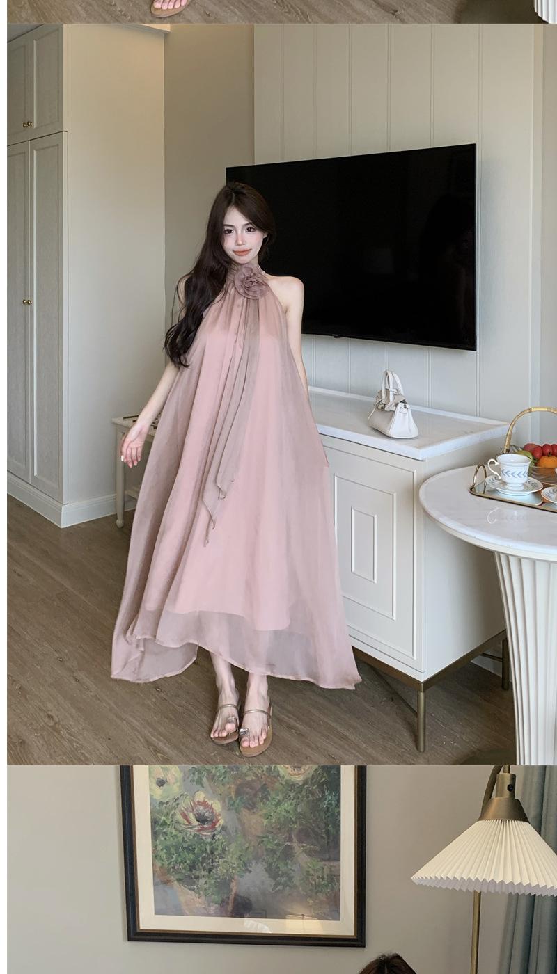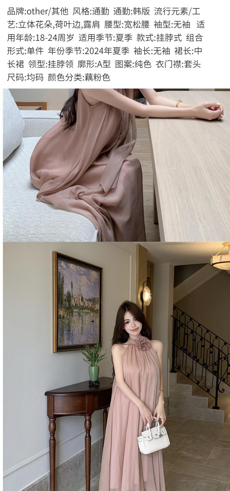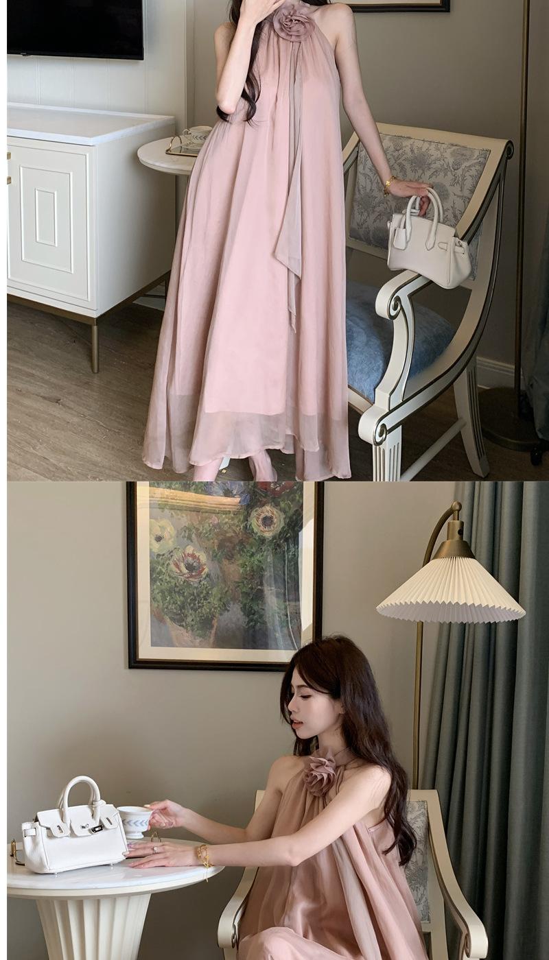 Vestido halter de malla con hombros descubiertos y flores de estilo suave para mujer, verano 2024, nuevo, rosa, falda larga holgada de corte A