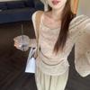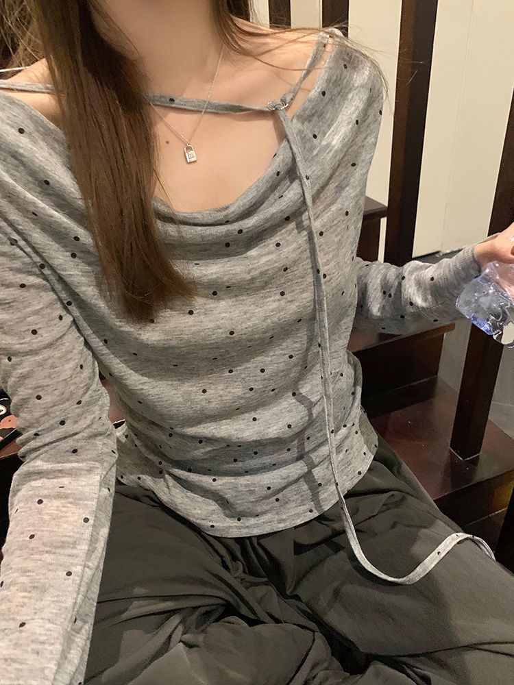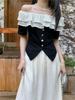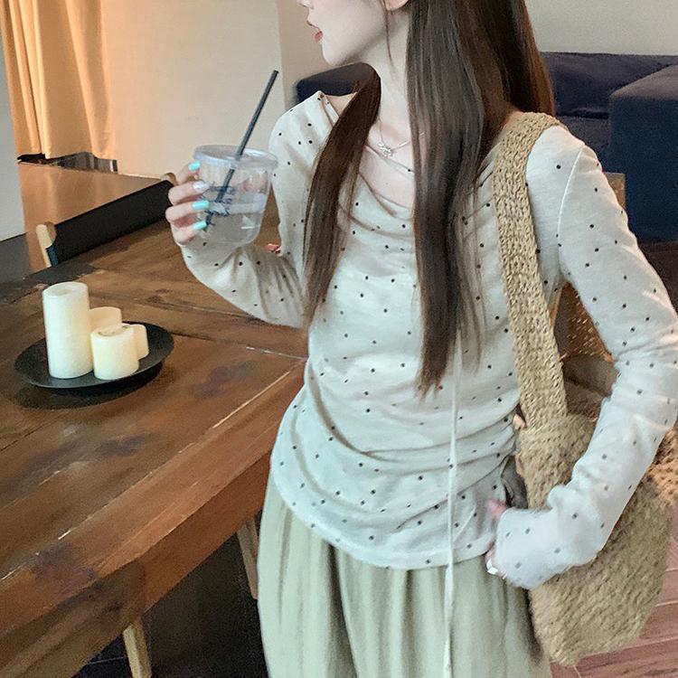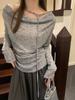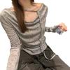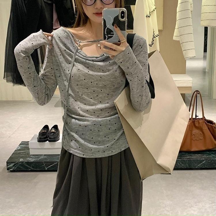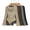 Spice Girls Deseo Puro Punto de Ola Cuello Swing con Cordones Camiseta Otoño para Mujer Plisado Irregular Ajustado Adelgazante Hombros Descubiertos Top