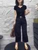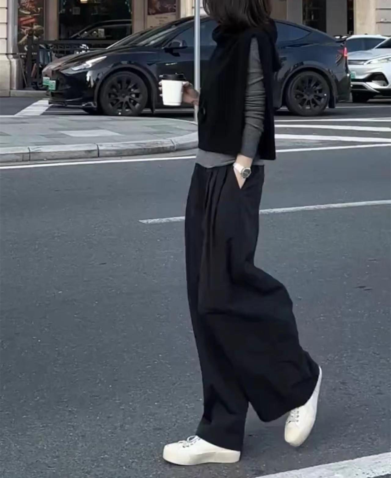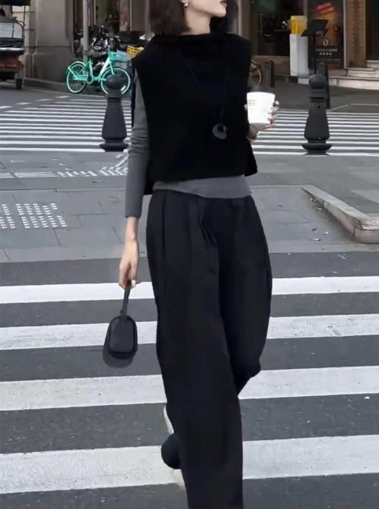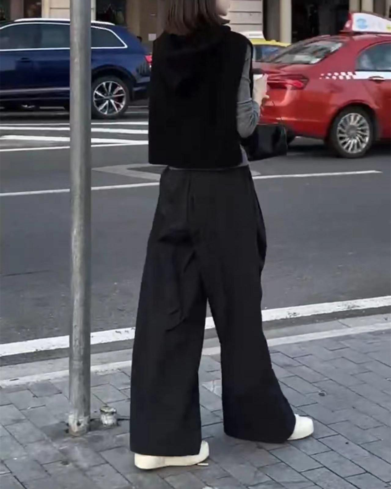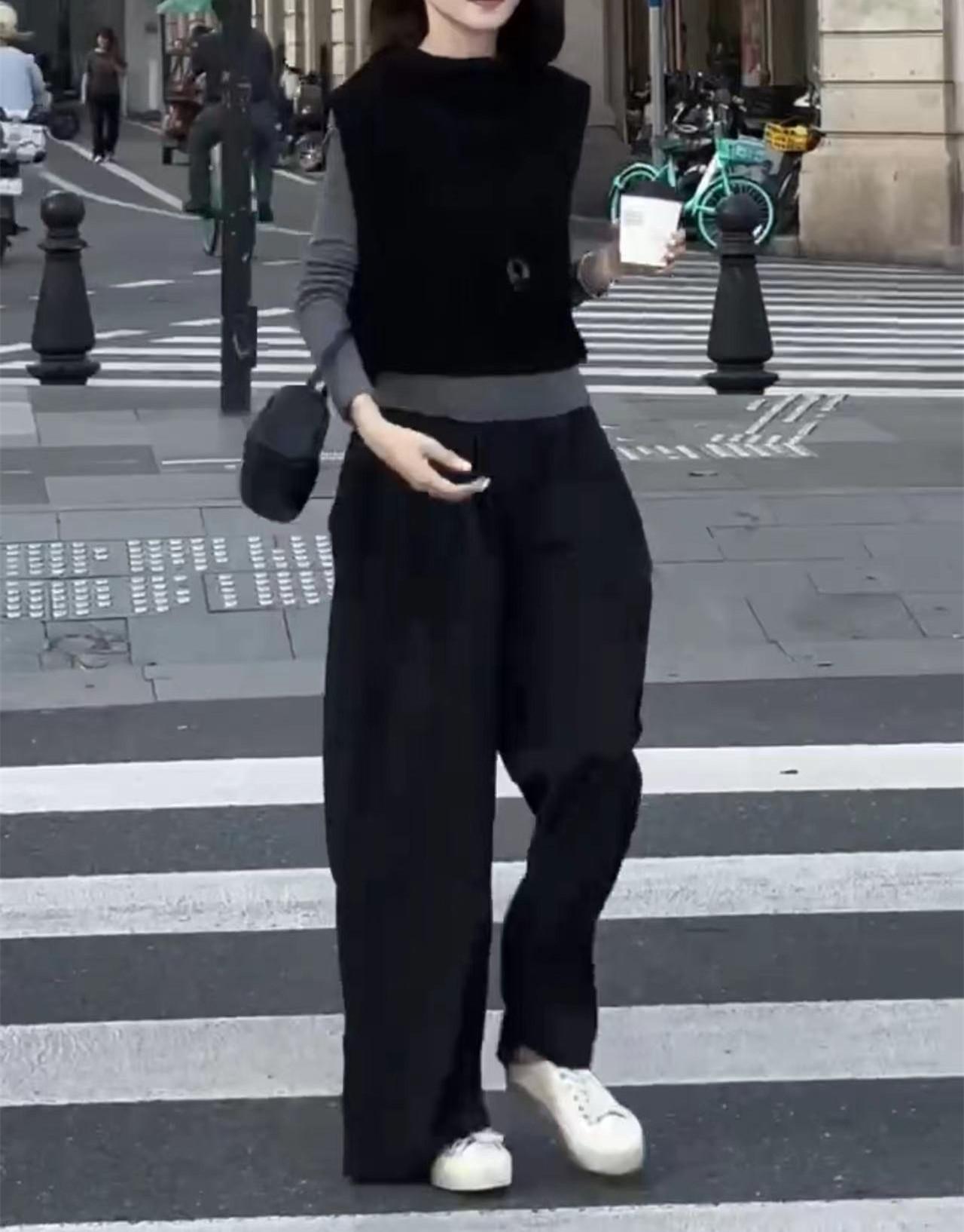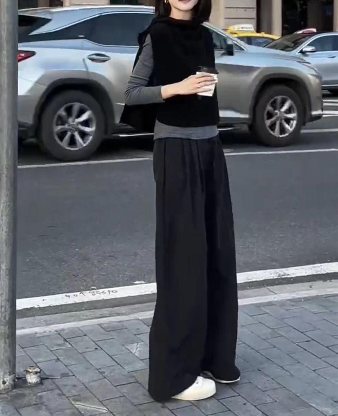 24972 Big Love Meiyuan Otoño 2025 Nuevo Estilo Relajado Chaleco Negro sin Mangas Pantalones Casuales de Cintura Alta para Mujer