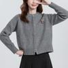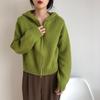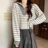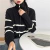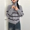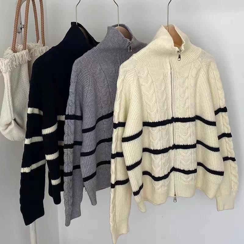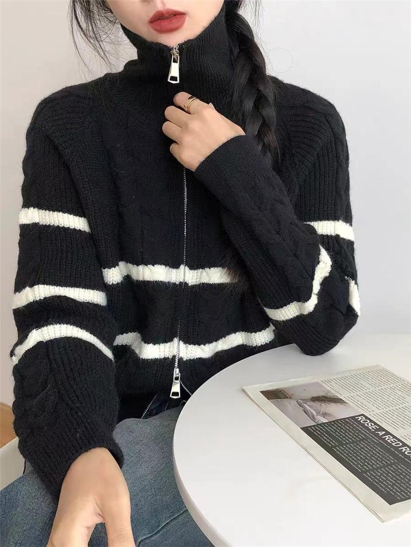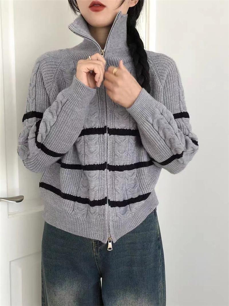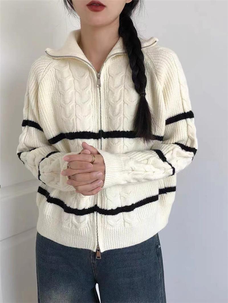 Abrigo de Mujer Suéter Rayado con Cuello Solapa y Doble Cremallera Otoño 2024 Nuevo Retro Holgado Cárdigan Tejido Top Ropa de Mujer