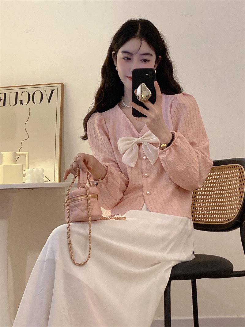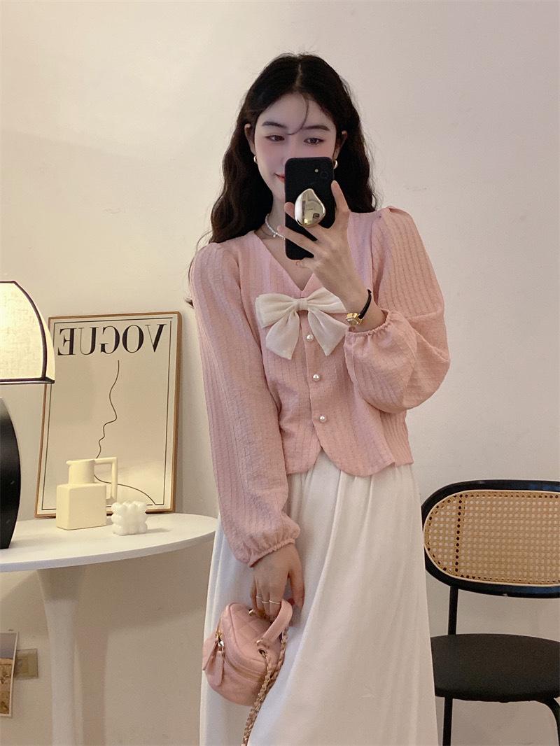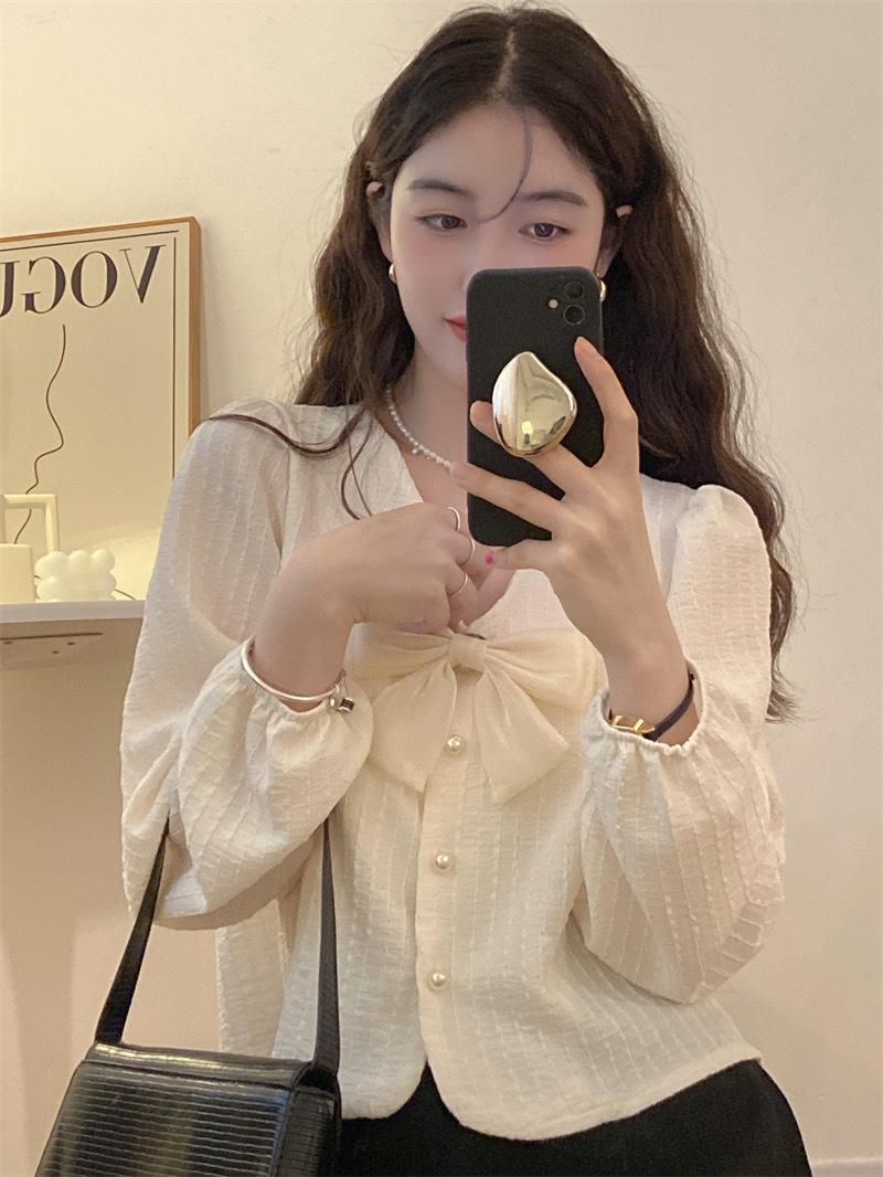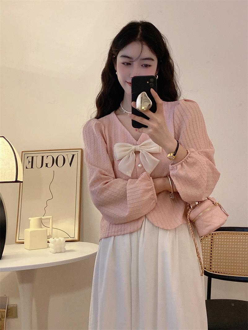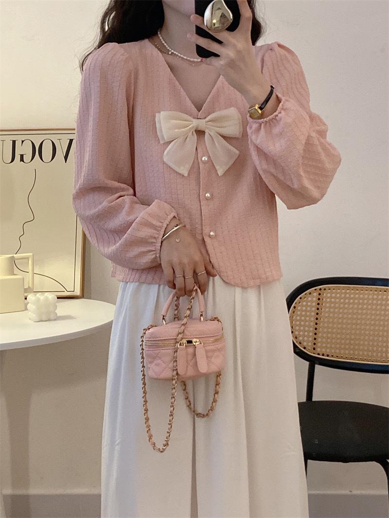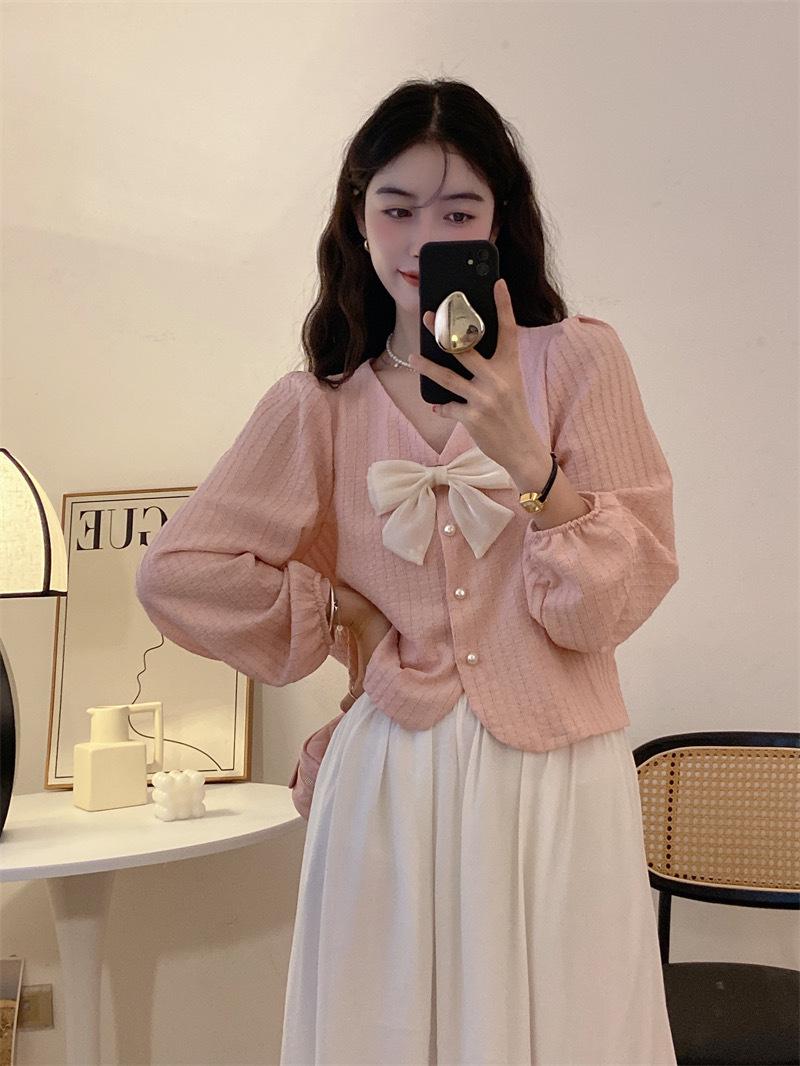 Cárdigan Dulce de Lazo con Cuello en V y Manga Larga Otoño Diseño de Estilo Coreano Costuras Manga Abullonada Holgado Corto Top para Mujer