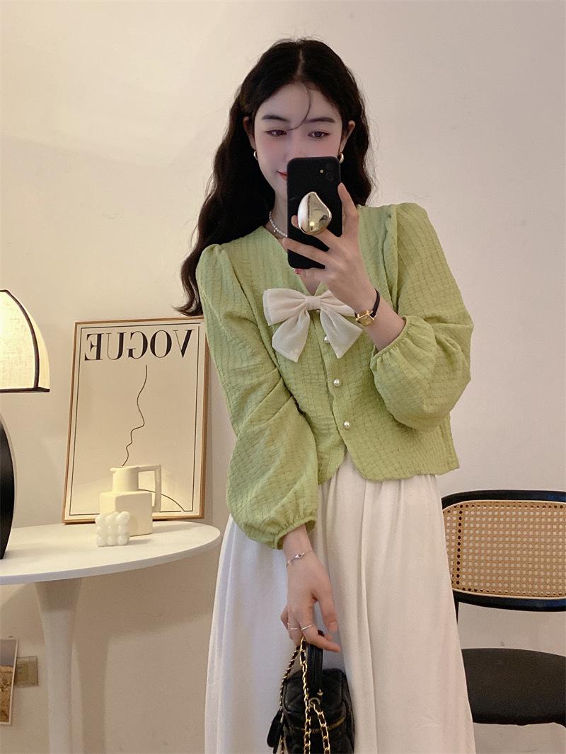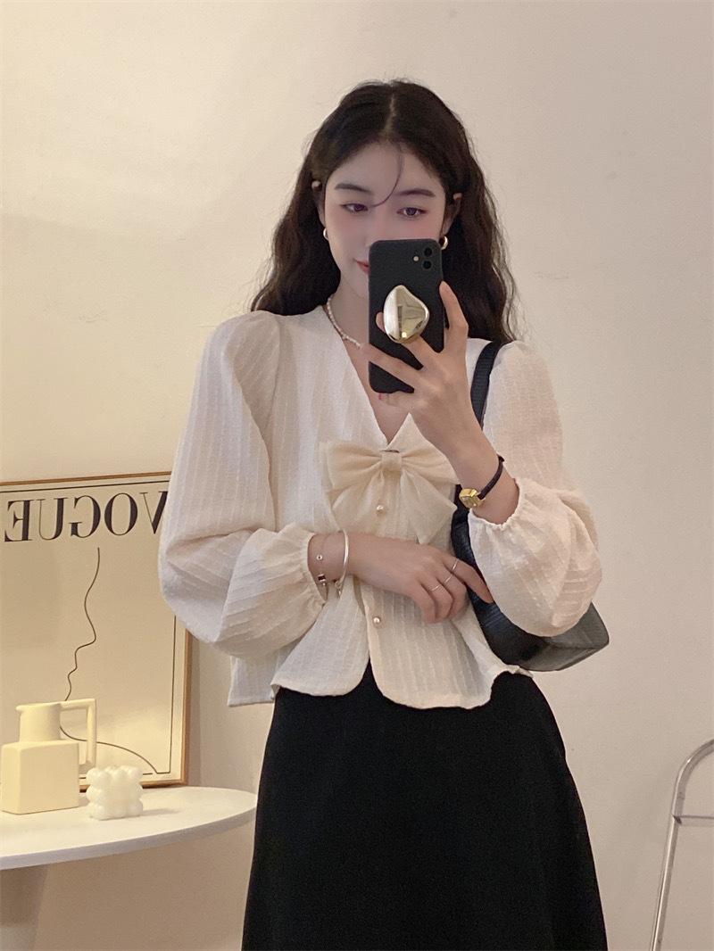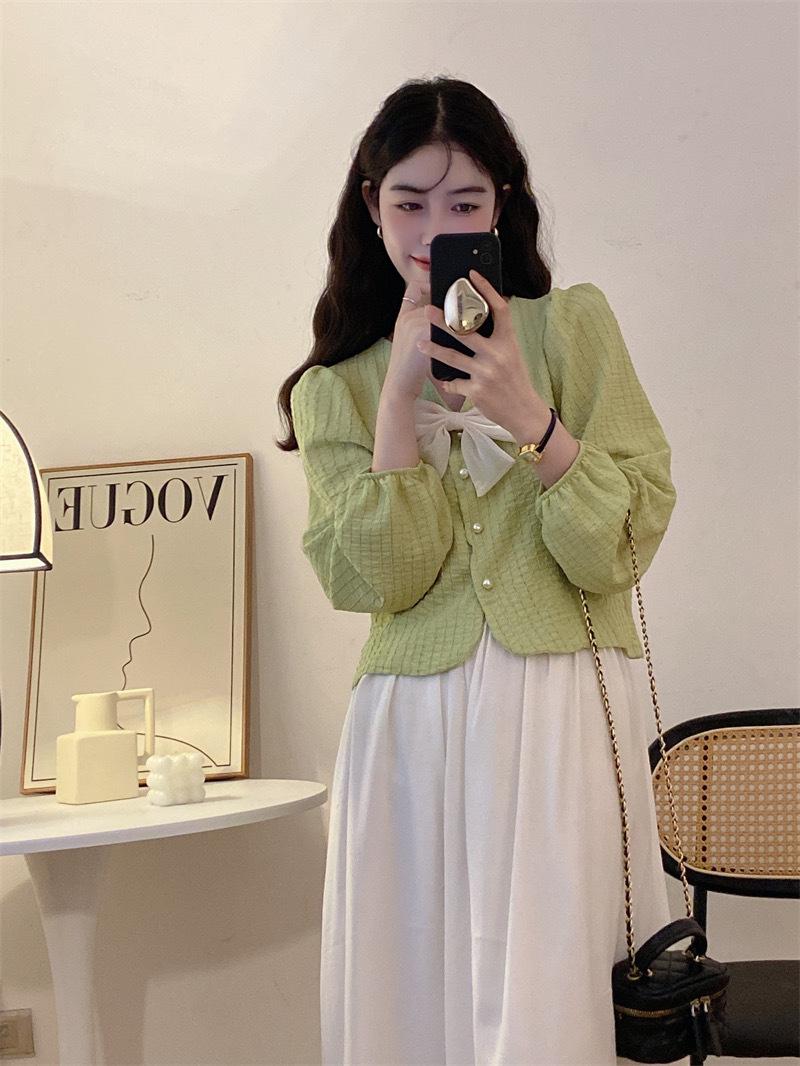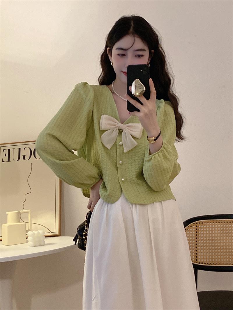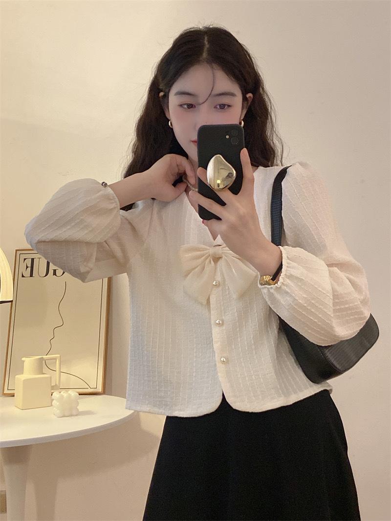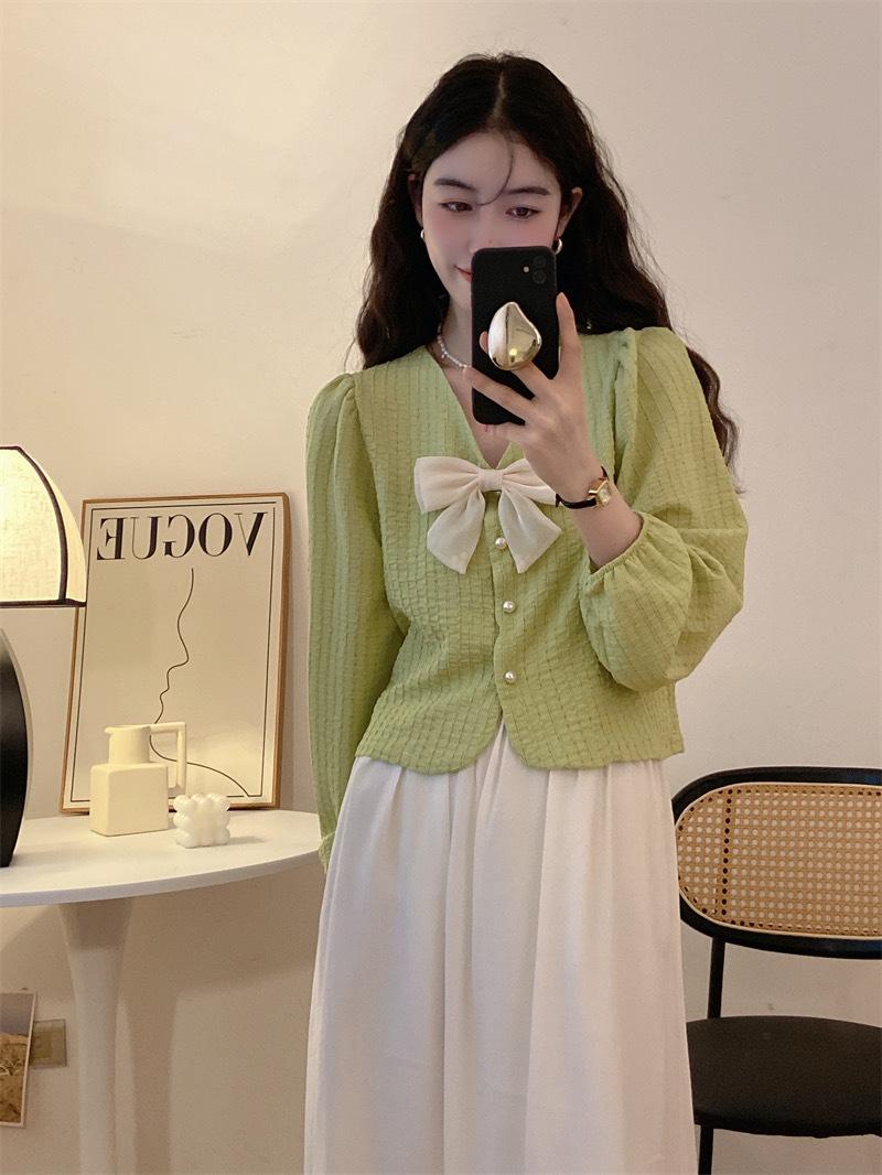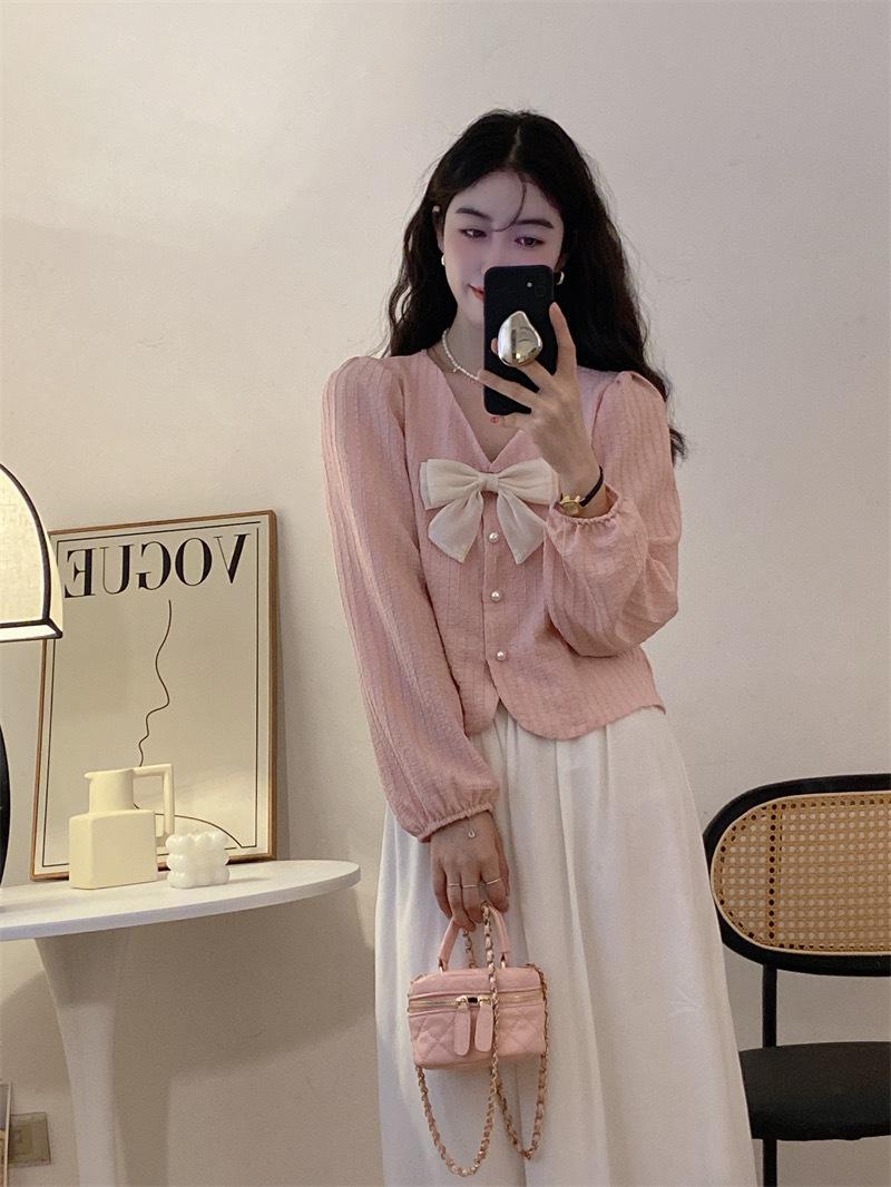 Cárdigan Dulce de Lazo con Cuello en V y Manga Larga Otoño Diseño de Estilo Coreano Costuras Manga Abullonada Holgado Corto Top para Mujer