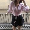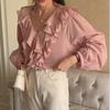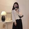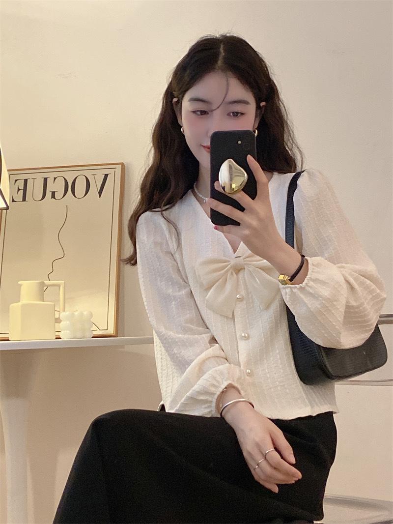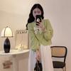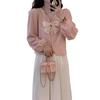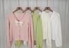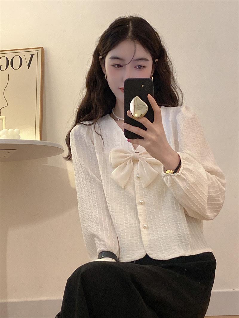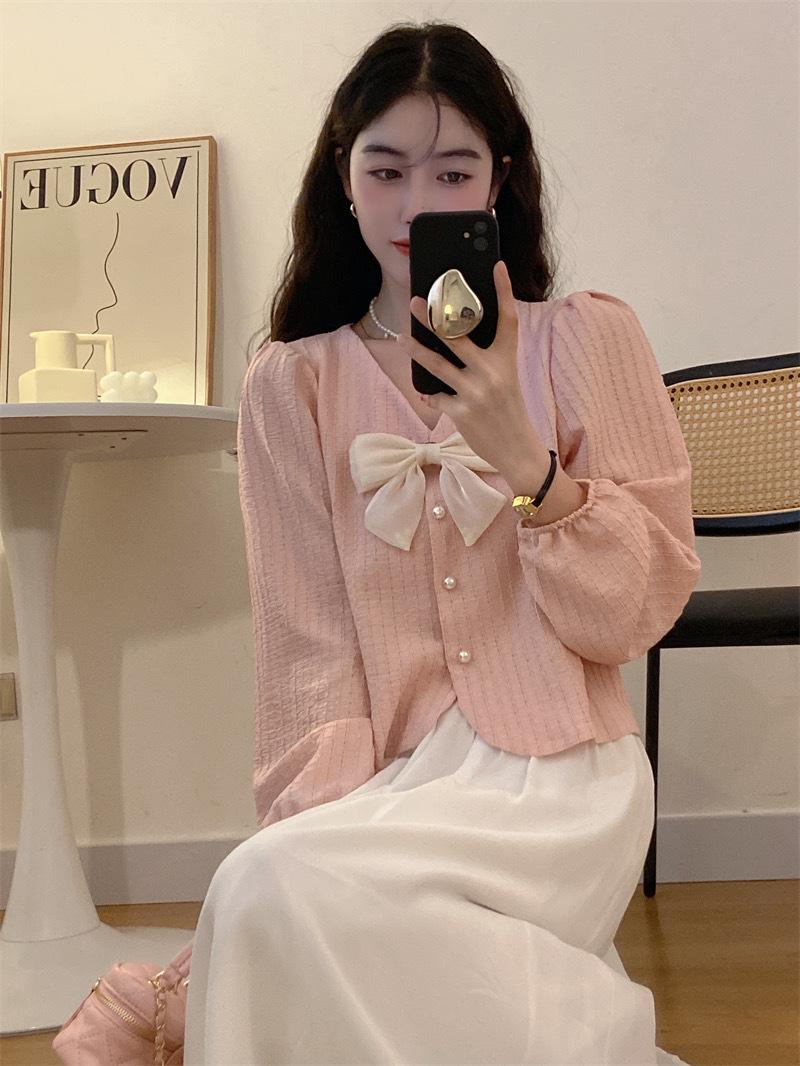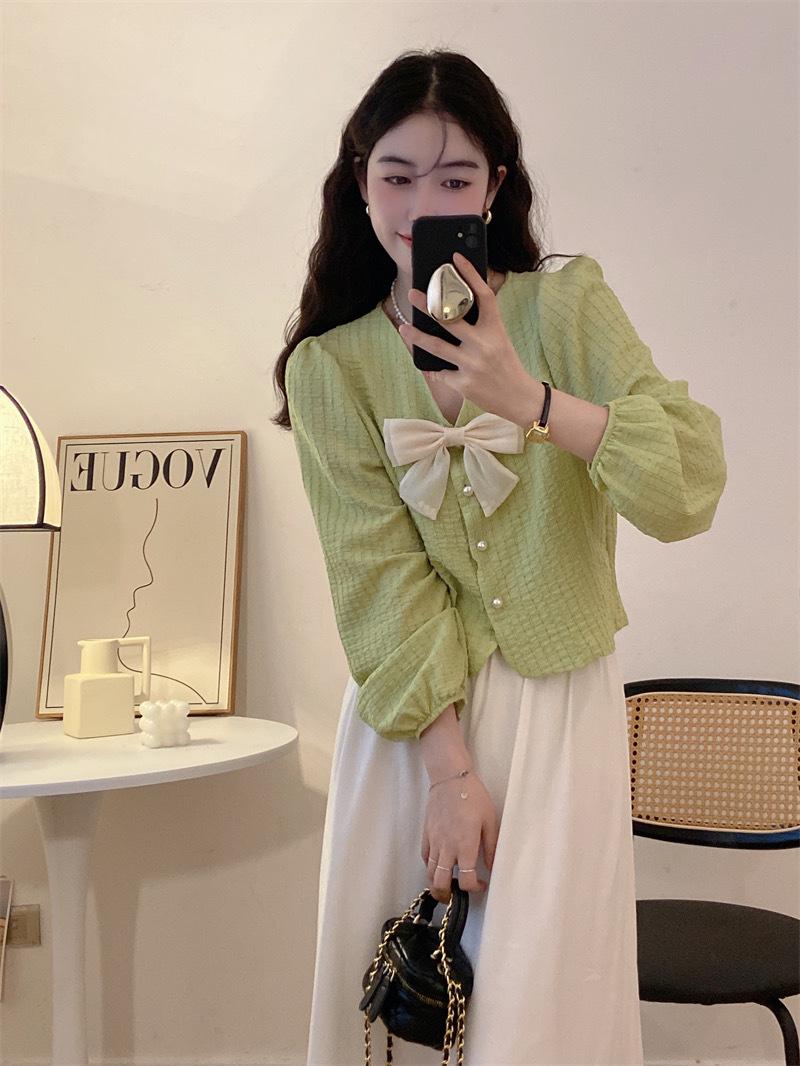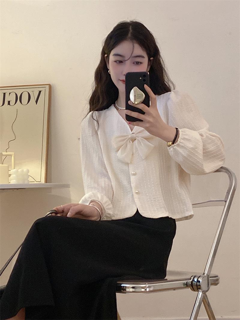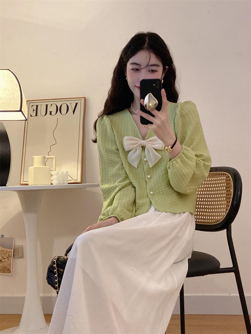 Cárdigan Dulce de Lazo con Cuello en V y Manga Larga Otoño Diseño de Estilo Coreano Costuras Manga Abullonada Holgado Corto Top para Mujer