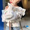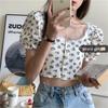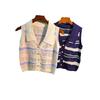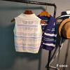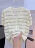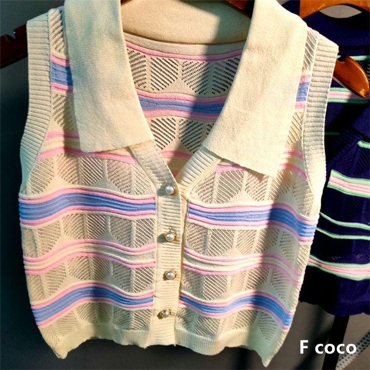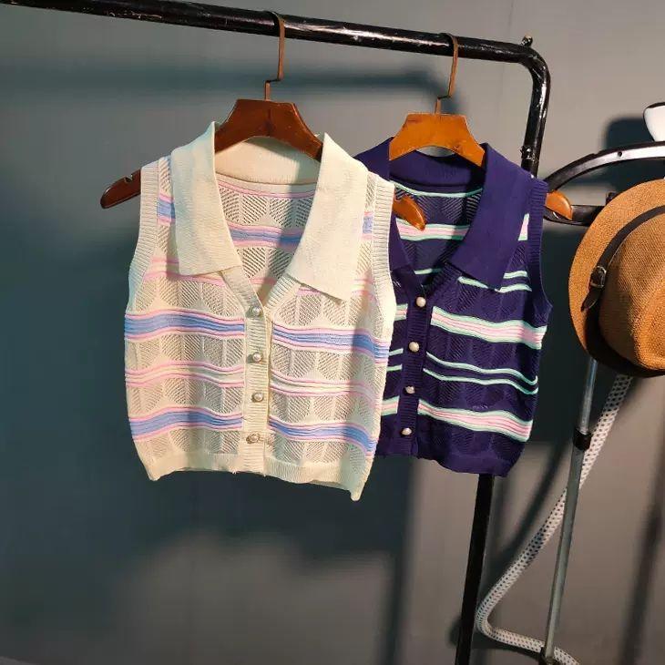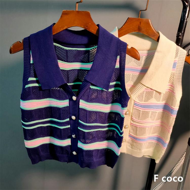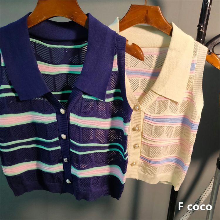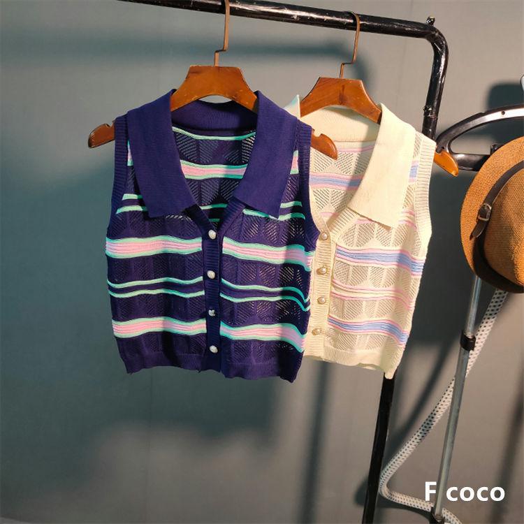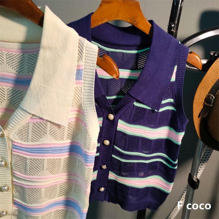 Chaleco de solapa a rayas de punto estilo francés para damas, nuevo estilo de verano, top corto ahuecado estilo coreano dulce que reduce la edad, de moda