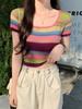 Gola quadrada ombro listrado de seda gelo malha de manga curta T-shirt das mulheres verão fino design curto doce e picante slim top