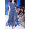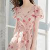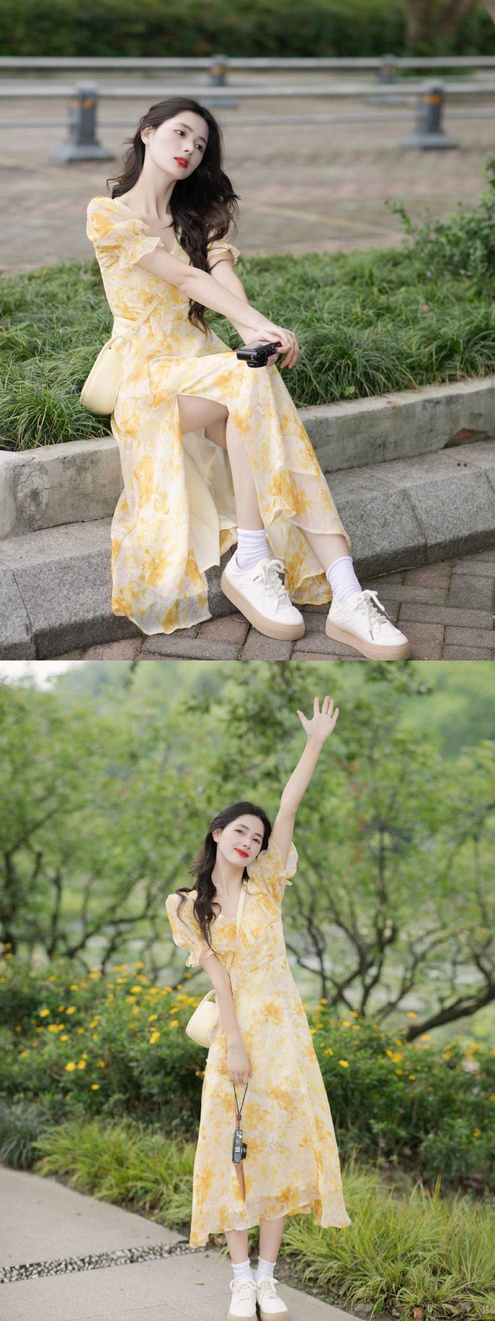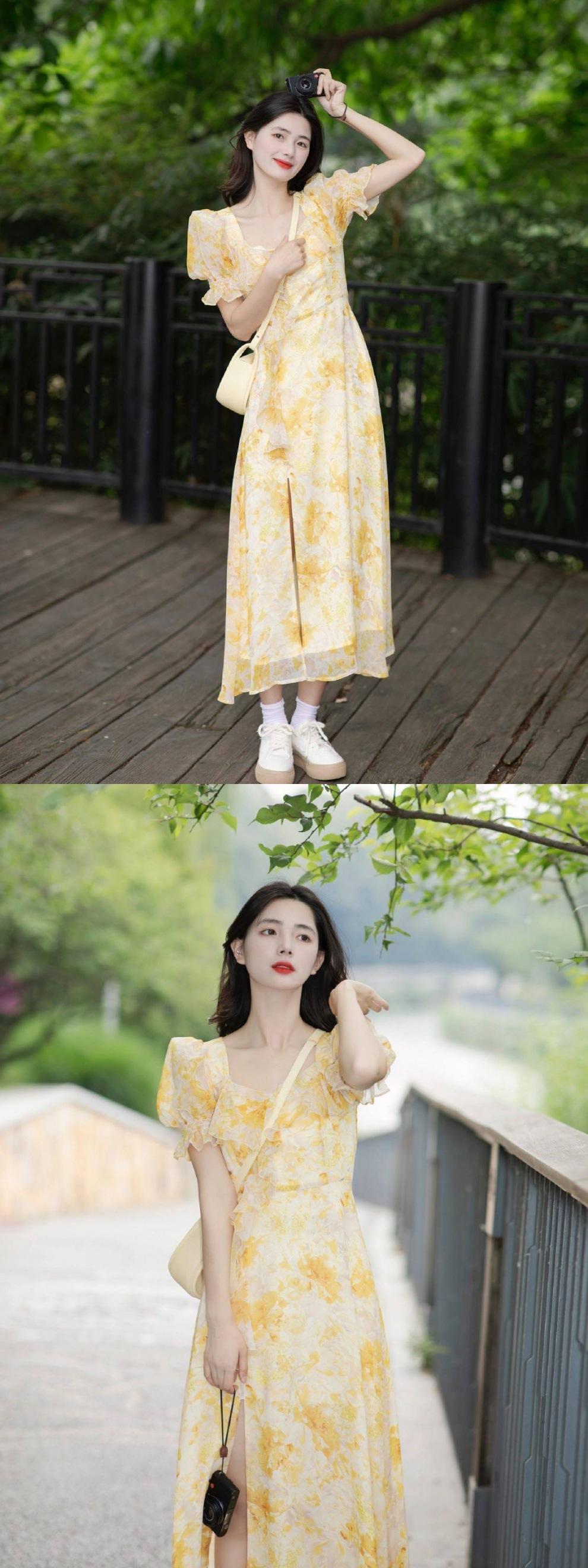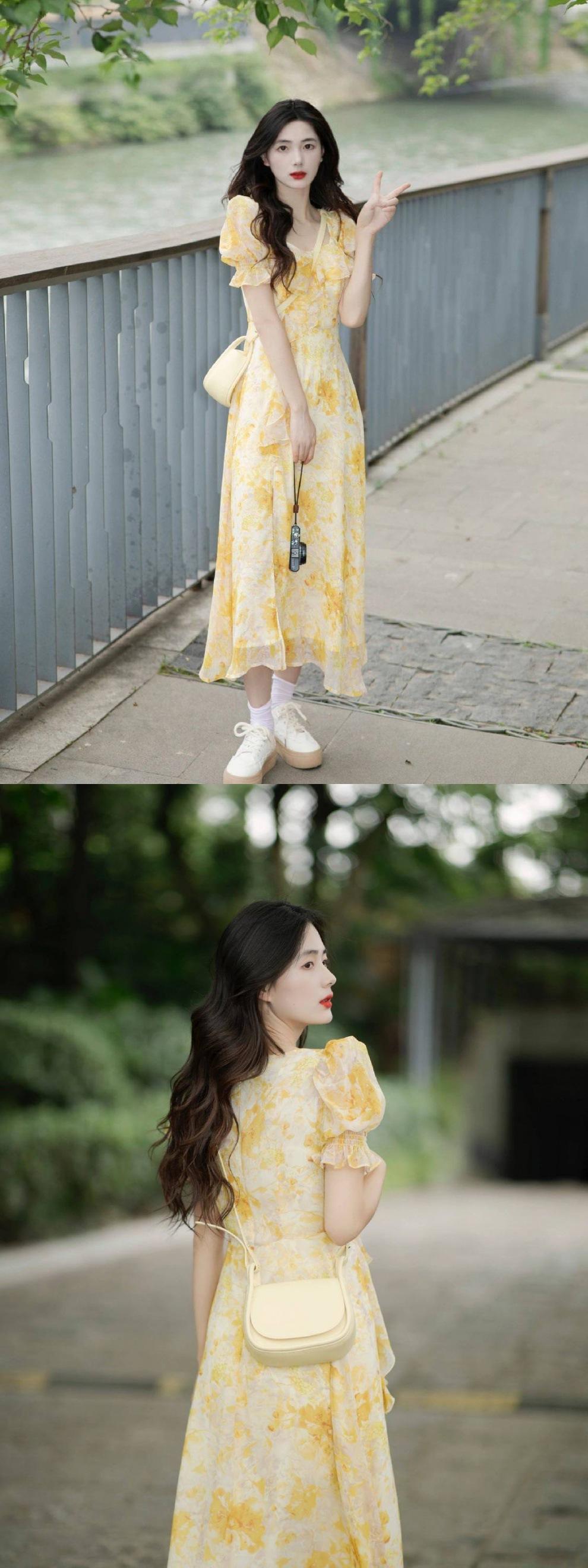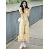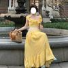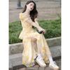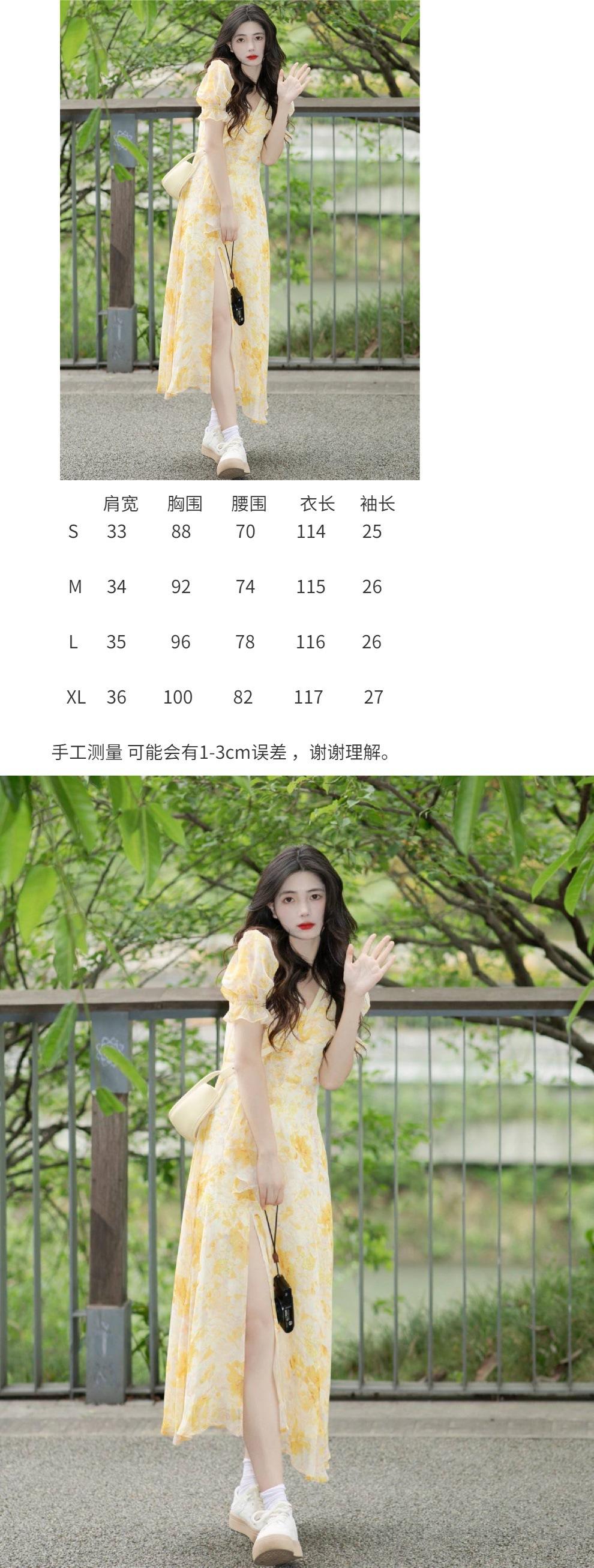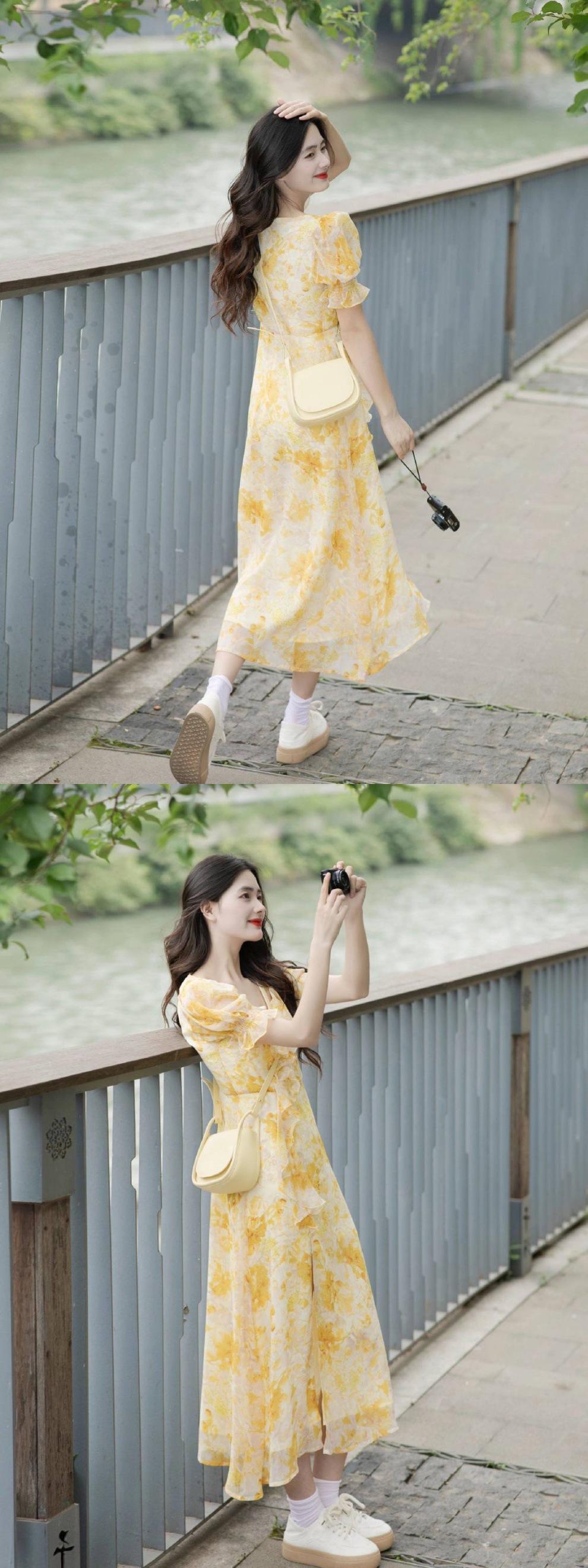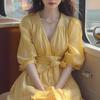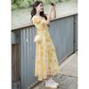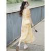 Vestido de gasa con estampado floral amarillo para mujer, estilo retro suave, estilo francés, con cintura alta y temperamento suave, para verano