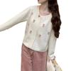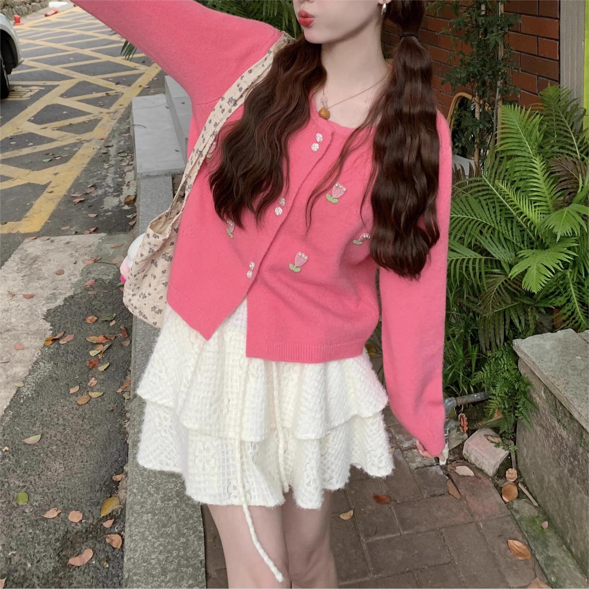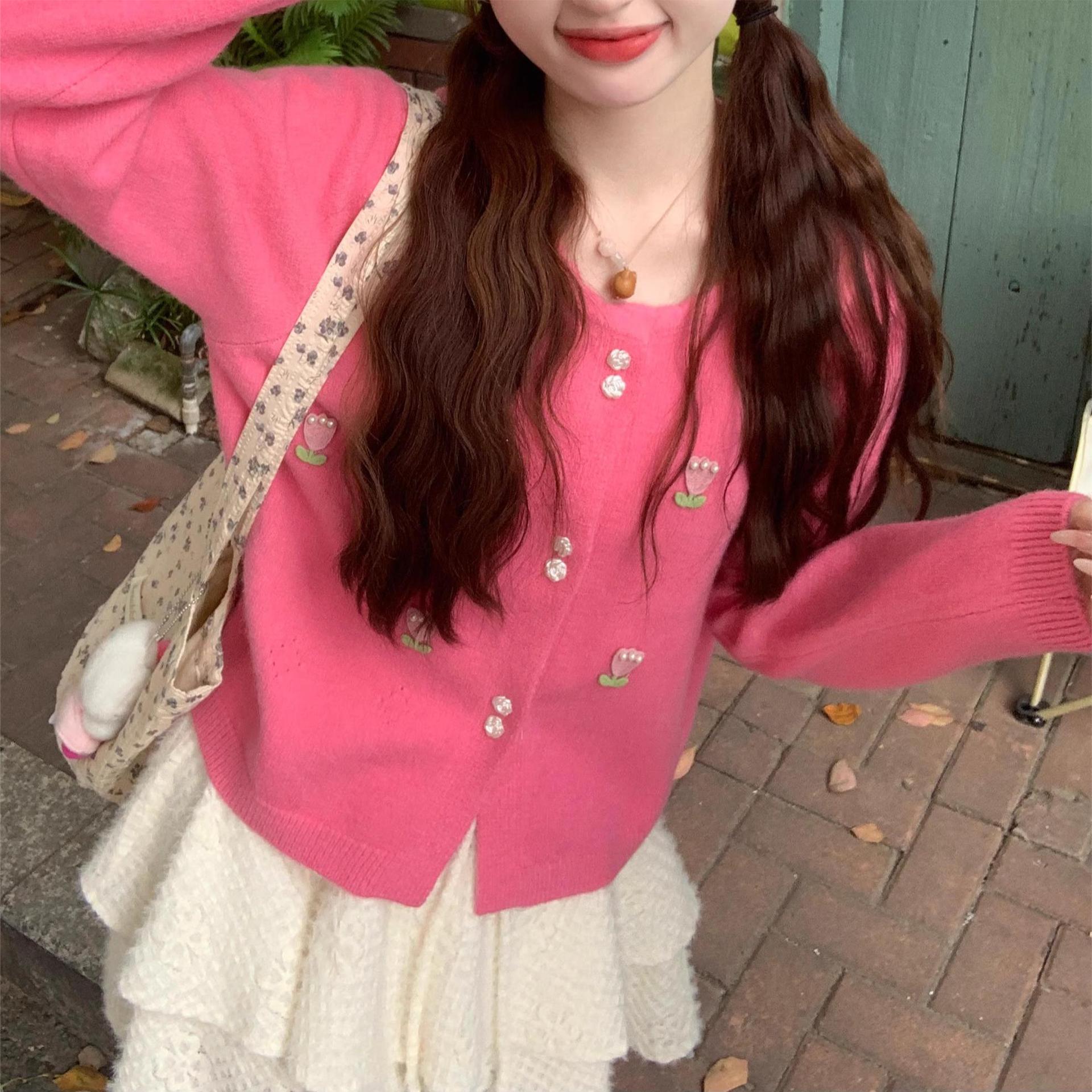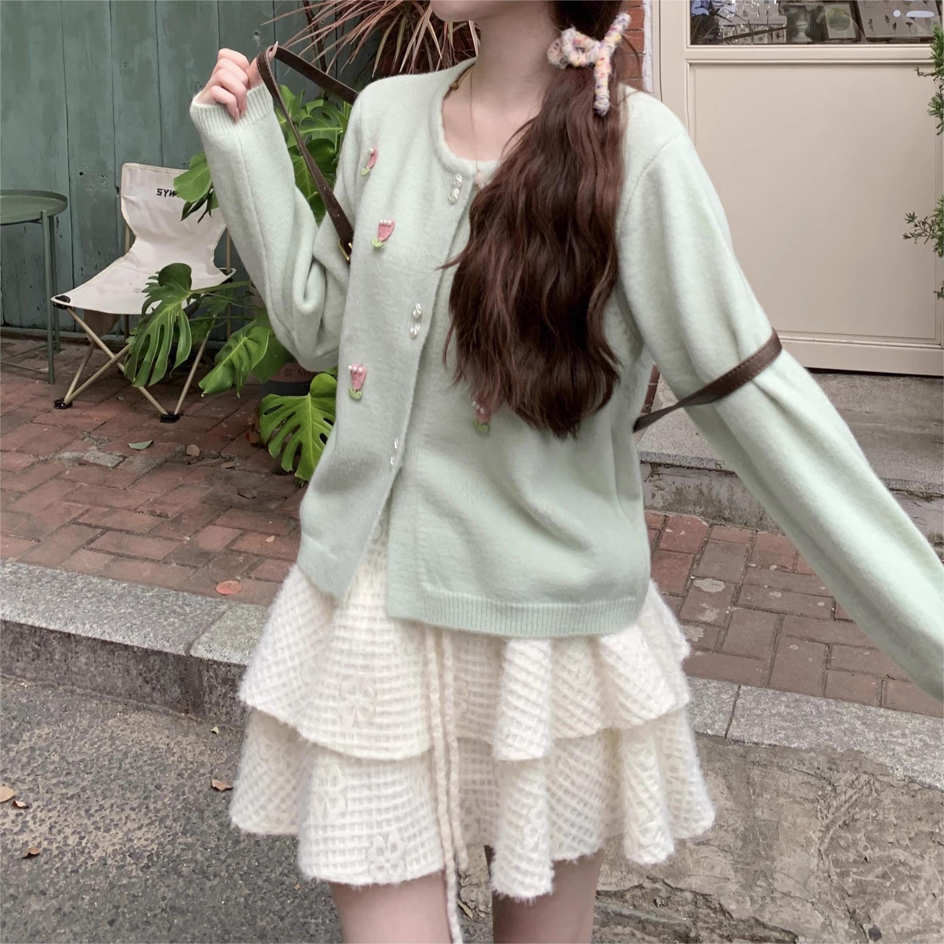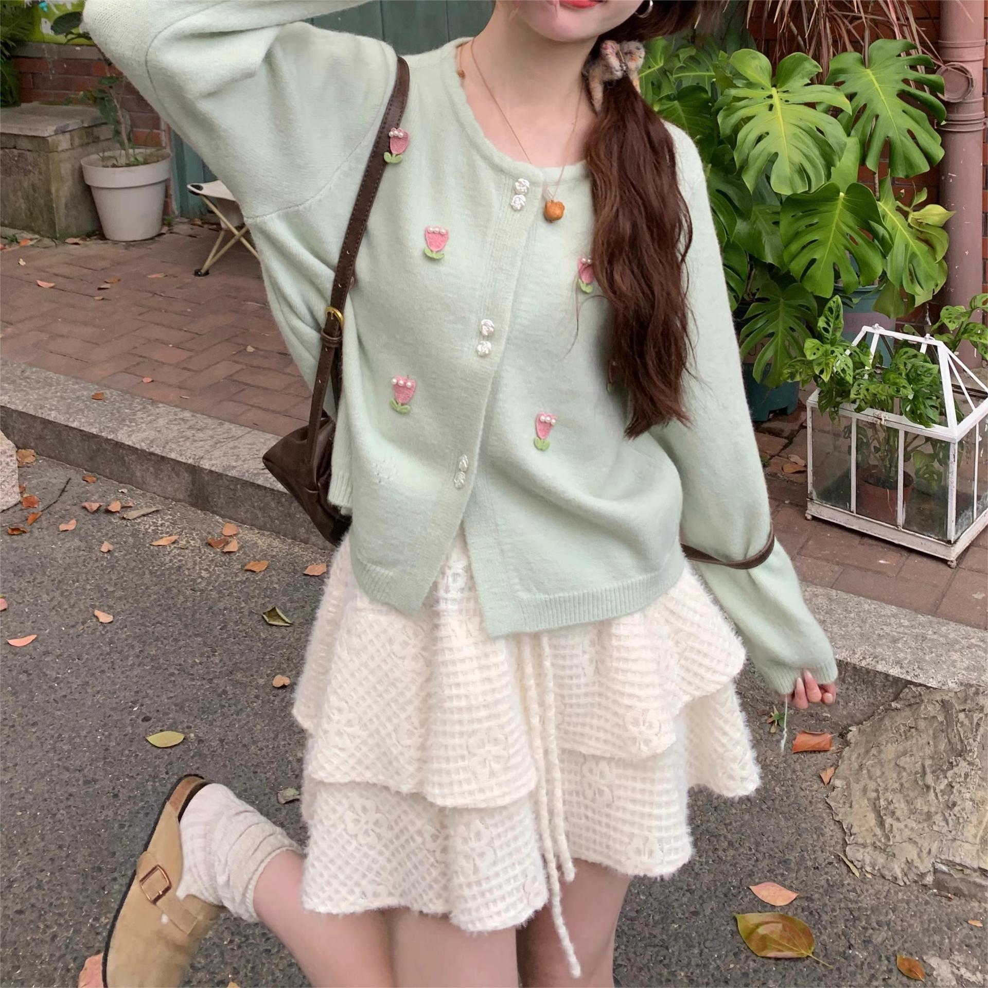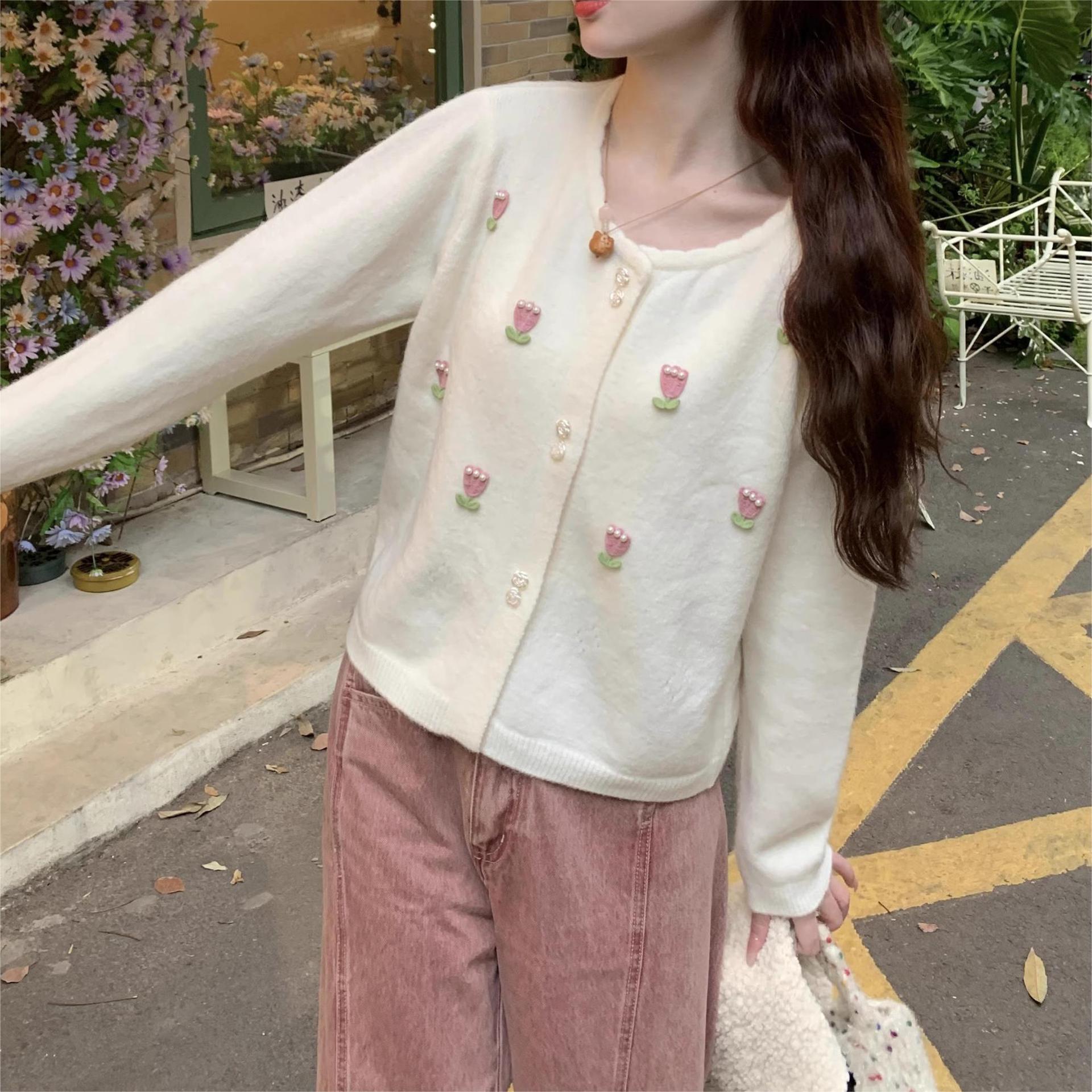 Cárdigan de punto de manga larga con cuello redondo y tulipán tridimensional para mujer, estilo coreano, nuevo otoño e invierno, estilo dulce y suave, suéter de punto para mujer