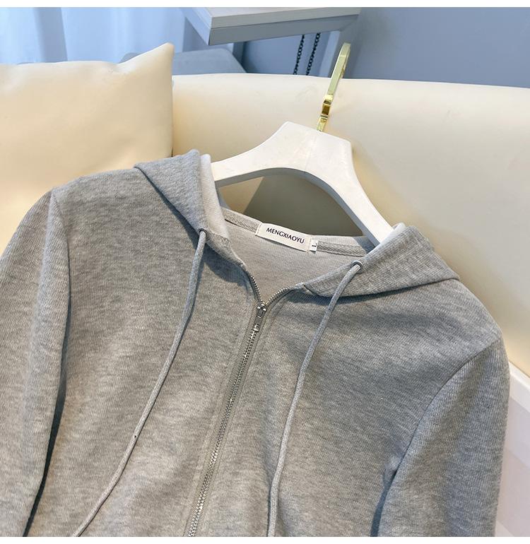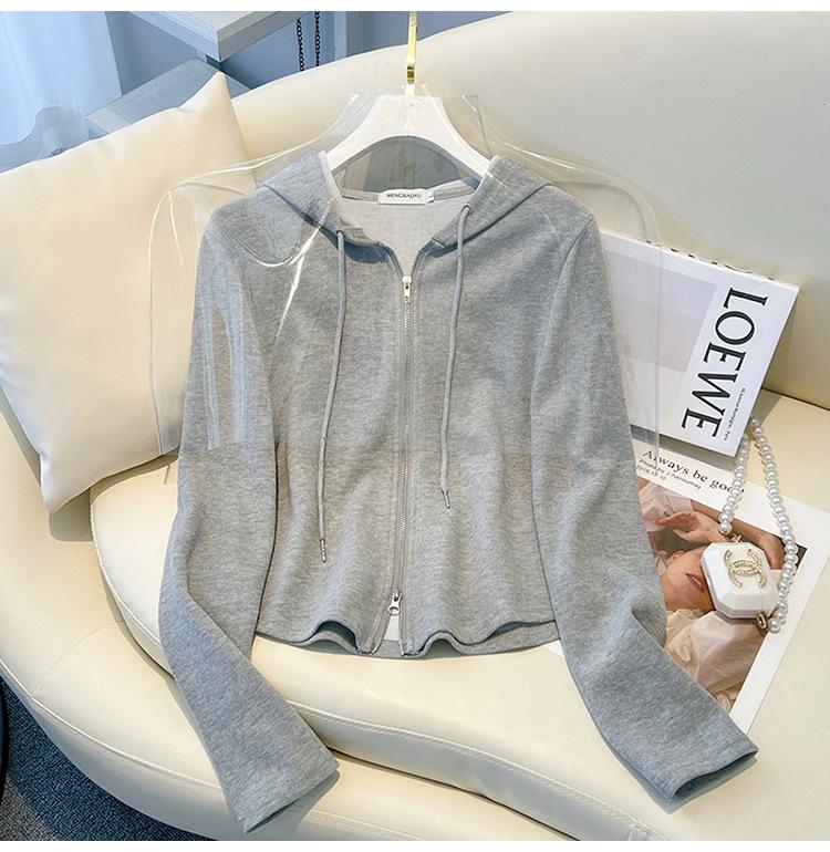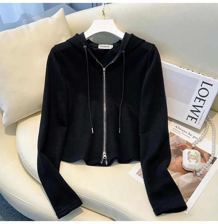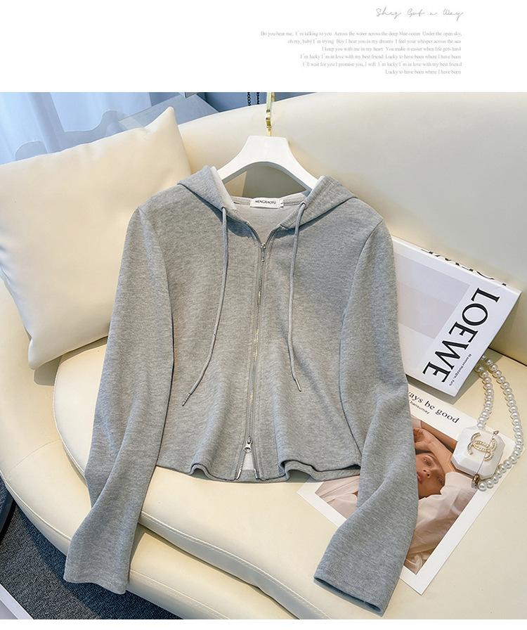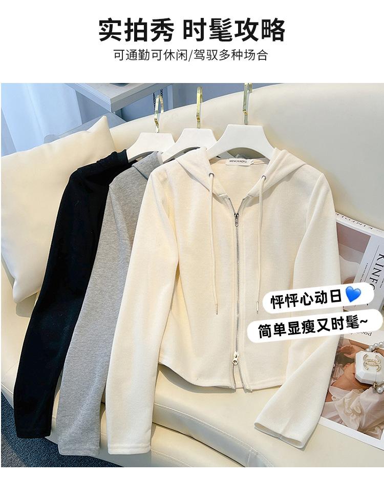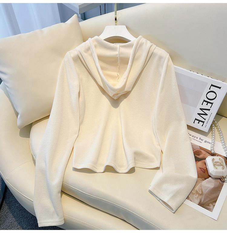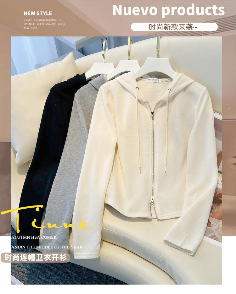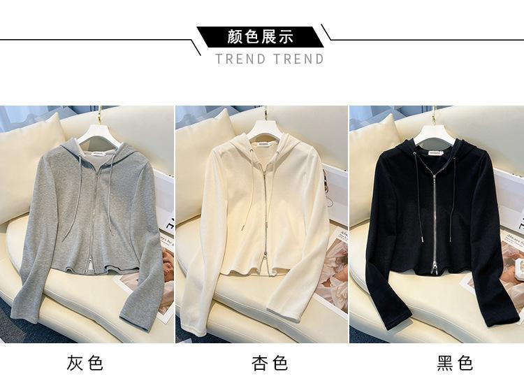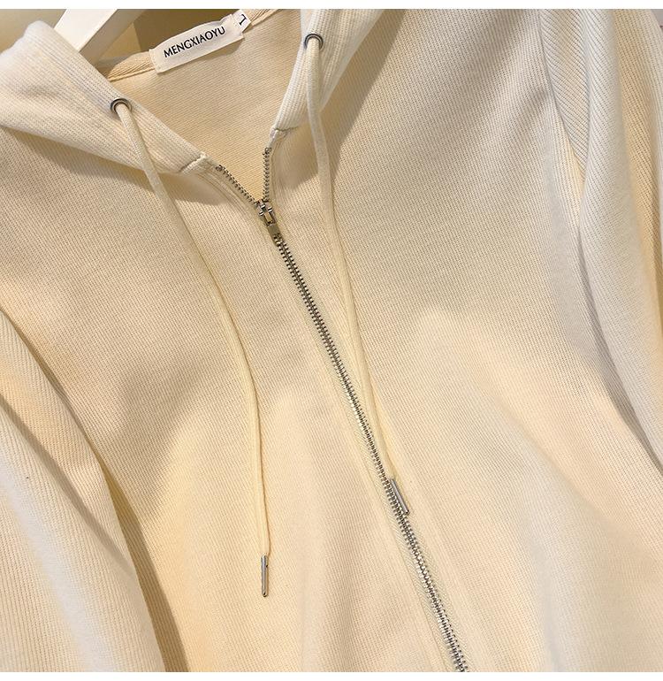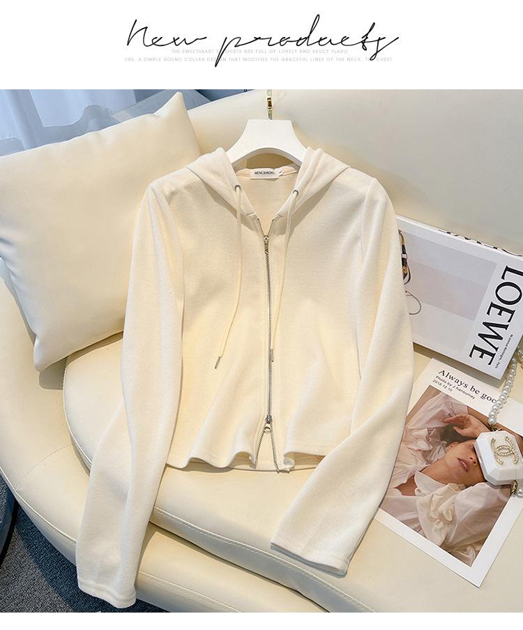 Albaricoque Suéter con Capucha de Doble Cremallera para Mujer Otoño Corto Casual Combinable Adelgazante Pequeño Cárdigan Chaqueta de Manga Larga